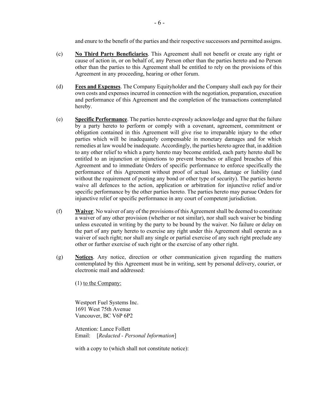 - 6 - and enure to the benefit of the parties and their respective successors and permitted assigns. (c) No Third Party Beneficiaries. This Agreement shall not benefit or create any right or cause of action in, or on behalf of, any Person other than the parties hereto and no Person other than the parties to this Agreement shall be entitled to rely on the provisions of this Agreement in any proceeding, hearing or other forum. (d) Fees and Expenses. The Company Equityholder and the Company shall each pay for their own costs and expenses incurred in connection with the negotiation, preparation, execution and performance of this Agreement and the completion of the transactions contemplated hereby. (e) Specific Performance. The parties hereto expressly acknowledge and agree that the failure by a party hereto to perform or comply with a covenant, agreement, commitment or obligation contained in this Agreement will give rise to irreparable injury to the other parties which will be inadequately compensable in monetary damages and for which remedies at law would be inadequate. Accordingly, the parties hereto agree that, in addition to any other relief to which a party hereto may become entitled, each party hereto shall be entitled to an injunction or injunctions to prevent breaches or alleged breaches of this Agreement and to immediate Orders of specific performance to enforce specifically the performance of this Agreement without proof of actual loss, damage or liability (and without the requirement of posting any bond or other type of security). The parties hereto waive all defences to the action, application or arbitration for injunctive relief and/or specific performance by the other parties hereto. The parties hereto may pursue Orders for injunctive relief or specific performance in any court of competent jurisdiction. (f) Waiver. No waiver of any of the provisions of this Agreement shall be deemed to constitute a waiver of any other provision (whether or not similar), nor shall such waiver be binding unless executed in writing by the party to be bound by the waiver. No failure or delay on the part of any party hereto to exercise any right under this Agreement shall operate as a waiver of such right; nor shall any single or partial exercise of any such right preclude any other or further exercise of such right or the exercise of any other right. (g) Notices. Any notice, direction or other communication given regarding the matters contemplated by this Agreement must be in writing, sent by personal delivery, courier, or electronic mail and addressed: (1) to the Company: Westport Fuel Systems Inc. 1691 West 75th Avenue Vancouver, BC V6P 6P2 Attention: Lance Follett Email: [Redacted - Personal Information] with a copy to (which shall not constitute notice):