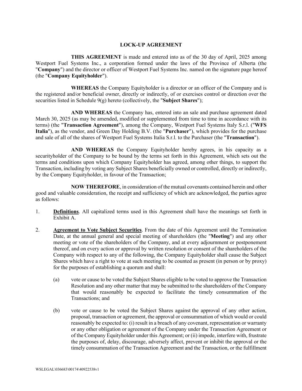WSLEGAL\036683\00174\40922633v1 LOCK-UP AGREEMENT THIS AGREEMENT is made and entered into as of the 29th day of April, 2025 among Westport Fuel Systems Inc., a corporation formed under the laws of the Province of Alberta (the "Company") and the director or officer of Westport Fuel Systems Inc. named on the signature page hereof (the "Company Equityholder"). WHEREAS the Company Equityholder is a director or an officer of the Company and is the registered and/or beneficial owner, directly or indirectly, of or exercises control or direction over the securities listed in Schedule 9(g) hereto (collectively, the "Subject Shares"); AND WHEREAS the Company has, entered into an sale and purchase agreement dated March 30, 2025 (as may be amended, modified or supplemented from time to time in accordance with its terms) (the "Transaction Agreement"), among the Company, Westport Fuel Systems Italy S.r.l. ("WFS Italia"), as the vendor, and Green Day Holding B.V. (the "Purchaser"), which provides for the purchase and sale of all of the shares of Westport Fuel Systems Italia S.r.l. to the Purchaser (the "Transaction"). AND WHEREAS the Company Equityholder hereby agrees, in his capacity as a securityholder of the Company to be bound by the terms set forth in this Agreement, which sets out the terms and conditions upon which Company Equityholder has agreed, among other things, to support the Transaction, including by voting any Subject Shares beneficially owned or controlled, directly or indirectly, by the Company Equityholder, in favour of the Transaction; NOW THEREFORE, in consideration of the mutual covenants contained herein and other good and valuable consideration, the receipt and sufficiency of which are acknowledged, the parties agree as follows: 1. Definitions. All capitalized terms used in this Agreement shall have the meanings set forth in Exhibit A. 2. Agreement to Vote Subject Securities. From the date of this Agreement until the Termination Date, at the annual general and special meeting of shareholders (the "Meeting") and any other meeting or vote of the shareholders of the Company, and at every adjournment or postponement thereof, and on every action or approval by written resolution or consent of the shareholders of the Company with respect to any of the following, the Company Equityholder shall cause the Subject Shares which have a right to vote at such meeting to be counted as present (in person or by proxy) for the purposes of establishing a quorum and shall: (a) vote or cause to be voted the Subject Shares eligible to be voted to approve the Transaction Resolution and any other matter that may be submitted to the shareholders of the Company that would reasonably be expected to facilitate the timely consummation of the Transactions; and (b) vote or cause to be voted the Subject Shares against the approval of any other action, proposal, transaction or agreement, the approval or consummation of which would or could reasonably be expected to: (i) result in a breach of any covenant, representation or warranty or any other obligation or agreement of the Company under the Transaction Agreement or of the Company Equityholder under this Agreement; or (ii) impede, interfere with, frustrate the purposes of, delay, discourage, adversely affect, prevent or inhibit the approval or the timely consummation of the Transaction Agreement and the Transaction, or the fulfillment
