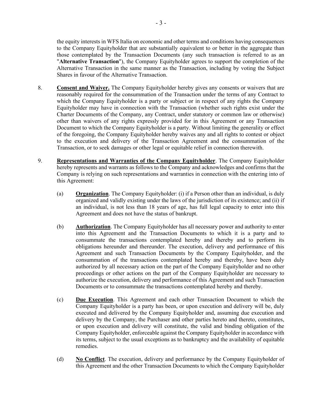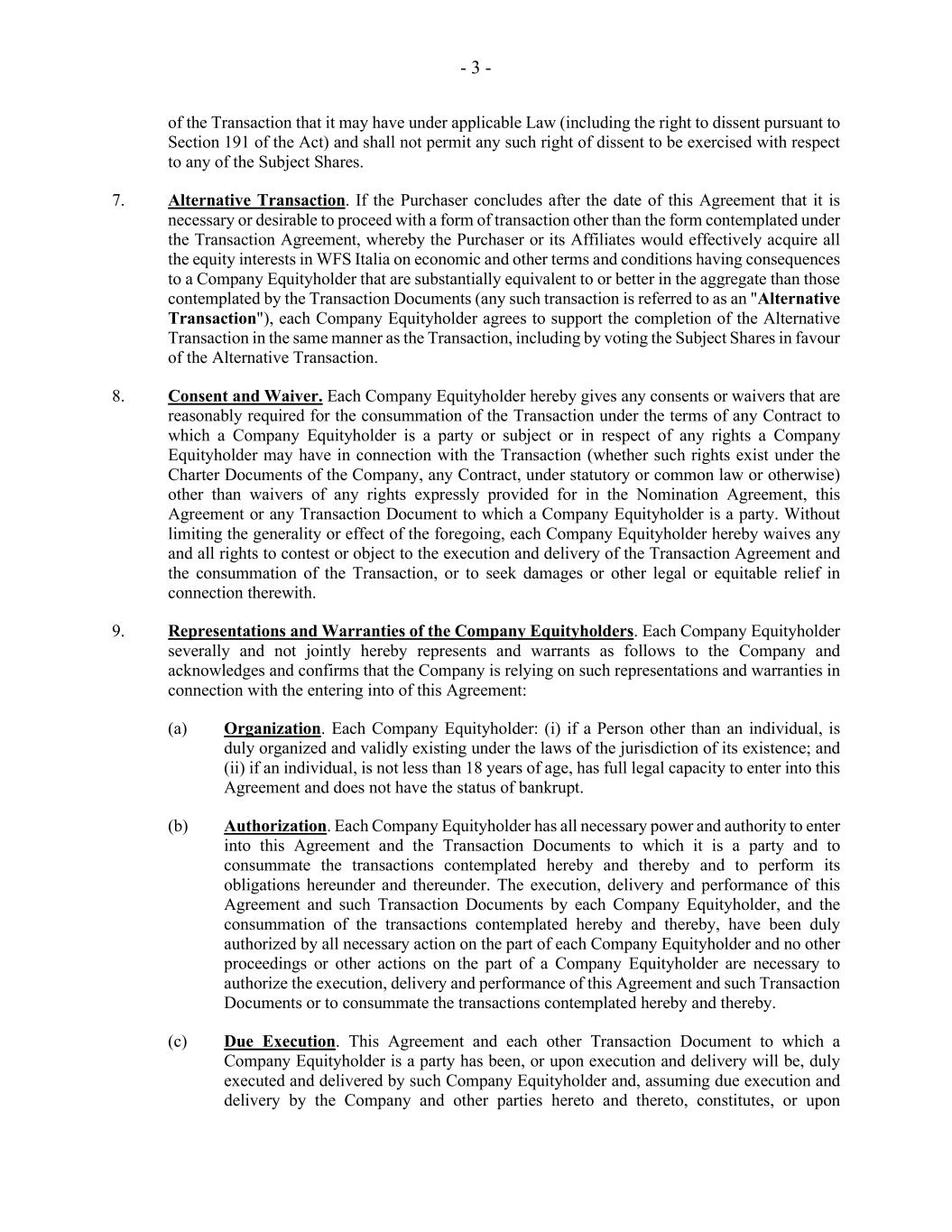 - 3 - of the Transaction that it may have under applicable Law (including the right to dissent pursuant to Section 191 of the Act) and shall not permit any such right of dissent to be exercised with respect to any of the Subject Shares. 7. Alternative Transaction. If the Purchaser concludes after the date of this Agreement that it is necessary or desirable to proceed with a form of transaction other than the form contemplated under the Transaction Agreement, whereby the Purchaser or its Affiliates would effectively acquire all the equity interests in WFS Italia on economic and other terms and conditions having consequences to a Company Equityholder that are substantially equivalent to or better in the aggregate than those contemplated by the Transaction Documents (any such transaction is referred to as an "Alternative Transaction"), each Company Equityholder agrees to support the completion of the Alternative Transaction in the same manner as the Transaction, including by voting the Subject Shares in favour of the Alternative Transaction. 8. Consent and Waiver. Each Company Equityholder hereby gives any consents or waivers that are reasonably required for the consummation of the Transaction under the terms of any Contract to which a Company Equityholder is a party or subject or in respect of any rights a Company Equityholder may have in connection with the Transaction (whether such rights exist under the Charter Documents of the Company, any Contract, under statutory or common law or otherwise) other than waivers of any rights expressly provided for in the Nomination Agreement, this Agreement or any Transaction Document to which a Company Equityholder is a party. Without limiting the generality or effect of the foregoing, each Company Equityholder hereby waives any and all rights to contest or object to the execution and delivery of the Transaction Agreement and the consummation of the Transaction, or to seek damages or other legal or equitable relief in connection therewith. 9. Representations and Warranties of the Company Equityholders. Each Company Equityholder severally and not jointly hereby represents and warrants as follows to the Company and acknowledges and confirms that the Company is relying on such representations and warranties in connection with the entering into of this Agreement: (a) Organization. Each Company Equityholder: (i) if a Person other than an individual, is duly organized and validly existing under the laws of the jurisdiction of its existence; and (ii) if an individual, is not less than 18 years of age, has full legal capacity to enter into this Agreement and does not have the status of bankrupt. (b) Authorization. Each Company Equityholder has all necessary power and authority to enter into this Agreement and the Transaction Documents to which it is a party and to consummate the transactions contemplated hereby and thereby and to perform its obligations hereunder and thereunder. The execution, delivery and performance of this Agreement and such Transaction Documents by each Company Equityholder, and the consummation of the transactions contemplated hereby and thereby, have been duly authorized by all necessary action on the part of each Company Equityholder and no other proceedings or other actions on the part of a Company Equityholder are necessary to authorize the execution, delivery and performance of this Agreement and such Transaction Documents or to consummate the transactions contemplated hereby and thereby. (c) Due Execution. This Agreement and each other Transaction Document to which a Company Equityholder is a party has been, or upon execution and delivery will be, duly executed and delivered by such Company Equityholder and, assuming due execution and delivery by the Company and other parties hereto and thereto, constitutes, or upon