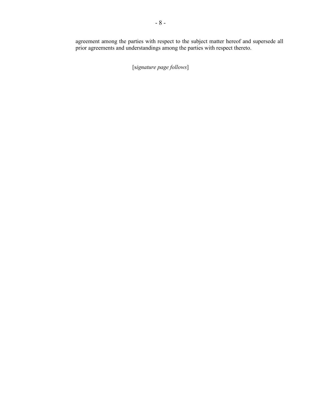 - 8 - agreement among the parties with respect to the subject matter hereof and supersede all prior agreements and understandings among the parties with respect thereto. [signature page follows]