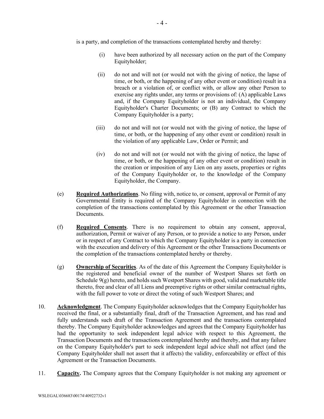 WSLEGAL\036683\00174\40922694v1 - 4 - is a party, and completion of the transactions contemplated hereby and thereby: (i) have been authorized by all necessary action on the part of the Company Equityholder; (ii) do not and will not (or would not with the giving of notice, the lapse of time, or both, or the happening of any other event or condition) result in a breach or a violation of, or conflict with, or allow any other Person to exercise any rights under, any terms or provisions of: (A) applicable Laws and, if the Company Equityholder is not an individual, the Company Equityholder's Charter Documents; or (B) any Contract to which the Company Equityholder is a party; (iii) do not and will not (or would not with the giving of notice, the lapse of time, or both, or the happening of any other event or condition) result in the violation of any applicable Law, Order or Permit; and (iv) do not and will not (or would not with the giving of notice, the lapse of time, or both, or the happening of any other event or condition) result in the creation or imposition of any Lien on any assets, properties or rights of the Company Equityholder or, to the knowledge of the Company Equityholder, the Company. (e) Required Authorizations. No filing with, notice to, or consent, approval or Permit of any Governmental Entity is required of the Company Equityholder in connection with the completion of the transactions contemplated by this Agreement or the other Transaction Documents. (f) Required Consents. There is no requirement to obtain any consent, approval, authorization, Permit or waiver of any Person, or to provide a notice to any Person, under or in respect of any Contract to which the Company Equityholder is a party in connection with the execution and delivery of this Agreement or the other Transactions Documents or the completion of the transactions contemplated hereby or thereby. (g) Ownership of Securities. As of the date of this Agreement the Company Equityholder is the registered and beneficial owner of the number of Westport Shares set forth on Schedule 9(g) hereto, and holds such Westport Shares with good, valid and marketable title thereto, free and clear of all Liens and preemptive rights or other similar contractual rights, with the full power to vote or direct the voting of such Westport Shares; and 10. Acknowledgment. The Company Equityholder acknowledges that the Company Equityholder has received the final, or a substantially final, draft of the Transaction Agreement, and has read and fully understands such draft of the Transaction Agreement and the transactions contemplated thereby. The Company Equityholder acknowledges and agrees that the Company Equityholder has had the opportunity to seek independent legal advice with respect to this Agreement, the Transaction Documents and the transactions contemplated hereby and thereby, and that any failure on the Company Equityholder's part to seek independent legal advice shall not affect (and the Company Equityholder shall not assert that it affects) the validity, enforceability or effect of this Agreement or the Transaction Documents. 11. Capacity. The Company agrees that the Company Equityholder is not making any agreement or