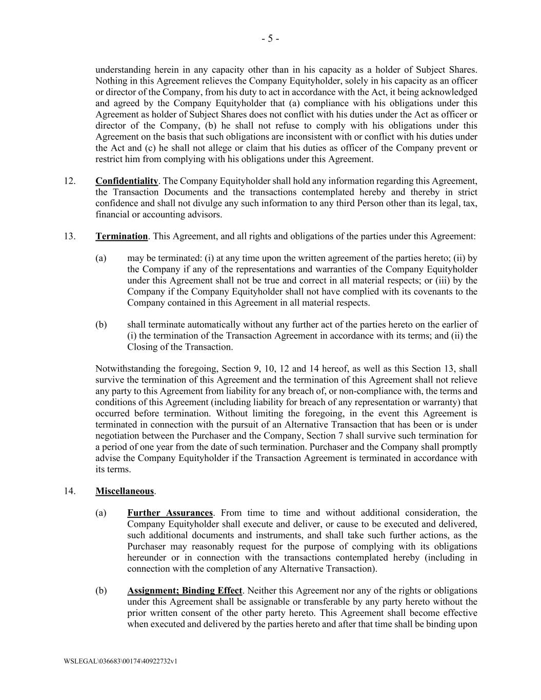 WSLEGAL\036683\00174\40922538v1 - 5 - understanding herein in any capacity other than in his capacity as a holder of Subject Shares. Nothing in this Agreement relieves the Company Equityholder, solely in his capacity as an officer or director of the Company, from his duty to act in accordance with the Act, it being acknowledged and agreed by the Company Equityholder that (a) compliance with his obligations under this Agreement as holder of Subject Shares does not conflict with his duties under the Act as officer or director of the Company, (b) he shall not refuse to comply with his obligations under this Agreement on the basis that such obligations are inconsistent with or conflict with his duties under the Act and (c) he shall not allege or claim that his duties as officer of the Company prevent or restrict him from complying with his obligations under this Agreement. 12. Confidentiality. The Company Equityholder shall hold any information regarding this Agreement, the Transaction Documents and the transactions contemplated hereby and thereby in strict confidence and shall not divulge any such information to any third Person other than its legal, tax, financial or accounting advisors. 13. Termination. This Agreement, and all rights and obligations of the parties under this Agreement: (a) may be terminated: (i) at any time upon the written agreement of the parties hereto; (ii) by the Company if any of the representations and warranties of the Company Equityholder under this Agreement shall not be true and correct in all material respects; or (iii) by the Company if the Company Equityholder shall not have complied with its covenants to the Company contained in this Agreement in all material respects. (b) shall terminate automatically without any further act of the parties hereto on the earlier of (i) the termination of the Transaction Agreement in accordance with its terms; and (ii) the Closing of the Transaction. Notwithstanding the foregoing, Section 9, 10, 12 and 14 hereof, as well as this Section 13, shall survive the termination of this Agreement and the termination of this Agreement shall not relieve any party to this Agreement from liability for any breach of, or non-compliance with, the terms and conditions of this Agreement (including liability for breach of any representation or warranty) that occurred before termination. Without limiting the foregoing, in the event this Agreement is terminated in connection with the pursuit of an Alternative Transaction that has been or is under negotiation between the Purchaser and the Company, Section 7 shall survive such termination for a period of one year from the date of such termination. Purchaser and the Company shall promptly advise the Company Equityholder if the Transaction Agreement is terminated in accordance with its terms. 14. Miscellaneous. (a) Further Assurances. From time to time and without additional consideration, the Company Equityholder shall execute and deliver, or cause to be executed and delivered, such additional documents and instruments, and shall take such further actions, as the Purchaser may reasonably request for the purpose of complying with its obligations hereunder or in connection with the transactions contemplated hereby (including in connection with the completion of any Alternative Transaction). (b) Assignment; Binding Effect. Neither this Agreement nor any of the rights or obligations under this Agreement shall be assignable or transferable by any party hereto without the prior written consent of the other party hereto. This Agreement shall become effective when executed and delivered by the parties hereto and after that time shall be binding upon