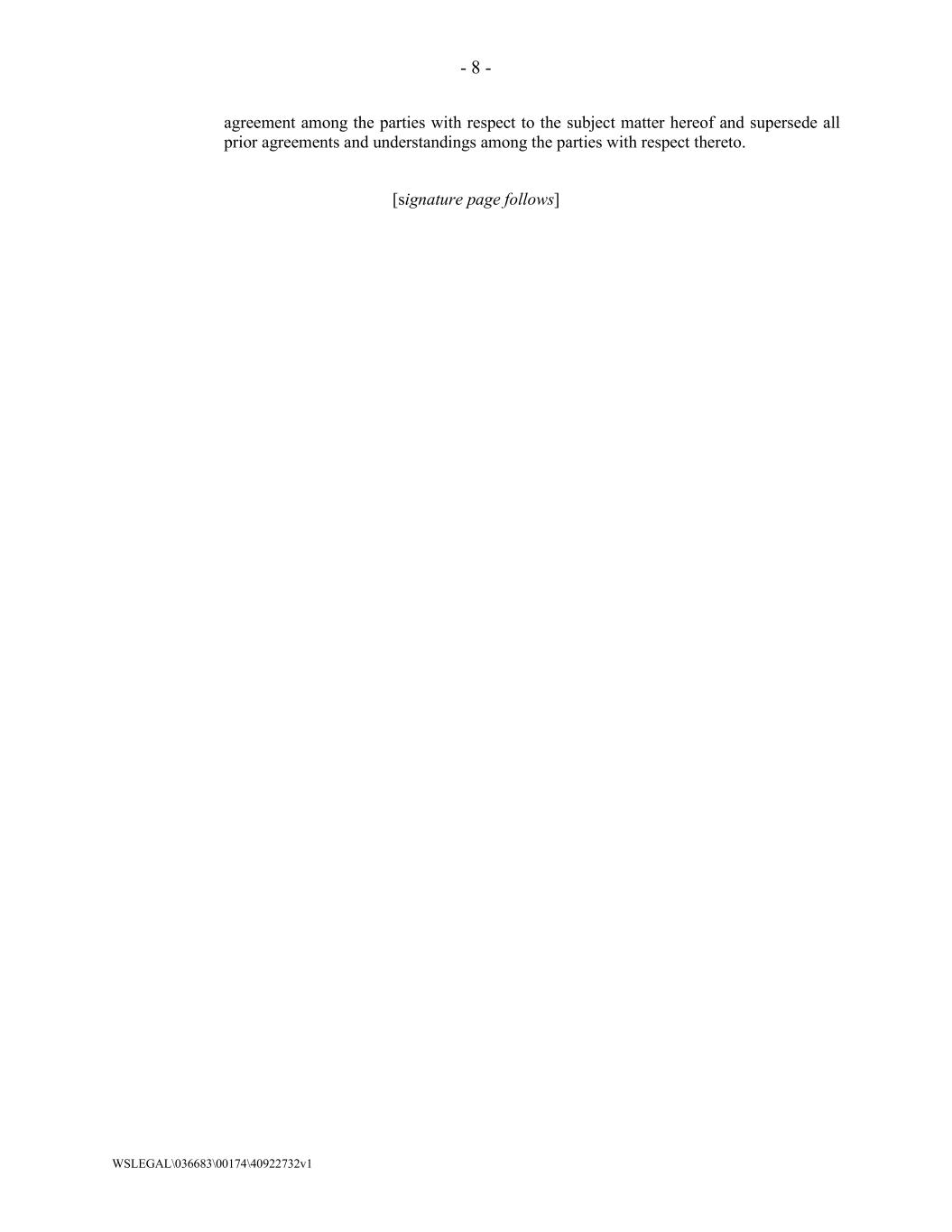 WSLEGAL\036683\00174\40922538v1 - 8 - agreement among the parties with respect to the subject matter hereof and supersede all prior agreements and understandings among the parties with respect thereto. [signature page follows]