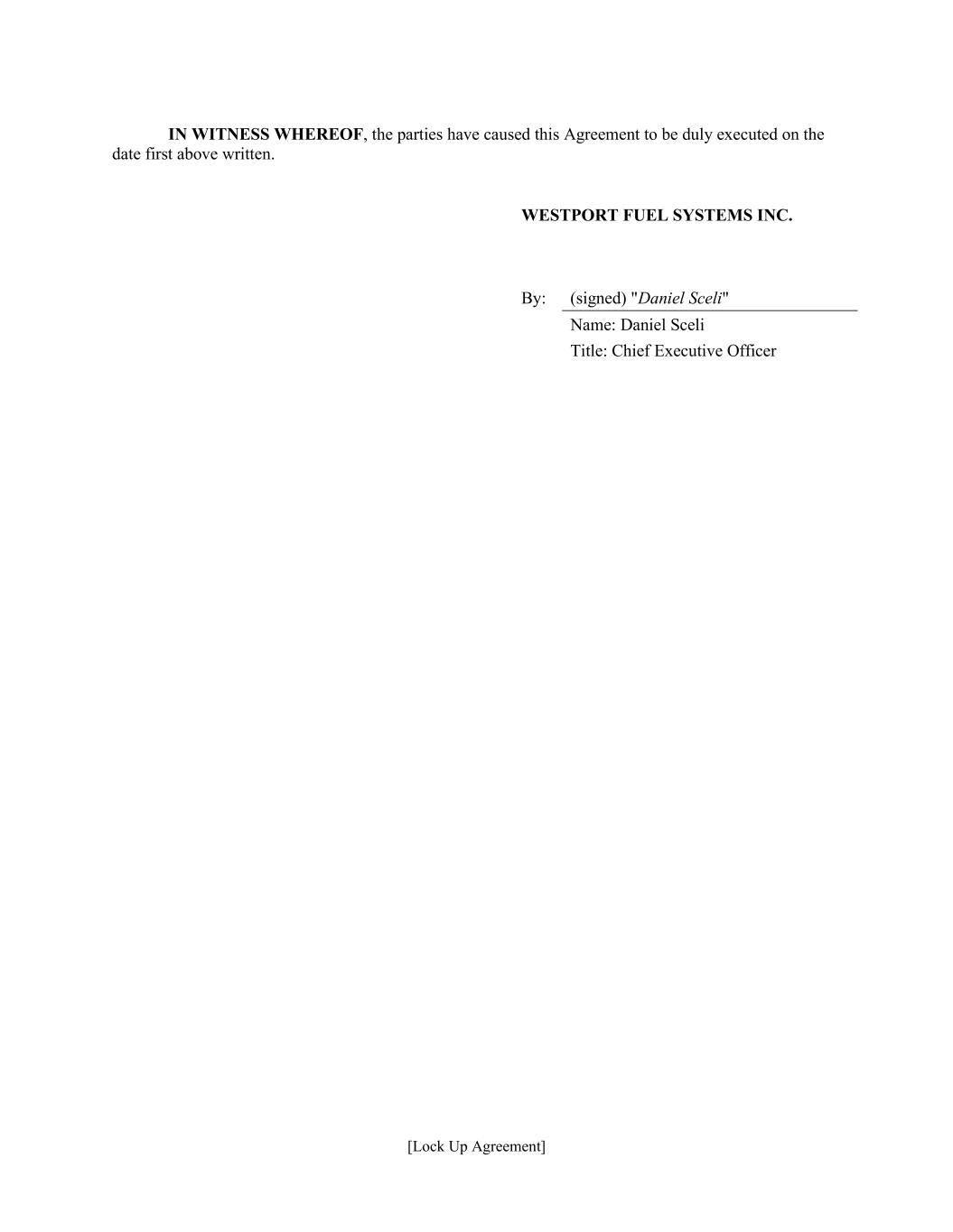 [Lock Up Agreement] IN WITNESS WHEREOF, the parties have caused this Agreement to be duly executed on the date first above written. WESTPORT FUEL SYSTEMS INC. By: (signed) "Daniel Sceli" Name: Daniel Sceli Title: Chief Executive Officer