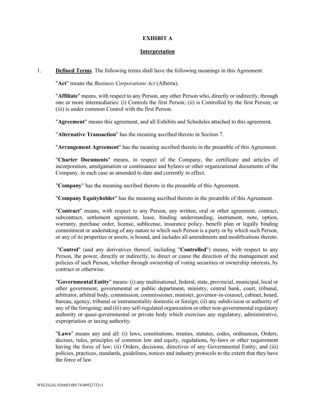 WSLEGAL\036683\00174\40922633v1 EXHIBIT A Interpretation 1. Defined Terms. The following terms shall have the following meanings in this Agreement: "Act" means the Business Corporations Act (Alberta). "Affiliate" means, with respect to any Person, any other Person who, directly or indirectly, through one or more intermediaries: (i) Controls the first Person; (ii) is Controlled by the first Person; or (iii) is under common Control with the first Person. "Agreement" means this agreement, and all Exhibits and Schedules attached to this agreement. "Alternative Transaction" has the meaning ascribed thereto in Section 7. "Arrangement Agreement" has the meaning ascribed thereto in the preamble of this Agreement. "Charter Documents" means, in respect of the Company, the certificate and articles of incorporation, amalgamation or continuance and bylaws or other organizational documents of the Company, in each case as amended to date and currently in effect. "Company" has the meaning ascribed thereto in the preamble of this Agreement. "Company Equityholder" has the meaning ascribed thereto in the preamble of this Agreement. "Contract" means, with respect to any Person, any written, oral or other agreement, contract, subcontract, settlement agreement, lease, binding understanding, instrument, note, option, warranty, purchase order, license, sublicense, insurance policy, benefit plan or legally binding commitment or undertaking of any nature to which such Person is a party or by which such Person, or any of its properties or assets, is bound, and includes all amendments and modifications thereto. "Control" (and any derivatives thereof, including "Controlled") means, with respect to any Person, the power, directly or indirectly, to direct or cause the direction of the management and policies of such Person, whether through ownership of voting securities or ownership interests, by contract or otherwise. "Governmental Entity" means: (i) any multinational, federal, state, provincial, municipal, local or other government, governmental or public department, ministry, central bank, court, tribunal, arbitrator, arbitral body, commission, commissioner, minister, governor-in-counsel, cabinet, board, bureau, agency, tribunal or instrumentality domestic or foreign; (ii) any subdivision or authority of any of the foregoing; and (iii) any self-regulated organization or other non-governmental regulatory authority or quasi-governmental or private body which exercises any regulatory, administrative, expropriation or taxing authority. "Laws" means any and all: (i) laws, constitutions, treaties, statutes, codes, ordinances, Orders, decrees, rules, principles of common law and equity, regulations, by-laws or other requirement having the force of law; (ii) Orders, decisions, directives of any Governmental Entity; and (iii) policies, practices, standards, guidelines, notices and industry protocols to the extent that they have the force of law.