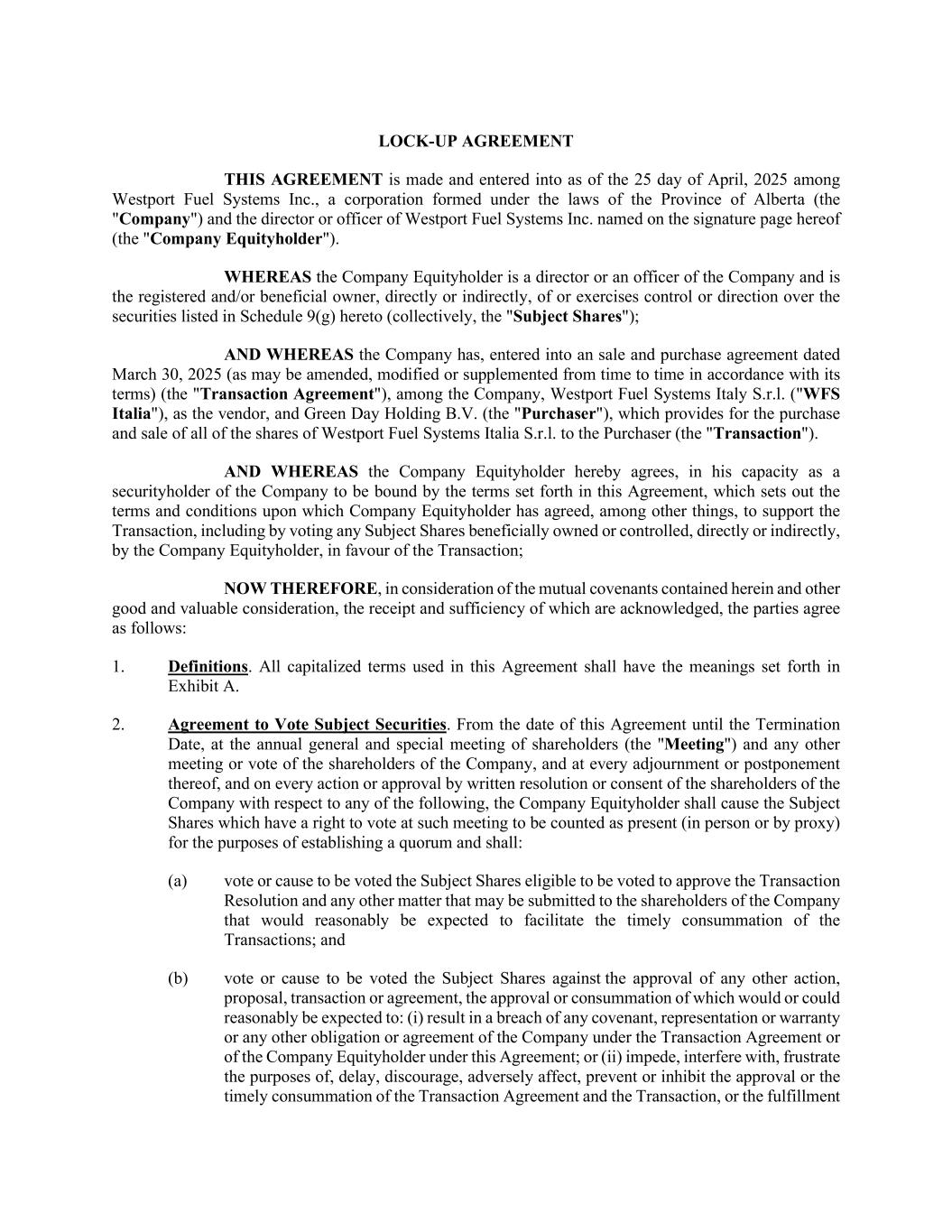 LOCK-UP AGREEMENT THIS AGREEMENT is made and entered into as of the 30th day of April, 2025 among Westport Fuel Systems Inc., a corporation formed under the laws of the Province of Alberta (the "Company") and the director or officer of Westport Fuel Systems Inc. named on the signature page hereof (the "Company Equityholder"). WHEREAS the Company Equityholder is a director or an officer of the Company and is the registered and/or beneficial owner, directly or indirectly, of or exercises control or direction over the securities listed in Schedule 9(g) hereto (collectively, the "Subject Shares"); AND WHEREAS the Company has, entered into an sale and purchase agreement dated March 30, 2025 (as may be amended, modified or supplemented from time to time in accordance with its terms) (the "Transaction Agreement"), among the Company, Westport Fuel Systems Italy S.r.l. ("WFS Italia"), as the vendor, and Green Day Holding B.V. (the "Purchaser"), which provides for the purchase and sale of all of the shares of Westport Fuel Systems Italia S.r.l. to the Purchaser (the "Transaction"). AND WHEREAS the Company Equityholder hereby agrees, in his capacity as a securityholder of the Company to be bound by the terms set forth in this Agreement, which sets out the terms and conditions upon which Company Equityholder has agreed, among other things, to support the Transaction, including by voting any Subject Shares beneficially owned or controlled, directly or indirectly, by the Company Equityholder, in favour of the Transaction; NOW THEREFORE, in consideration of the mutual covenants contained herein and other good and valuable consideration, the receipt and sufficiency of which are acknowledged, the parties agree as follows: 1. Definitions. All capitalized terms used in this Agreement shall have the meanings set forth in Exhibit A. 2. Agreement to Vote Subject Securities. From the date of this Agreement until the Termination Date, at the annual general and special meeting of shareholders (the "Meeting") and any other meeting or vote of the shareholders of the Company, and at every adjournment or postponement thereof, and on every action or approval by written resolution or consent of the shareholders of the Company with respect to any of the following, the Company Equityholder shall cause the Subject Shares which have a right to vote at such meeting to be counted as present (in person or by proxy) for the purposes of establishing a quorum and shall: (a) vote or cause to be voted the Subject Shares eligible to be voted to approve the Transaction Resolution and any other matter that may be submitted to the shareholders of the Company that would reasonably be expected to facilitate the timely consummation of the Transactions; and (b) vote or cause to be voted the Subject Shares against the approval of any other action, proposal, transaction or agreement, the approval or consummation of which would or could reasonably be expected to: (i) result in a breach of any covenant, representation or warranty or any other obligation or agreement of the Company under the Transaction Agreement or of the Company Equityholder under this Agreement; or (ii) impede, interfere with, frustrate the purposes of, delay, discourage, adversely affect, prevent or inhibit the approval or the timely consummation of the Transaction Agreement and the Transaction, or the fulfillment