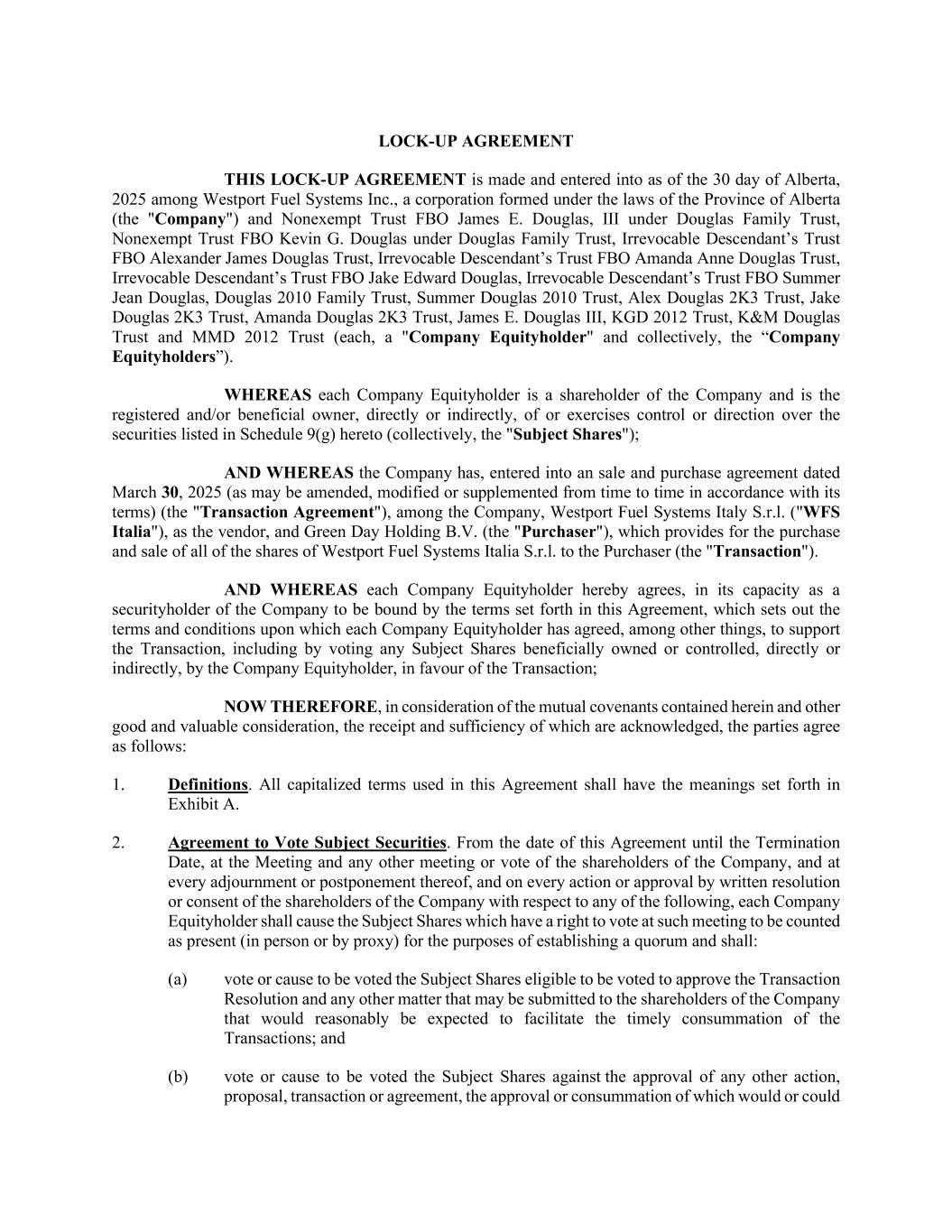 LOCK-UP AGREEMENT THIS LOCK-UP AGREEMENT is made and entered into as of the 30 day of Alberta, 2025 among Westport Fuel Systems Inc., a corporation formed under the laws of the Province of Alberta (the "Company") and Nonexempt Trust FBO James E. Douglas, III under Douglas Family Trust, Nonexempt Trust FBO Kevin G. Douglas under Douglas Family Trust, Irrevocable Descendant’s Trust FBO Alexander James Douglas Trust, Irrevocable Descendant’s Trust FBO Amanda Anne Douglas Trust, Irrevocable Descendant’s Trust FBO Jake Edward Douglas, Irrevocable Descendant’s Trust FBO Summer Jean Douglas, Douglas 2010 Family Trust, Summer Douglas 2010 Trust, Alex Douglas 2K3 Trust, Jake Douglas 2K3 Trust, Amanda Douglas 2K3 Trust, James E. Douglas III, KGD 2012 Trust, K&M Douglas Trust and MMD 2012 Trust (each, a "Company Equityholder" and collectively, the “Company Equityholders”). WHEREAS each Company Equityholder is a shareholder of the Company and is the registered and/or beneficial owner, directly or indirectly, of or exercises control or direction over the securities listed in Schedule 9(g) hereto (collectively, the "Subject Shares"); AND WHEREAS the Company has, entered into an sale and purchase agreement dated March 30, 2025 (as may be amended, modified or supplemented from time to time in accordance with its terms) (the "Transaction Agreement"), among the Company, Westport Fuel Systems Italy S.r.l. ("WFS Italia"), as the vendor, and Green Day Holding B.V. (the "Purchaser"), which provides for the purchase and sale of all of the shares of Westport Fuel Systems Italia S.r.l. to the Purchaser (the "Transaction"). AND WHEREAS each Company Equityholder hereby agrees, in its capacity as a securityholder of the Company to be bound by the terms set forth in this Agreement, which sets out the terms and conditions upon which each Company Equityholder has agreed, among other things, to support the Transaction, including by voting any Subject Shares beneficially owned or controlled, directly or indirectly, by the Company Equityholder, in favour of the Transaction; NOW THEREFORE, in consideration of the mutual covenants contained herein and other good and valuable consideration, the receipt and sufficiency of which are acknowledged, the parties agree as follows: 1. Definitions. All capitalized terms used in this Agreement shall have the meanings set forth in Exhibit A. 2. Agreement to Vote Subject Securities. From the date of this Agreement until the Termination Date, at the Meeting and any other meeting or vote of the shareholders of the Company, and at every adjournment or postponement thereof, and on every action or approval by written resolution or consent of the shareholders of the Company with respect to any of the following, each Company Equityholder shall cause the Subject Shares which have a right to vote at such meeting to be counted as present (in person or by proxy) for the purposes of establishing a quorum and shall: (a) vote or cause to be voted the Subject Shares eligible to be voted to approve the Transaction Resolution and any other matter that may be submitted to the shareholders of the Company that would reasonably be expected to facilitate the timely consummation of the Transactions; and (b) vote or cause to be voted the Subject Shares against the approval of any other action, proposal, transaction or agreement, the approval or consummation of which would or could