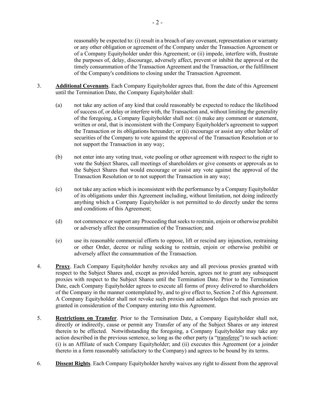 - 2 - reasonably be expected to: (i) result in a breach of any covenant, representation or warranty or any other obligation or agreement of the Company under the Transaction Agreement or of a Company Equityholder under this Agreement; or (ii) impede, interfere with, frustrate the purposes of, delay, discourage, adversely affect, prevent or inhibit the approval or the timely consummation of the Transaction Agreement and the Transaction, or the fulfillment of the Company's conditions to closing under the Transaction Agreement. 3. Additional Covenants. Each Company Equityholder agrees that, from the date of this Agreement until the Termination Date, the Company Equityholder shall: (a) not take any action of any kind that could reasonably be expected to reduce the likelihood of success of, or delay or interfere with, the Transaction and, without limiting the generality of the foregoing, a Company Equityholder shall not: (i) make any comment or statement, written or oral, that is inconsistent with the Company Equityholder's agreement to support the Transaction or its obligations hereunder; or (ii) encourage or assist any other holder of securities of the Company to vote against the approval of the Transaction Resolution or to not support the Transaction in any way; (b) not enter into any voting trust, vote pooling or other agreement with respect to the right to vote the Subject Shares, call meetings of shareholders or give consents or approvals as to the Subject Shares that would encourage or assist any vote against the approval of the Transaction Resolution or to not support the Transaction in any way; (c) not take any action which is inconsistent with the performance by a Company Equityholder of its obligations under this Agreement including, without limitation, not doing indirectly anything which a Company Equityholder is not permitted to do directly under the terms and conditions of this Agreement; (d) not commence or support any Proceeding that seeks to restrain, enjoin or otherwise prohibit or adversely affect the consummation of the Transaction; and (e) use its reasonable commercial efforts to oppose, lift or rescind any injunction, restraining or other Order, decree or ruling seeking to restrain, enjoin or otherwise prohibit or adversely affect the consummation of the Transaction. 4. Proxy. Each Company Equityholder hereby revokes any and all previous proxies granted with respect to the Subject Shares and, except as provided herein, agrees not to grant any subsequent proxies with respect to the Subject Shares until the Termination Date. Prior to the Termination Date, each Company Equityholder agrees to execute all forms of proxy delivered to shareholders of the Company in the manner contemplated by, and to give effect to, Section 2 of this Agreement. A Company Equityholder shall not revoke such proxies and acknowledges that such proxies are granted in consideration of the Company entering into this Agreement. 5. Restrictions on Transfer. Prior to the Termination Date, a Company Equityholder shall not, directly or indirectly, cause or permit any Transfer of any of the Subject Shares or any interest therein to be effected. Notwithstanding the foregoing, a Company Equityholder may take any action described in the previous sentence, so long as the other party (a “transferee”) to such action: (i) is an Affiliate of such Company Equityholder; and (ii) executes this Agreement (or a joinder thereto in a form reasonably satisfactory to the Company) and agrees to be bound by its terms. 6. Dissent Rights. Each Company Equityholder hereby waives any right to dissent from the approval