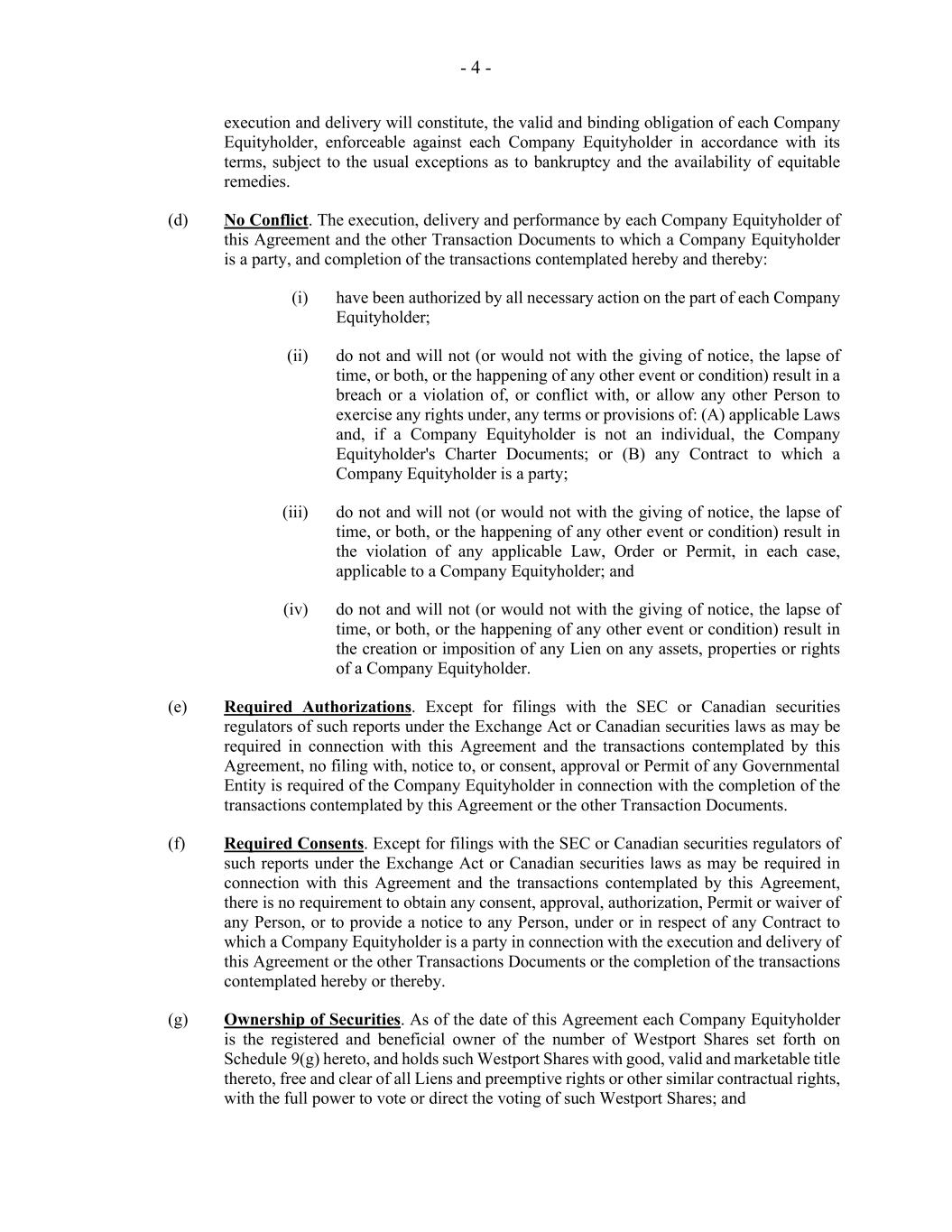 - 4 - execution and delivery will constitute, the valid and binding obligation of each Company Equityholder, enforceable against each Company Equityholder in accordance with its terms, subject to the usual exceptions as to bankruptcy and the availability of equitable remedies. (d) No Conflict. The execution, delivery and performance by each Company Equityholder of this Agreement and the other Transaction Documents to which a Company Equityholder is a party, and completion of the transactions contemplated hereby and thereby: (i) have been authorized by all necessary action on the part of each Company Equityholder; (ii) do not and will not (or would not with the giving of notice, the lapse of time, or both, or the happening of any other event or condition) result in a breach or a violation of, or conflict with, or allow any other Person to exercise any rights under, any terms or provisions of: (A) applicable Laws and, if a Company Equityholder is not an individual, the Company Equityholder's Charter Documents; or (B) any Contract to which a Company Equityholder is a party; (iii) do not and will not (or would not with the giving of notice, the lapse of time, or both, or the happening of any other event or condition) result in the violation of any applicable Law, Order or Permit, in each case, applicable to a Company Equityholder; and (iv) do not and will not (or would not with the giving of notice, the lapse of time, or both, or the happening of any other event or condition) result in the creation or imposition of any Lien on any assets, properties or rights of a Company Equityholder. (e) Required Authorizations. Except for filings with the SEC or Canadian securities regulators of such reports under the Exchange Act or Canadian securities laws as may be required in connection with this Agreement and the transactions contemplated by this Agreement, no filing with, notice to, or consent, approval or Permit of any Governmental Entity is required of the Company Equityholder in connection with the completion of the transactions contemplated by this Agreement or the other Transaction Documents. (f) Required Consents. Except for filings with the SEC or Canadian securities regulators of such reports under the Exchange Act or Canadian securities laws as may be required in connection with this Agreement and the transactions contemplated by this Agreement, there is no requirement to obtain any consent, approval, authorization, Permit or waiver of any Person, or to provide a notice to any Person, under or in respect of any Contract to which a Company Equityholder is a party in connection with the execution and delivery of this Agreement or the other Transactions Documents or the completion of the transactions contemplated hereby or thereby. (g) Ownership of Securities. As of the date of this Agreement each Company Equityholder is the registered and beneficial owner of the number of Westport Shares set forth on Schedule 9(g) hereto, and holds such Westport Shares with good, valid and marketable title thereto, free and clear of all Liens and preemptive rights or other similar contractual rights, with the full power to vote or direct the voting of such Westport Shares; and