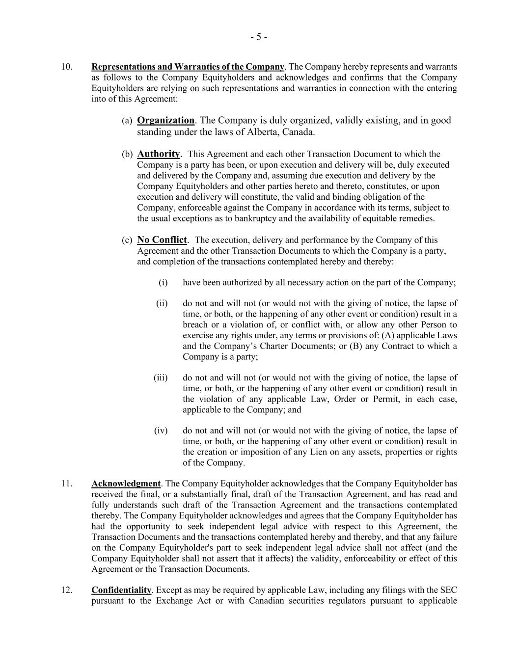 - 5 - 10. Representations and Warranties of the Company. The Company hereby represents and warrants as follows to the Company Equityholders and acknowledges and confirms that the Company Equityholders are relying on such representations and warranties in connection with the entering into of this Agreement: (a) Organization. The Company is duly organized, validly existing, and in good standing under the laws of Alberta, Canada. (b) Authority. This Agreement and each other Transaction Document to which the Company is a party has been, or upon execution and delivery will be, duly executed and delivered by the Company and, assuming due execution and delivery by the Company Equityholders and other parties hereto and thereto, constitutes, or upon execution and delivery will constitute, the valid and binding obligation of the Company, enforceable against the Company in accordance with its terms, subject to the usual exceptions as to bankruptcy and the availability of equitable remedies. (c) No Conflict. The execution, delivery and performance by the Company of this Agreement and the other Transaction Documents to which the Company is a party, and completion of the transactions contemplated hereby and thereby: (i) have been authorized by all necessary action on the part of the Company; (ii) do not and will not (or would not with the giving of notice, the lapse of time, or both, or the happening of any other event or condition) result in a breach or a violation of, or conflict with, or allow any other Person to exercise any rights under, any terms or provisions of: (A) applicable Laws and the Company’s Charter Documents; or (B) any Contract to which a Company is a party; (iii) do not and will not (or would not with the giving of notice, the lapse of time, or both, or the happening of any other event or condition) result in the violation of any applicable Law, Order or Permit, in each case, applicable to the Company; and (iv) do not and will not (or would not with the giving of notice, the lapse of time, or both, or the happening of any other event or condition) result in the creation or imposition of any Lien on any assets, properties or rights of the Company. 11. Acknowledgment. The Company Equityholder acknowledges that the Company Equityholder has received the final, or a substantially final, draft of the Transaction Agreement, and has read and fully understands such draft of the Transaction Agreement and the transactions contemplated thereby. The Company Equityholder acknowledges and agrees that the Company Equityholder has had the opportunity to seek independent legal advice with respect to this Agreement, the Transaction Documents and the transactions contemplated hereby and thereby, and that any failure on the Company Equityholder's part to seek independent legal advice shall not affect (and the Company Equityholder shall not assert that it affects) the validity, enforceability or effect of this Agreement or the Transaction Documents. 12. Confidentiality. Except as may be required by applicable Law, including any filings with the SEC pursuant to the Exchange Act or with Canadian securities regulators pursuant to applicable