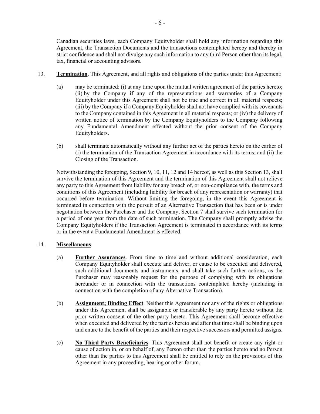 - 6 - Canadian securities laws, each Company Equityholder shall hold any information regarding this Agreement, the Transaction Documents and the transactions contemplated hereby and thereby in strict confidence and shall not divulge any such information to any third Person other than its legal, tax, financial or accounting advisors. 13. Termination. This Agreement, and all rights and obligations of the parties under this Agreement: (a) may be terminated: (i) at any time upon the mutual written agreement of the parties hereto; (ii) by the Company if any of the representations and warranties of a Company Equityholder under this Agreement shall not be true and correct in all material respects; (iii) by the Company if a Company Equityholder shall not have complied with its covenants to the Company contained in this Agreement in all material respects; or (iv) the delivery of written notice of termination by the Company Equityholders to the Company following any Fundamental Amendment effected without the prior consent of the Company Equityholders. (b) shall terminate automatically without any further act of the parties hereto on the earlier of (i) the termination of the Transaction Agreement in accordance with its terms; and (ii) the Closing of the Transaction. Notwithstanding the foregoing, Section 9, 10, 11, 12 and 14 hereof, as well as this Section 13, shall survive the termination of this Agreement and the termination of this Agreement shall not relieve any party to this Agreement from liability for any breach of, or non-compliance with, the terms and conditions of this Agreement (including liability for breach of any representation or warranty) that occurred before termination. Without limiting the foregoing, in the event this Agreement is terminated in connection with the pursuit of an Alternative Transaction that has been or is under negotiation between the Purchaser and the Company, Section 7 shall survive such termination for a period of one year from the date of such termination. The Company shall promptly advise the Company Equityholders if the Transaction Agreement is terminated in accordance with its terms or in the event a Fundamental Amendment is effected. 14. Miscellaneous. (a) Further Assurances. From time to time and without additional consideration, each Company Equityholder shall execute and deliver, or cause to be executed and delivered, such additional documents and instruments, and shall take such further actions, as the Purchaser may reasonably request for the purpose of complying with its obligations hereunder or in connection with the transactions contemplated hereby (including in connection with the completion of any Alternative Transaction). (b) Assignment; Binding Effect. Neither this Agreement nor any of the rights or obligations under this Agreement shall be assignable or transferable by any party hereto without the prior written consent of the other party hereto. This Agreement shall become effective when executed and delivered by the parties hereto and after that time shall be binding upon and enure to the benefit of the parties and their respective successors and permitted assigns. (c) No Third Party Beneficiaries. This Agreement shall not benefit or create any right or cause of action in, or on behalf of, any Person other than the parties hereto and no Person other than the parties to this Agreement shall be entitled to rely on the provisions of this Agreement in any proceeding, hearing or other forum.