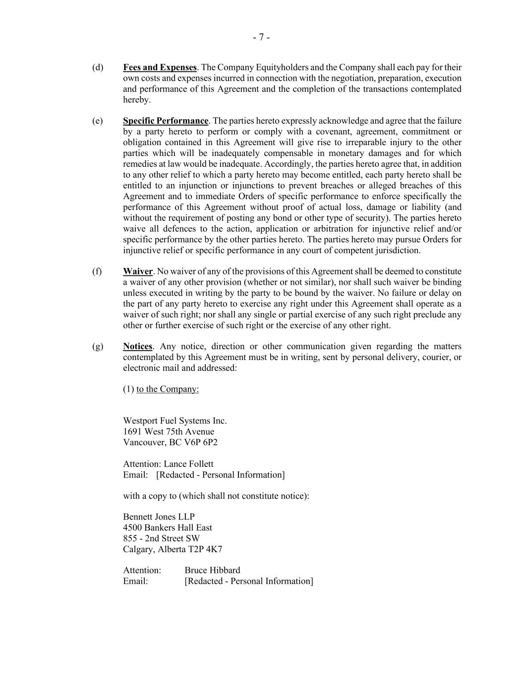- 7 - (d) Fees and Expenses. The Company Equityholders and the Company shall each pay for their own costs and expenses incurred in connection with the negotiation, preparation, execution and performance of this Agreement and the completion of the transactions contemplated hereby. (e) Specific Performance. The parties hereto expressly acknowledge and agree that the failure by a party hereto to perform or comply with a covenant, agreement, commitment or obligation contained in this Agreement will give rise to irreparable injury to the other parties which will be inadequately compensable in monetary damages and for which remedies at law would be inadequate. Accordingly, the parties hereto agree that, in addition to any other relief to which a party hereto may become entitled, each party hereto shall be entitled to an injunction or injunctions to prevent breaches or alleged breaches of this Agreement and to immediate Orders of specific performance to enforce specifically the performance of this Agreement without proof of actual loss, damage or liability (and without the requirement of posting any bond or other type of security). The parties hereto waive all defences to the action, application or arbitration for injunctive relief and/or specific performance by the other parties hereto. The parties hereto may pursue Orders for injunctive relief or specific performance in any court of competent jurisdiction. (f) Waiver. No waiver of any of the provisions of this Agreement shall be deemed to constitute a waiver of any other provision (whether or not similar), nor shall such waiver be binding unless executed in writing by the party to be bound by the waiver. No failure or delay on the part of any party hereto to exercise any right under this Agreement shall operate as a waiver of such right; nor shall any single or partial exercise of any such right preclude any other or further exercise of such right or the exercise of any other right. (g) Notices. Any notice, direction or other communication given regarding the matters contemplated by this Agreement must be in writing, sent by personal delivery, courier, or electronic mail and addressed: (1) to the Company: Westport Fuel Systems Inc. 1691 West 75th Avenue Vancouver, BC V6P 6P2 Attention: Lance Follett Email: [Redacted - Personal Information] with a copy to (which shall not constitute notice): Bennett Jones LLP 4500 Bankers Hall East 855 - 2nd Street SW Calgary, Alberta T2P 4K7 Attention: Bruce Hibbard Email: [Redacted - Personal Information]