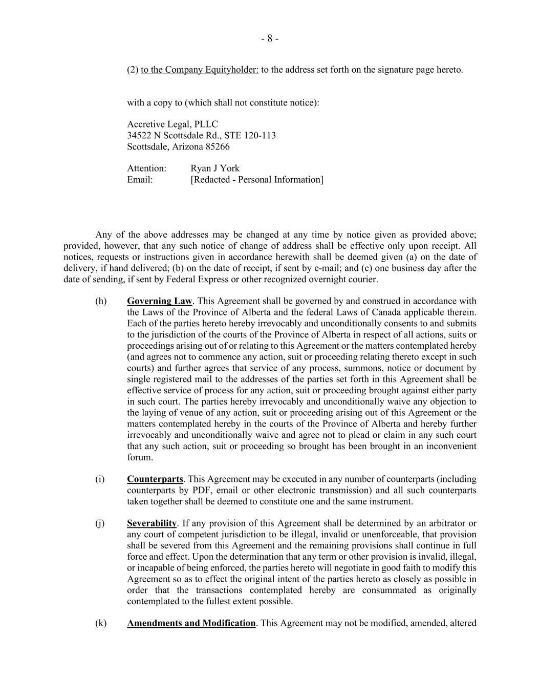 - 8 - (2) to the Company Equityholder: to the address set forth on the signature page hereto. with a copy to (which shall not constitute notice): Accretive Legal, PLLC 34522 N Scottsdale Rd., STE 120-113 Scottsdale, Arizona 85266 Attention: Ryan J York Email: [Redacted - Personal Information] Any of the above addresses may be changed at any time by notice given as provided above; provided, however, that any such notice of change of address shall be effective only upon receipt. All notices, requests or instructions given in accordance herewith shall be deemed given (a) on the date of delivery, if hand delivered; (b) on the date of receipt, if sent by e-mail; and (c) one business day after the date of sending, if sent by Federal Express or other recognized overnight courier. (h) Governing Law. This Agreement shall be governed by and construed in accordance with the Laws of the Province of Alberta and the federal Laws of Canada applicable therein. Each of the parties hereto hereby irrevocably and unconditionally consents to and submits to the jurisdiction of the courts of the Province of Alberta in respect of all actions, suits or proceedings arising out of or relating to this Agreement or the matters contemplated hereby (and agrees not to commence any action, suit or proceeding relating thereto except in such courts) and further agrees that service of any process, summons, notice or document by single registered mail to the addresses of the parties set forth in this Agreement shall be effective service of process for any action, suit or proceeding brought against either party in such court. The parties hereby irrevocably and unconditionally waive any objection to the laying of venue of any action, suit or proceeding arising out of this Agreement or the matters contemplated hereby in the courts of the Province of Alberta and hereby further irrevocably and unconditionally waive and agree not to plead or claim in any such court that any such action, suit or proceeding so brought has been brought in an inconvenient forum. (i) Counterparts. This Agreement may be executed in any number of counterparts (including counterparts by PDF, email or other electronic transmission) and all such counterparts taken together shall be deemed to constitute one and the same instrument. (j) Severability. If any provision of this Agreement shall be determined by an arbitrator or any court of competent jurisdiction to be illegal, invalid or unenforceable, that provision shall be severed from this Agreement and the remaining provisions shall continue in full force and effect. Upon the determination that any term or other provision is invalid, illegal, or incapable of being enforced, the parties hereto will negotiate in good faith to modify this Agreement so as to effect the original intent of the parties hereto as closely as possible in order that the transactions contemplated hereby are consummated as originally contemplated to the fullest extent possible. (k) Amendments and Modification. This Agreement may not be modified, amended, altered