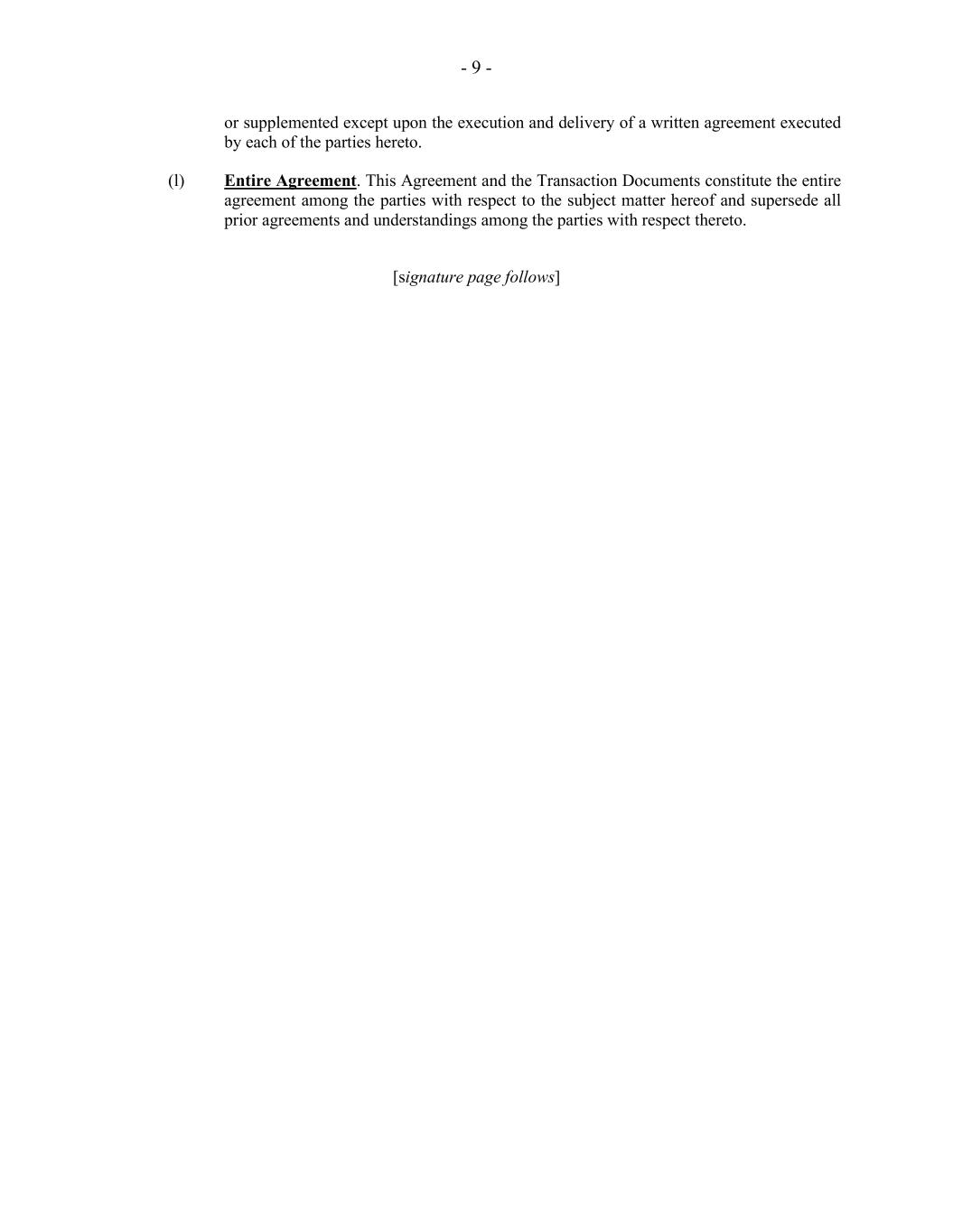 - 9 - or supplemented except upon the execution and delivery of a written agreement executed by each of the parties hereto. (l) Entire Agreement. This Agreement and the Transaction Documents constitute the entire agreement among the parties with respect to the subject matter hereof and supersede all prior agreements and understandings among the parties with respect thereto. [signature page follows]