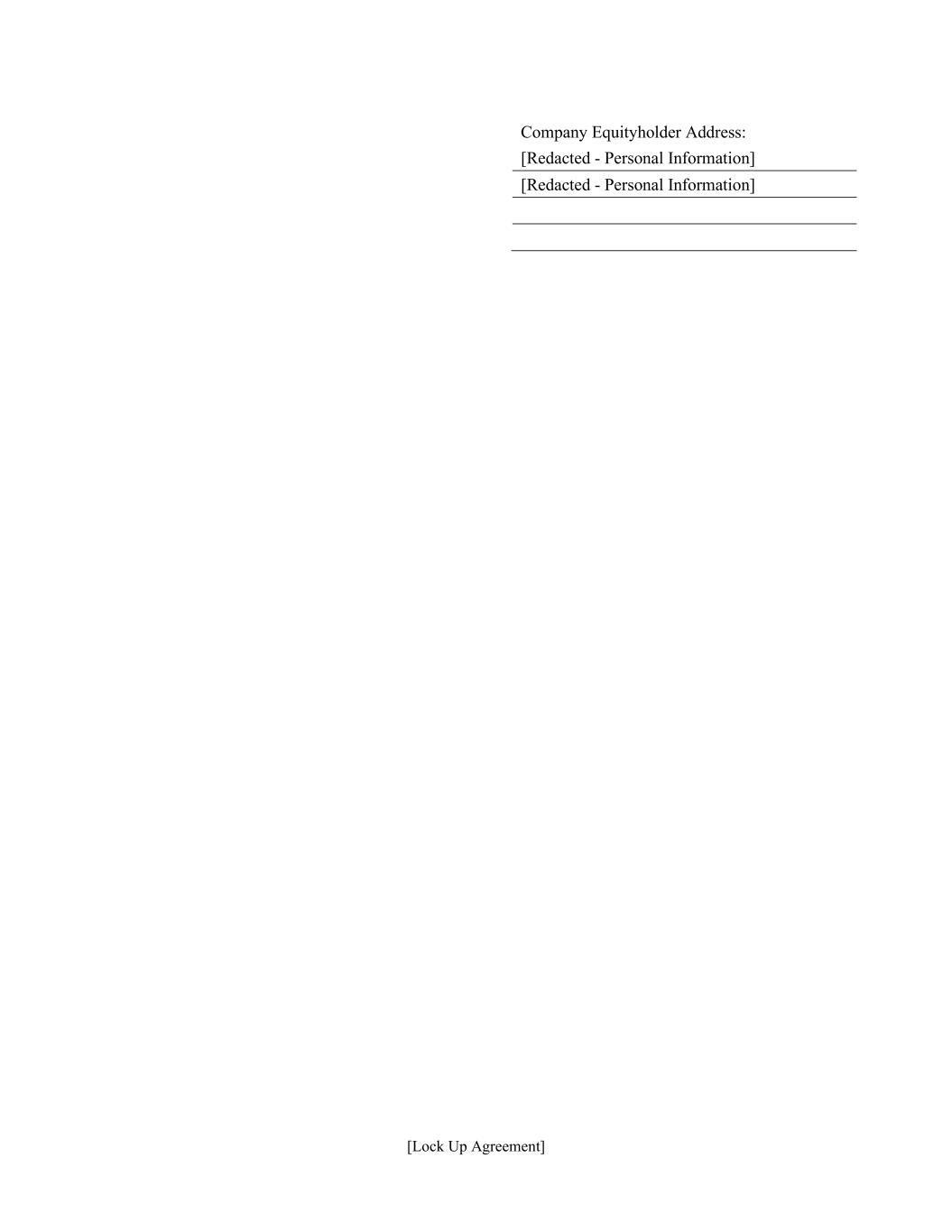 [Lock Up Agreement] Company Equityholder Address: [Redacted - Personal Information] [Redacted - Personal Information]