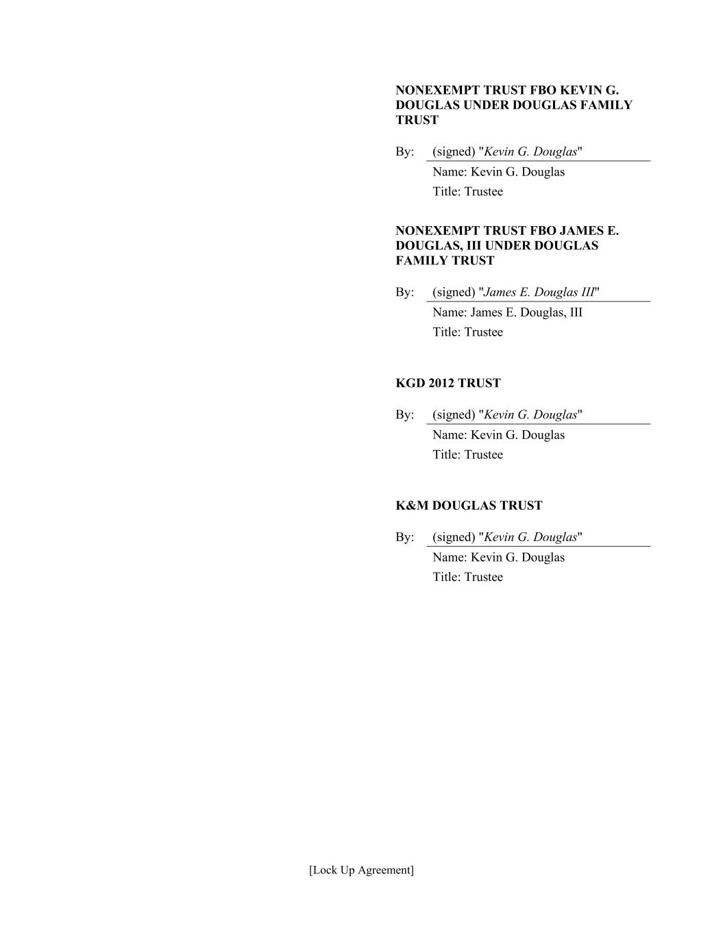 [Lock Up Agreement] NONEXEMPT TRUST FBO KEVIN G. DOUGLAS UNDER DOUGLAS FAMILY TRUST By: (signed) "Kevin G. Douglas" Name: Kevin G. Douglas Title: Trustee NONEXEMPT TRUST FBO JAMES E. DOUGLAS, III UNDER DOUGLAS FAMILY TRUST By: (signed) "James E. Douglas III" Name: James E. Douglas, III Title: Trustee KGD 2012 TRUST By: (signed) "Kevin G. Douglas" Name: Kevin G. Douglas Title: Trustee K&M DOUGLAS TRUST By: (signed) "Kevin G. Douglas" Name: Kevin G. Douglas Title: Trustee