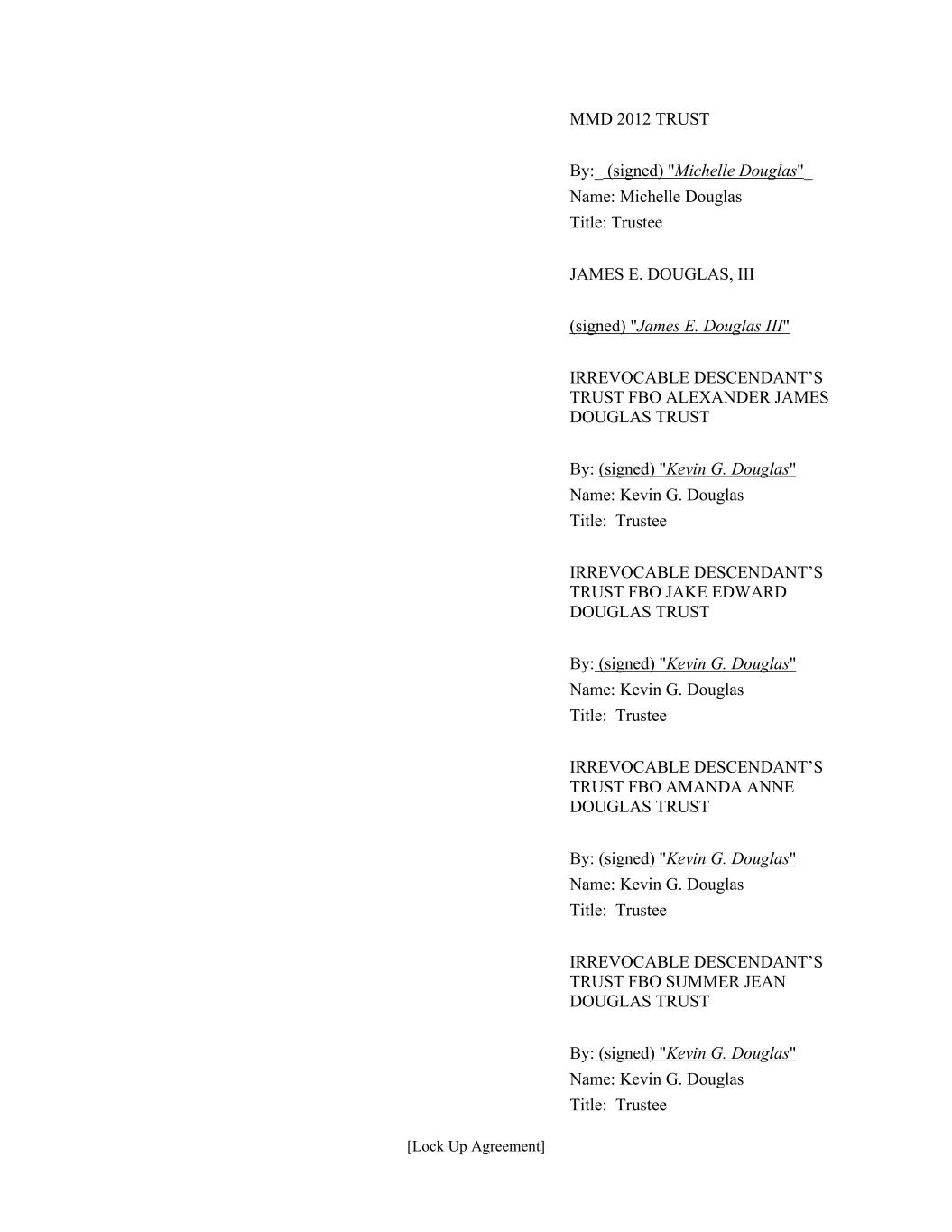 [Lock Up Agreement] MMD 2012 TRUST By:_ (signed) "Michelle Douglas"_ Name: Michelle Douglas Title: Trustee JAMES E. DOUGLAS, III (signed) "James E. Douglas III" IRREVOCABLE DESCENDANT’S TRUST FBO ALEXANDER JAMES DOUGLAS TRUST By: (signed) "Kevin G. Douglas" Name: Kevin G. Douglas Title: Trustee IRREVOCABLE DESCENDANT’S TRUST FBO JAKE EDWARD DOUGLAS TRUST By: (signed) "Kevin G. Douglas" Name: Kevin G. Douglas Title: Trustee IRREVOCABLE DESCENDANT’S TRUST FBO AMANDA ANNE DOUGLAS TRUST By: (signed) "Kevin G. Douglas" Name: Kevin G. Douglas Title: Trustee IRREVOCABLE DESCENDANT’S TRUST FBO SUMMER JEAN DOUGLAS TRUST By: (signed) "Kevin G. Douglas" Name: Kevin G. Douglas Title: Trustee