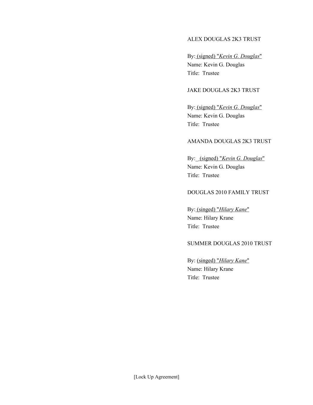 [Lock Up Agreement] ALEX DOUGLAS 2K3 TRUST By: (signed) "Kevin G. Douglas" Name: Kevin G. Douglas Title: Trustee JAKE DOUGLAS 2K3 TRUST By: (signed) "Kevin G. Douglas" Name: Kevin G. Douglas Title: Trustee AMANDA DOUGLAS 2K3 TRUST By:_ (signed) "Kevin G. Douglas" Name: Kevin G. Douglas Title: Trustee DOUGLAS 2010 FAMILY TRUST By: (singed) "Hilary Kane" Name: Hilary Krane Title: Trustee SUMMER DOUGLAS 2010 TRUST By: (singed) "Hilary Kane" Name: Hilary Krane Title: Trustee
