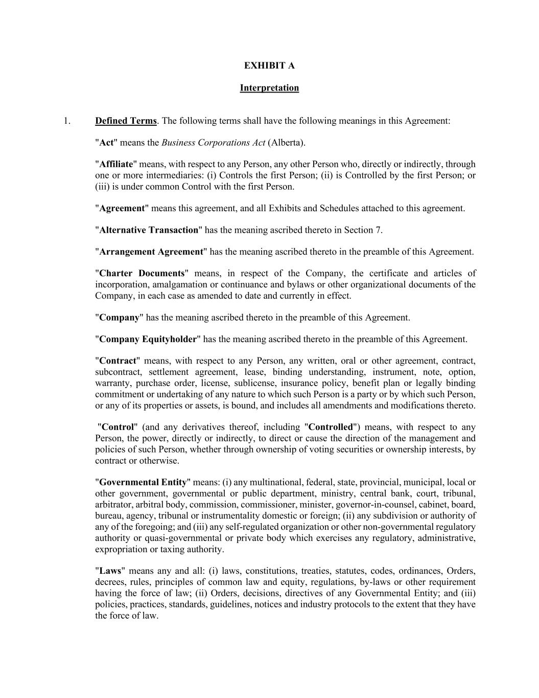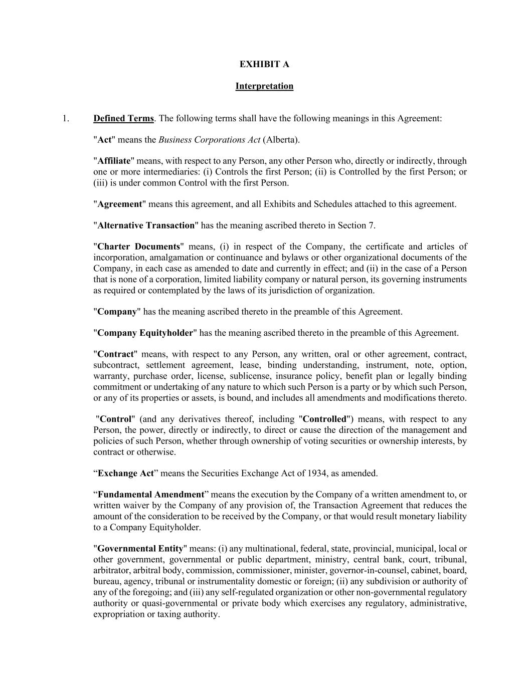 EXHIBIT A Interpretation 1. Defined Terms. The following terms shall have the following meanings in this Agreement: "Act" means the Business Corporations Act (Alberta). "Affiliate" means, with respect to any Person, any other Person who, directly or indirectly, through one or more intermediaries: (i) Controls the first Person; (ii) is Controlled by the first Person; or (iii) is under common Control with the first Person. "Agreement" means this agreement, and all Exhibits and Schedules attached to this agreement. "Alternative Transaction" has the meaning ascribed thereto in Section 7. "Charter Documents" means, (i) in respect of the Company, the certificate and articles of incorporation, amalgamation or continuance and bylaws or other organizational documents of the Company, in each case as amended to date and currently in effect; and (ii) in the case of a Person that is none of a corporation, limited liability company or natural person, its governing instruments as required or contemplated by the laws of its jurisdiction of organization. "Company" has the meaning ascribed thereto in the preamble of this Agreement. "Company Equityholder" has the meaning ascribed thereto in the preamble of this Agreement. "Contract" means, with respect to any Person, any written, oral or other agreement, contract, subcontract, settlement agreement, lease, binding understanding, instrument, note, option, warranty, purchase order, license, sublicense, insurance policy, benefit plan or legally binding commitment or undertaking of any nature to which such Person is a party or by which such Person, or any of its properties or assets, is bound, and includes all amendments and modifications thereto. "Control" (and any derivatives thereof, including "Controlled") means, with respect to any Person, the power, directly or indirectly, to direct or cause the direction of the management and policies of such Person, whether through ownership of voting securities or ownership interests, by contract or otherwise. “Exchange Act” means the Securities Exchange Act of 1934, as amended. “Fundamental Amendment” means the execution by the Company of a written amendment to, or written waiver by the Company of any provision of, the Transaction Agreement that reduces the amount of the consideration to be received by the Company, or that would result monetary liability to a Company Equityholder. "Governmental Entity" means: (i) any multinational, federal, state, provincial, municipal, local or other government, governmental or public department, ministry, central bank, court, tribunal, arbitrator, arbitral body, commission, commissioner, minister, governor-in-counsel, cabinet, board, bureau, agency, tribunal or instrumentality domestic or foreign; (ii) any subdivision or authority of any of the foregoing; and (iii) any self-regulated organization or other non-governmental regulatory authority or quasi-governmental or private body which exercises any regulatory, administrative, expropriation or taxing authority.