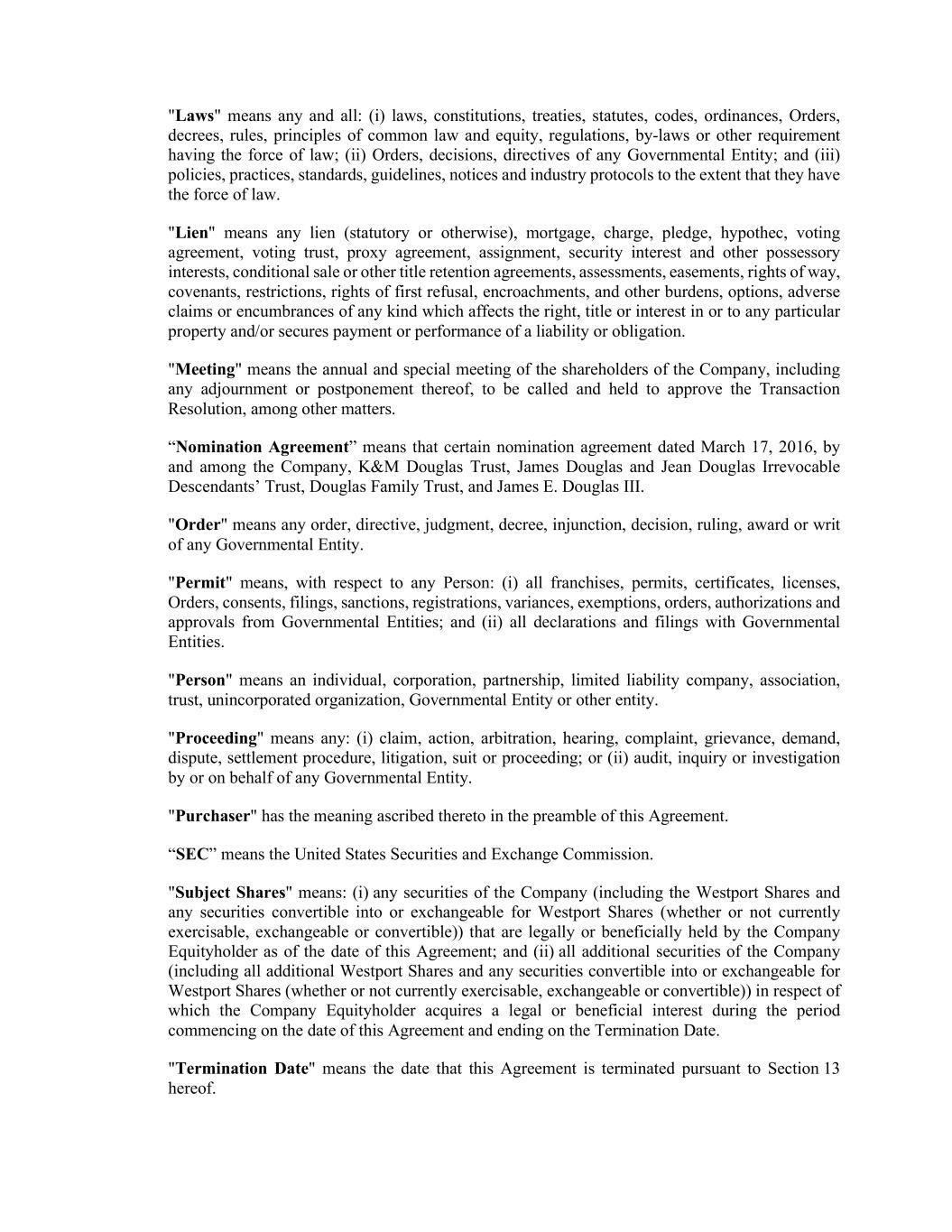 "Laws" means any and all: (i) laws, constitutions, treaties, statutes, codes, ordinances, Orders, decrees, rules, principles of common law and equity, regulations, by-laws or other requirement having the force of law; (ii) Orders, decisions, directives of any Governmental Entity; and (iii) policies, practices, standards, guidelines, notices and industry protocols to the extent that they have the force of law. "Lien" means any lien (statutory or otherwise), mortgage, charge, pledge, hypothec, voting agreement, voting trust, proxy agreement, assignment, security interest and other possessory interests, conditional sale or other title retention agreements, assessments, easements, rights of way, covenants, restrictions, rights of first refusal, encroachments, and other burdens, options, adverse claims or encumbrances of any kind which affects the right, title or interest in or to any particular property and/or secures payment or performance of a liability or obligation. "Meeting" means the annual and special meeting of the shareholders of the Company, including any adjournment or postponement thereof, to be called and held to approve the Transaction Resolution, among other matters. “Nomination Agreement” means that certain nomination agreement dated March 17, 2016, by and among the Company, K&M Douglas Trust, James Douglas and Jean Douglas Irrevocable Descendants’ Trust, Douglas Family Trust, and James E. Douglas III. "Order" means any order, directive, judgment, decree, injunction, decision, ruling, award or writ of any Governmental Entity. "Permit" means, with respect to any Person: (i) all franchises, permits, certificates, licenses, Orders, consents, filings, sanctions, registrations, variances, exemptions, orders, authorizations and approvals from Governmental Entities; and (ii) all declarations and filings with Governmental Entities. "Person" means an individual, corporation, partnership, limited liability company, association, trust, unincorporated organization, Governmental Entity or other entity. "Proceeding" means any: (i) claim, action, arbitration, hearing, complaint, grievance, demand, dispute, settlement procedure, litigation, suit or proceeding; or (ii) audit, inquiry or investigation by or on behalf of any Governmental Entity. "Purchaser" has the meaning ascribed thereto in the preamble of this Agreement. “SEC” means the United States Securities and Exchange Commission. "Subject Shares" means: (i) any securities of the Company (including the Westport Shares and any securities convertible into or exchangeable for Westport Shares (whether or not currently exercisable, exchangeable or convertible)) that are legally or beneficially held by the Company Equityholder as of the date of this Agreement; and (ii) all additional securities of the Company (including all additional Westport Shares and any securities convertible into or exchangeable for Westport Shares (whether or not currently exercisable, exchangeable or convertible)) in respect of which the Company Equityholder acquires a legal or beneficial interest during the period commencing on the date of this Agreement and ending on the Termination Date. "Termination Date" means the date that this Agreement is terminated pursuant to Section 13 hereof.