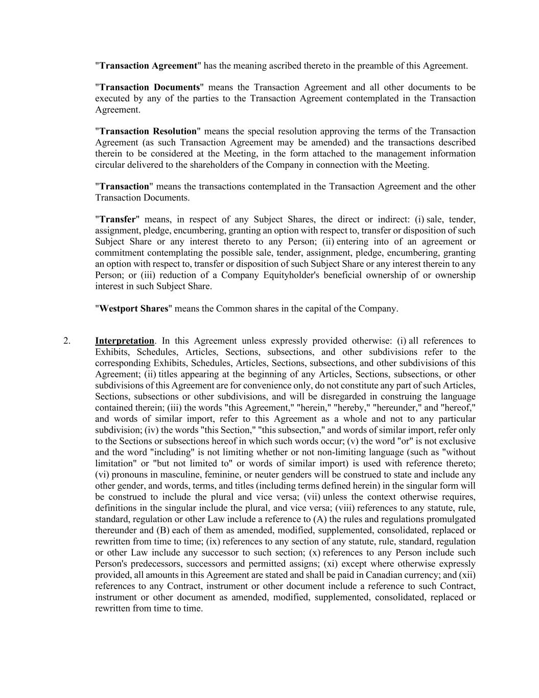 "Transaction Agreement" has the meaning ascribed thereto in the preamble of this Agreement. "Transaction Documents" means the Transaction Agreement and all other documents to be executed by any of the parties to the Transaction Agreement contemplated in the Transaction Agreement. "Transaction Resolution" means the special resolution approving the terms of the Transaction Agreement (as such Transaction Agreement may be amended) and the transactions described therein to be considered at the Meeting, in the form attached to the management information circular delivered to the shareholders of the Company in connection with the Meeting. "Transaction" means the transactions contemplated in the Transaction Agreement and the other Transaction Documents. "Transfer" means, in respect of any Subject Shares, the direct or indirect: (i) sale, tender, assignment, pledge, encumbering, granting an option with respect to, transfer or disposition of such Subject Share or any interest thereto to any Person; (ii) entering into of an agreement or commitment contemplating the possible sale, tender, assignment, pledge, encumbering, granting an option with respect to, transfer or disposition of such Subject Share or any interest therein to any Person; or (iii) reduction of a Company Equityholder's beneficial ownership of or ownership interest in such Subject Share. "Westport Shares" means the Common shares in the capital of the Company. 2. Interpretation. In this Agreement unless expressly provided otherwise: (i) all references to Exhibits, Schedules, Articles, Sections, subsections, and other subdivisions refer to the corresponding Exhibits, Schedules, Articles, Sections, subsections, and other subdivisions of this Agreement; (ii) titles appearing at the beginning of any Articles, Sections, subsections, or other subdivisions of this Agreement are for convenience only, do not constitute any part of such Articles, Sections, subsections or other subdivisions, and will be disregarded in construing the language contained therein; (iii) the words "this Agreement," "herein," "hereby," "hereunder," and "hereof," and words of similar import, refer to this Agreement as a whole and not to any particular subdivision; (iv) the words "this Section," "this subsection," and words of similar import, refer only to the Sections or subsections hereof in which such words occur; (v) the word "or" is not exclusive and the word "including" is not limiting whether or not non-limiting language (such as "without limitation" or "but not limited to" or words of similar import) is used with reference thereto; (vi) pronouns in masculine, feminine, or neuter genders will be construed to state and include any other gender, and words, terms, and titles (including terms defined herein) in the singular form will be construed to include the plural and vice versa; (vii) unless the context otherwise requires, definitions in the singular include the plural, and vice versa; (viii) references to any statute, rule, standard, regulation or other Law include a reference to (A) the rules and regulations promulgated thereunder and (B) each of them as amended, modified, supplemented, consolidated, replaced or rewritten from time to time; (ix) references to any section of any statute, rule, standard, regulation or other Law include any successor to such section; (x) references to any Person include such Person's predecessors, successors and permitted assigns; (xi) except where otherwise expressly provided, all amounts in this Agreement are stated and shall be paid in Canadian currency; and (xii) references to any Contract, instrument or other document include a reference to such Contract, instrument or other document as amended, modified, supplemented, consolidated, replaced or rewritten from time to time.