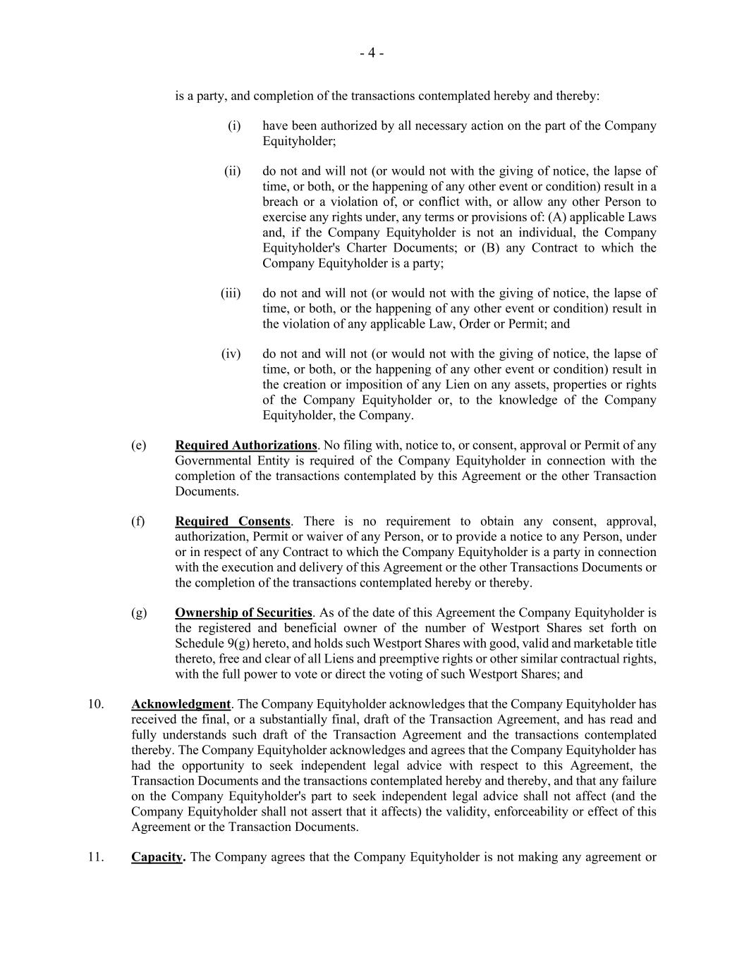 - 4 - is a party, and completion of the transactions contemplated hereby and thereby: (i) have been authorized by all necessary action on the part of the Company Equityholder; (ii) do not and will not (or would not with the giving of notice, the lapse of time, or both, or the happening of any other event or condition) result in a breach or a violation of, or conflict with, or allow any other Person to exercise any rights under, any terms or provisions of: (A) applicable Laws and, if the Company Equityholder is not an individual, the Company Equityholder's Charter Documents; or (B) any Contract to which the Company Equityholder is a party; (iii) do not and will not (or would not with the giving of notice, the lapse of time, or both, or the happening of any other event or condition) result in the violation of any applicable Law, Order or Permit; and (iv) do not and will not (or would not with the giving of notice, the lapse of time, or both, or the happening of any other event or condition) result in the creation or imposition of any Lien on any assets, properties or rights of the Company Equityholder or, to the knowledge of the Company Equityholder, the Company. (e) Required Authorizations. No filing with, notice to, or consent, approval or Permit of any Governmental Entity is required of the Company Equityholder in connection with the completion of the transactions contemplated by this Agreement or the other Transaction Documents. (f) Required Consents. There is no requirement to obtain any consent, approval, authorization, Permit or waiver of any Person, or to provide a notice to any Person, under or in respect of any Contract to which the Company Equityholder is a party in connection with the execution and delivery of this Agreement or the other Transactions Documents or the completion of the transactions contemplated hereby or thereby. (g) Ownership of Securities. As of the date of this Agreement the Company Equityholder is the registered and beneficial owner of the number of Westport Shares set forth on Schedule 9(g) hereto, and holds such Westport Shares with good, valid and marketable title thereto, free and clear of all Liens and preemptive rights or other similar contractual rights, with the full power to vote or direct the voting of such Westport Shares; and 10. Acknowledgment. The Company Equityholder acknowledges that the Company Equityholder has received the final, or a substantially final, draft of the Transaction Agreement, and has read and fully understands such draft of the Transaction Agreement and the transactions contemplated thereby. The Company Equityholder acknowledges and agrees that the Company Equityholder has had the opportunity to seek independent legal advice with respect to this Agreement, the Transaction Documents and the transactions contemplated hereby and thereby, and that any failure on the Company Equityholder's part to seek independent legal advice shall not affect (and the Company Equityholder shall not assert that it affects) the validity, enforceability or effect of this Agreement or the Transaction Documents. 11. Capacity. The Company agrees that the Company Equityholder is not making any agreement or