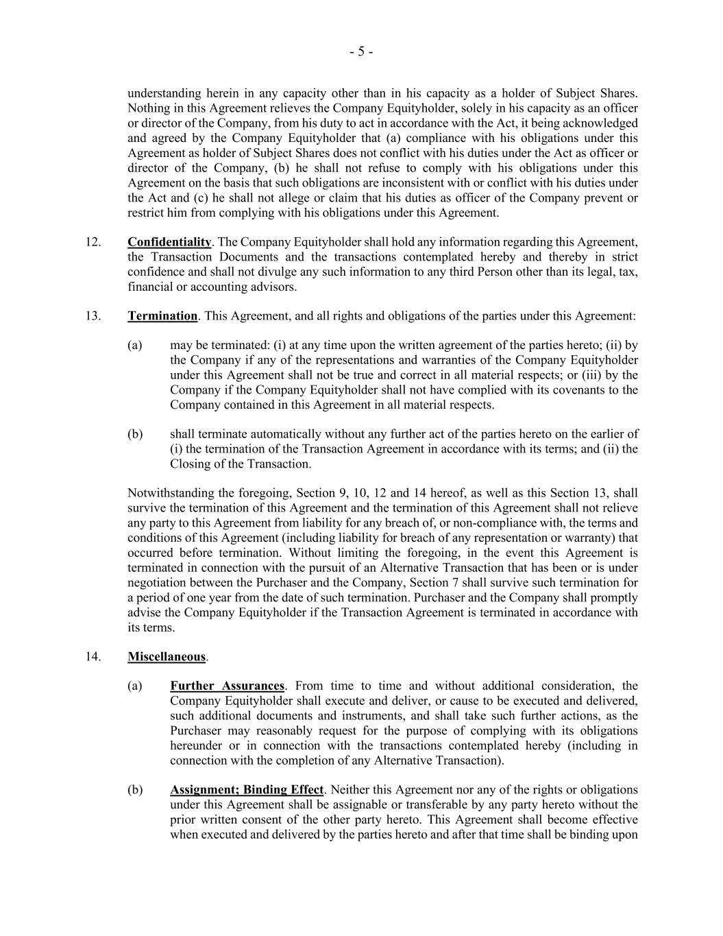 - 5 - understanding herein in any capacity other than in his capacity as a holder of Subject Shares. Nothing in this Agreement relieves the Company Equityholder, solely in his capacity as an officer or director of the Company, from his duty to act in accordance with the Act, it being acknowledged and agreed by the Company Equityholder that (a) compliance with his obligations under this Agreement as holder of Subject Shares does not conflict with his duties under the Act as officer or director of the Company, (b) he shall not refuse to comply with his obligations under this Agreement on the basis that such obligations are inconsistent with or conflict with his duties under the Act and (c) he shall not allege or claim that his duties as officer of the Company prevent or restrict him from complying with his obligations under this Agreement. 12. Confidentiality. The Company Equityholder shall hold any information regarding this Agreement, the Transaction Documents and the transactions contemplated hereby and thereby in strict confidence and shall not divulge any such information to any third Person other than its legal, tax, financial or accounting advisors. 13. Termination. This Agreement, and all rights and obligations of the parties under this Agreement: (a) may be terminated: (i) at any time upon the written agreement of the parties hereto; (ii) by the Company if any of the representations and warranties of the Company Equityholder under this Agreement shall not be true and correct in all material respects; or (iii) by the Company if the Company Equityholder shall not have complied with its covenants to the Company contained in this Agreement in all material respects. (b) shall terminate automatically without any further act of the parties hereto on the earlier of (i) the termination of the Transaction Agreement in accordance with its terms; and (ii) the Closing of the Transaction. Notwithstanding the foregoing, Section 9, 10, 12 and 14 hereof, as well as this Section 13, shall survive the termination of this Agreement and the termination of this Agreement shall not relieve any party to this Agreement from liability for any breach of, or non-compliance with, the terms and conditions of this Agreement (including liability for breach of any representation or warranty) that occurred before termination. Without limiting the foregoing, in the event this Agreement is terminated in connection with the pursuit of an Alternative Transaction that has been or is under negotiation between the Purchaser and the Company, Section 7 shall survive such termination for a period of one year from the date of such termination. Purchaser and the Company shall promptly advise the Company Equityholder if the Transaction Agreement is terminated in accordance with its terms. 14. Miscellaneous. (a) Further Assurances. From time to time and without additional consideration, the Company Equityholder shall execute and deliver, or cause to be executed and delivered, such additional documents and instruments, and shall take such further actions, as the Purchaser may reasonably request for the purpose of complying with its obligations hereunder or in connection with the transactions contemplated hereby (including in connection with the completion of any Alternative Transaction). (b) Assignment; Binding Effect. Neither this Agreement nor any of the rights or obligations under this Agreement shall be assignable or transferable by any party hereto without the prior written consent of the other party hereto. This Agreement shall become effective when executed and delivered by the parties hereto and after that time shall be binding upon