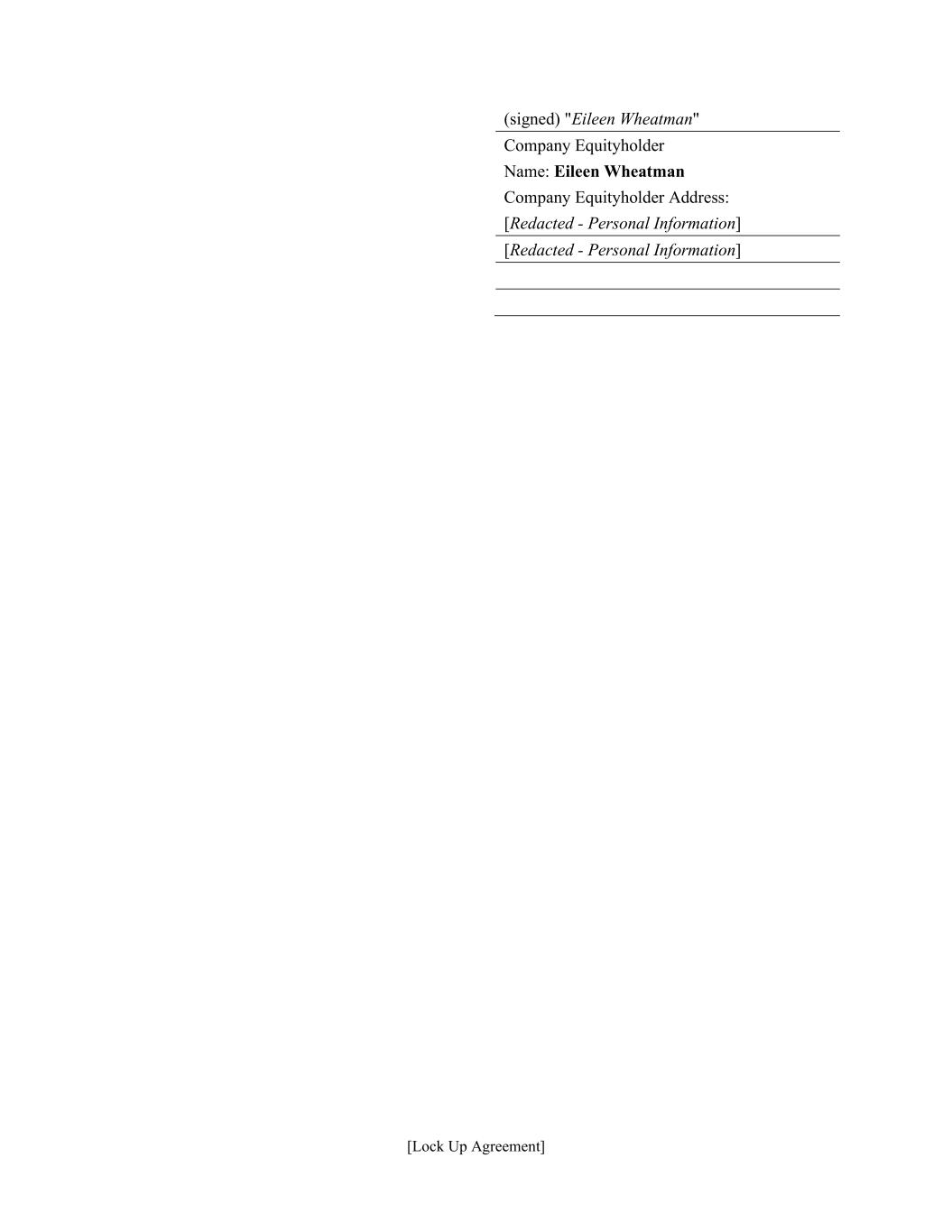 [Lock Up Agreement] (signed) "Eileen Wheatman" Company Equityholder Name: Eileen Wheatman Company Equityholder Address: [Redacted - Personal Information] [Redacted - Personal Information]
