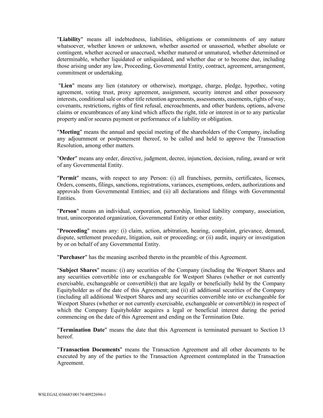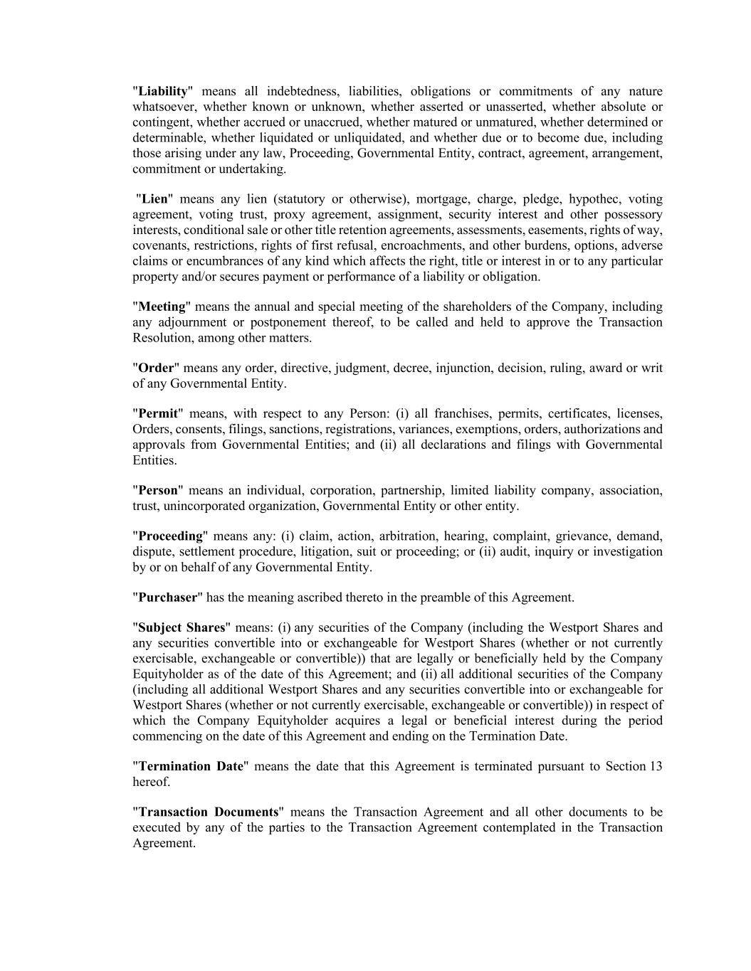 "Liability" means all indebtedness, liabilities, obligations or commitments of any nature whatsoever, whether known or unknown, whether asserted or unasserted, whether absolute or contingent, whether accrued or unaccrued, whether matured or unmatured, whether determined or determinable, whether liquidated or unliquidated, and whether due or to become due, including those arising under any law, Proceeding, Governmental Entity, contract, agreement, arrangement, commitment or undertaking. "Lien" means any lien (statutory or otherwise), mortgage, charge, pledge, hypothec, voting agreement, voting trust, proxy agreement, assignment, security interest and other possessory interests, conditional sale or other title retention agreements, assessments, easements, rights of way, covenants, restrictions, rights of first refusal, encroachments, and other burdens, options, adverse claims or encumbrances of any kind which affects the right, title or interest in or to any particular property and/or secures payment or performance of a liability or obligation. "Meeting" means the annual and special meeting of the shareholders of the Company, including any adjournment or postponement thereof, to be called and held to approve the Transaction Resolution, among other matters. "Order" means any order, directive, judgment, decree, injunction, decision, ruling, award or writ of any Governmental Entity. "Permit" means, with respect to any Person: (i) all franchises, permits, certificates, licenses, Orders, consents, filings, sanctions, registrations, variances, exemptions, orders, authorizations and approvals from Governmental Entities; and (ii) all declarations and filings with Governmental Entities. "Person" means an individual, corporation, partnership, limited liability company, association, trust, unincorporated organization, Governmental Entity or other entity. "Proceeding" means any: (i) claim, action, arbitration, hearing, complaint, grievance, demand, dispute, settlement procedure, litigation, suit or proceeding; or (ii) audit, inquiry or investigation by or on behalf of any Governmental Entity. "Purchaser" has the meaning ascribed thereto in the preamble of this Agreement. "Subject Shares" means: (i) any securities of the Company (including the Westport Shares and any securities convertible into or exchangeable for Westport Shares (whether or not currently exercisable, exchangeable or convertible)) that are legally or beneficially held by the Company Equityholder as of the date of this Agreement; and (ii) all additional securities of the Company (including all additional Westport Shares and any securities convertible into or exchangeable for Westport Shares (whether or not currently exercisable, exchangeable or convertible)) in respect of which the Company Equityholder acquires a legal or beneficial interest during the period commencing on the date of this Agreement and ending on the Termination Date. "Termination Date" means the date that this Agreement is terminated pursuant to Section 13 hereof. "Transaction Documents" means the Transaction Agreement and all other documents to be executed by any of the parties to the Transaction Agreement contemplated in the Transaction Agreement.