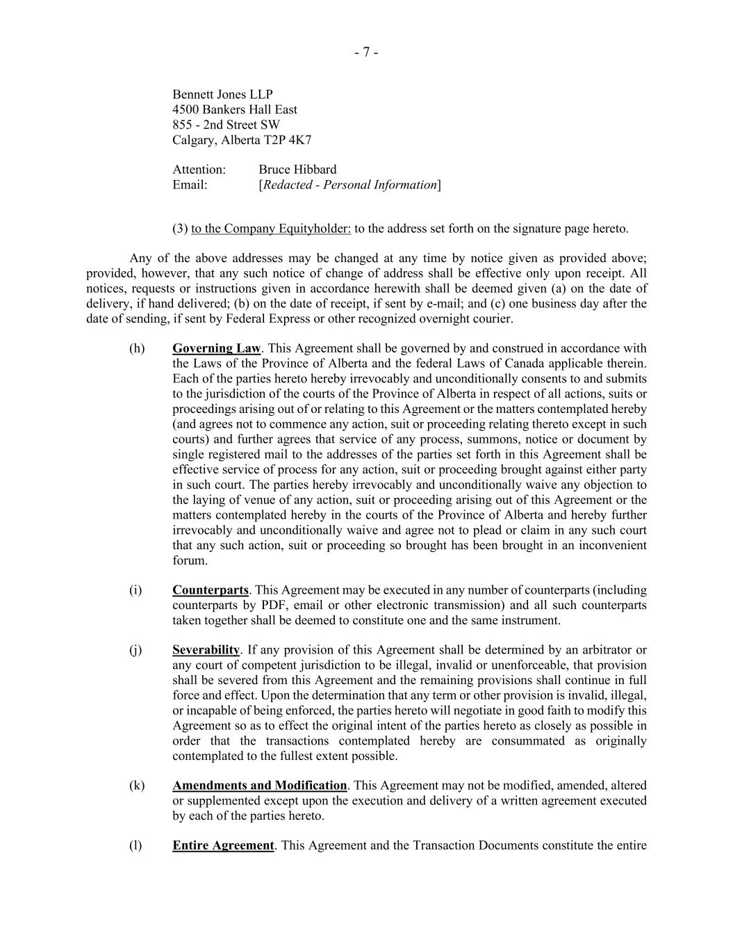 - 7 - Bennett Jones LLP 4500 Bankers Hall East 855 - 2nd Street SW Calgary, Alberta T2P 4K7 Attention: Bruce Hibbard Email: [Redacted - Personal Information] (3) to the Company Equityholder: to the address set forth on the signature page hereto. Any of the above addresses may be changed at any time by notice given as provided above; provided, however, that any such notice of change of address shall be effective only upon receipt. All notices, requests or instructions given in accordance herewith shall be deemed given (a) on the date of delivery, if hand delivered; (b) on the date of receipt, if sent by e-mail; and (c) one business day after the date of sending, if sent by Federal Express or other recognized overnight courier. (h) Governing Law. This Agreement shall be governed by and construed in accordance with the Laws of the Province of Alberta and the federal Laws of Canada applicable therein. Each of the parties hereto hereby irrevocably and unconditionally consents to and submits to the jurisdiction of the courts of the Province of Alberta in respect of all actions, suits or proceedings arising out of or relating to this Agreement or the matters contemplated hereby (and agrees not to commence any action, suit or proceeding relating thereto except in such courts) and further agrees that service of any process, summons, notice or document by single registered mail to the addresses of the parties set forth in this Agreement shall be effective service of process for any action, suit or proceeding brought against either party in such court. The parties hereby irrevocably and unconditionally waive any objection to the laying of venue of any action, suit or proceeding arising out of this Agreement or the matters contemplated hereby in the courts of the Province of Alberta and hereby further irrevocably and unconditionally waive and agree not to plead or claim in any such court that any such action, suit or proceeding so brought has been brought in an inconvenient forum. (i) Counterparts. This Agreement may be executed in any number of counterparts (including counterparts by PDF, email or other electronic transmission) and all such counterparts taken together shall be deemed to constitute one and the same instrument. (j) Severability. If any provision of this Agreement shall be determined by an arbitrator or any court of competent jurisdiction to be illegal, invalid or unenforceable, that provision shall be severed from this Agreement and the remaining provisions shall continue in full force and effect. Upon the determination that any term or other provision is invalid, illegal, or incapable of being enforced, the parties hereto will negotiate in good faith to modify this Agreement so as to effect the original intent of the parties hereto as closely as possible in order that the transactions contemplated hereby are consummated as originally contemplated to the fullest extent possible. (k) Amendments and Modification. This Agreement may not be modified, amended, altered or supplemented except upon the execution and delivery of a written agreement executed by each of the parties hereto. (l) Entire Agreement. This Agreement and the Transaction Documents constitute the entire