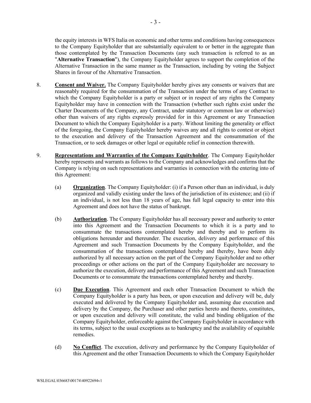 - 3 - the equity interests in WFS Italia on economic and other terms and conditions having consequences to the Company Equityholder that are substantially equivalent to or better in the aggregate than those contemplated by the Transaction Documents (any such transaction is referred to as an "Alternative Transaction"), the Company Equityholder agrees to support the completion of the Alternative Transaction in the same manner as the Transaction, including by voting the Subject Shares in favour of the Alternative Transaction. 8. Consent and Waiver. The Company Equityholder hereby gives any consents or waivers that are reasonably required for the consummation of the Transaction under the terms of any Contract to which the Company Equityholder is a party or subject or in respect of any rights the Company Equityholder may have in connection with the Transaction (whether such rights exist under the Charter Documents of the Company, any Contract, under statutory or common law or otherwise) other than waivers of any rights expressly provided for in this Agreement or any Transaction Document to which the Company Equityholder is a party. Without limiting the generality or effect of the foregoing, the Company Equityholder hereby waives any and all rights to contest or object to the execution and delivery of the Transaction Agreement and the consummation of the Transaction, or to seek damages or other legal or equitable relief in connection therewith. 9. Representations and Warranties of the Company Equityholder. The Company Equityholder hereby represents and warrants as follows to the Company and acknowledges and confirms that the Company is relying on such representations and warranties in connection with the entering into of this Agreement: (a) Organization. The Company Equityholder: (i) if a Person other than an individual, is duly organized and validly existing under the laws of the jurisdiction of its existence; and (ii) if an individual, is not less than 18 years of age, has full legal capacity to enter into this Agreement and does not have the status of bankrupt. (b) Authorization. The Company Equityholder has all necessary power and authority to enter into this Agreement and the Transaction Documents to which it is a party and to consummate the transactions contemplated hereby and thereby and to perform its obligations hereunder and thereunder. The execution, delivery and performance of this Agreement and such Transaction Documents by the Company Equityholder, and the consummation of the transactions contemplated hereby and thereby, have been duly authorized by all necessary action on the part of the Company Equityholder and no other proceedings or other actions on the part of the Company Equityholder are necessary to authorize the execution, delivery and performance of this Agreement and such Transaction Documents or to consummate the transactions contemplated hereby and thereby. (c) Due Execution. This Agreement and each other Transaction Document to which the Company Equityholder is a party has been, or upon execution and delivery will be, duly executed and delivered by the Company Equityholder and, assuming due execution and delivery by the Company, the Purchaser and other parties hereto and thereto, constitutes, or upon execution and delivery will constitute, the valid and binding obligation of the Company Equityholder, enforceable against the Company Equityholder in accordance with its terms, subject to the usual exceptions as to bankruptcy and the availability of equitable remedies. (d) No Conflict. The execution, delivery and performance by the Company Equityholder of this Agreement and the other Transaction Documents to which the Company Equityholder