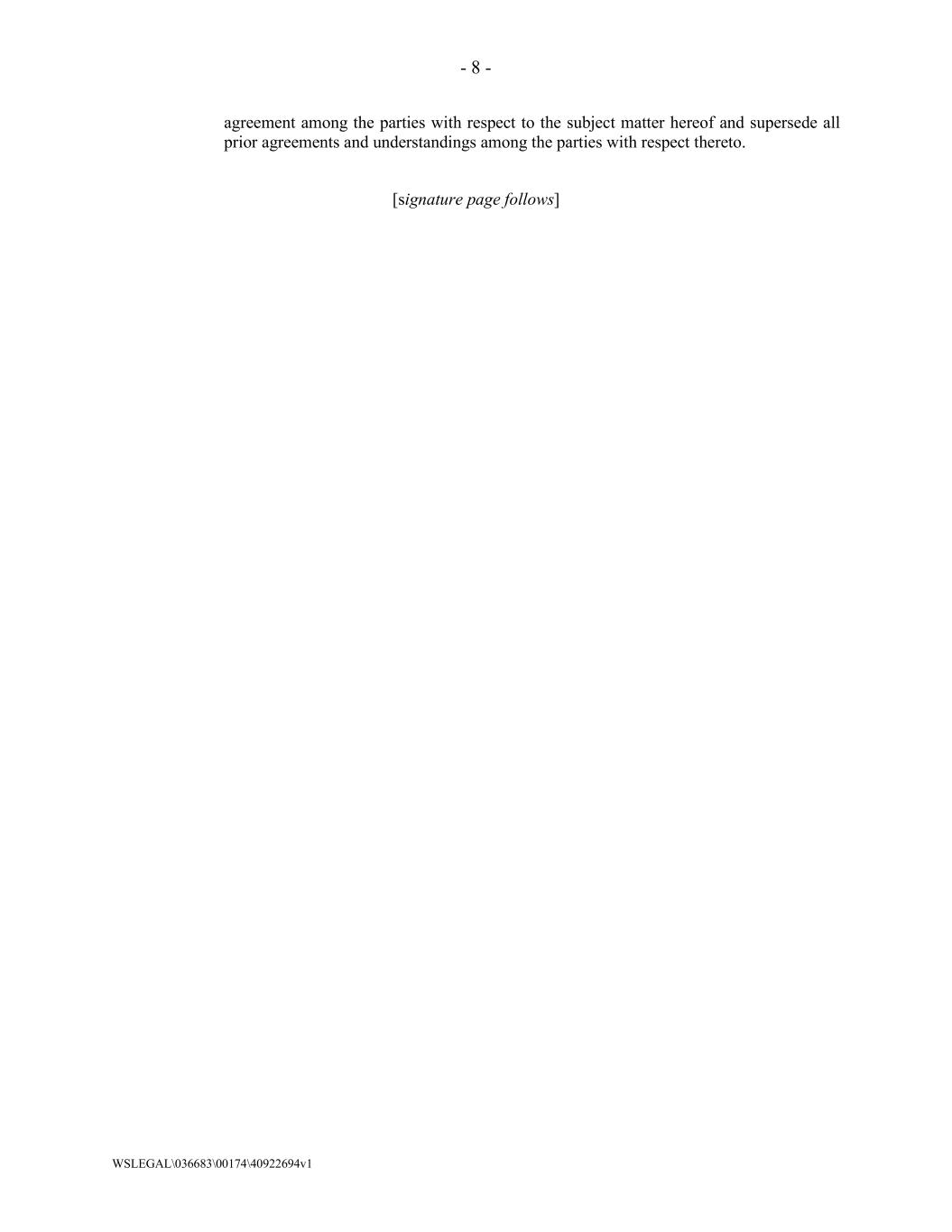WSLEGAL\036683\00174\40922694v1 - 8 - agreement among the parties with respect to the subject matter hereof and supersede all prior agreements and understandings among the parties with respect thereto. [signature page follows]