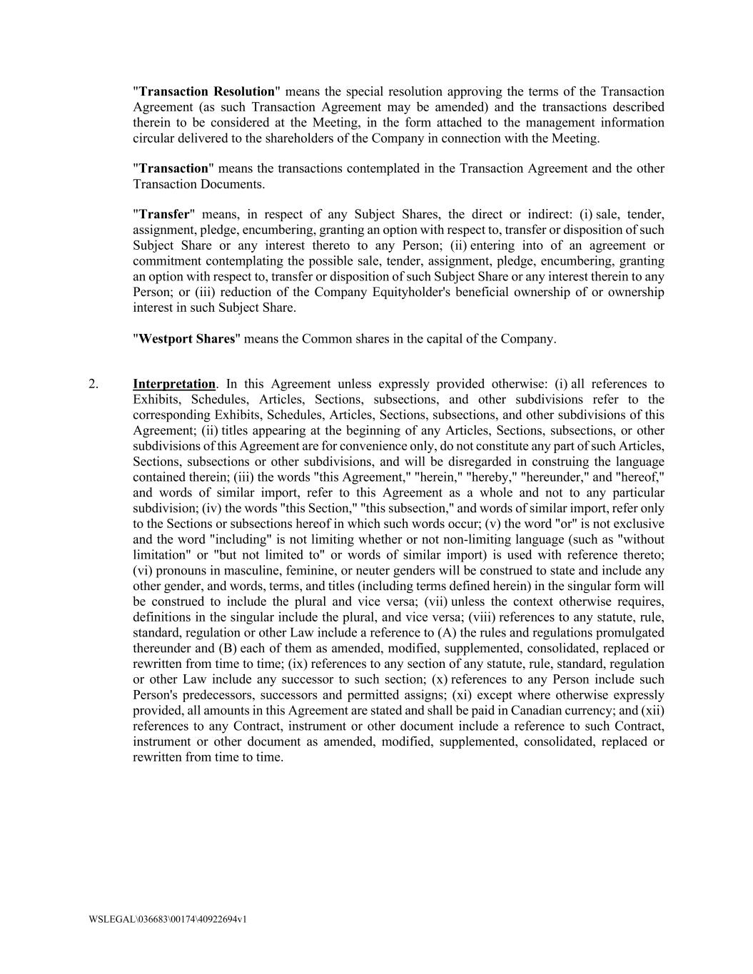 WSLEGAL\036683\00174\40922633v1 "Transaction Resolution" means the special resolution approving the terms of the Transaction Agreement (as such Transaction Agreement may be amended) and the transactions described therein to be considered at the Meeting, in the form attached to the management information circular delivered to the shareholders of the Company in connection with the Meeting. "Transaction" means the transactions contemplated in the Transaction Agreement and the other Transaction Documents. "Transfer" means, in respect of any Subject Shares, the direct or indirect: (i) sale, tender, assignment, pledge, encumbering, granting an option with respect to, transfer or disposition of such Subject Share or any interest thereto to any Person; (ii) entering into of an agreement or commitment contemplating the possible sale, tender, assignment, pledge, encumbering, granting an option with respect to, transfer or disposition of such Subject Share or any interest therein to any Person; or (iii) reduction of the Company Equityholder's beneficial ownership of or ownership interest in such Subject Share. "Westport Shares" means the Common shares in the capital of the Company. 2. Interpretation. In this Agreement unless expressly provided otherwise: (i) all references to Exhibits, Schedules, Articles, Sections, subsections, and other subdivisions refer to the corresponding Exhibits, Schedules, Articles, Sections, subsections, and other subdivisions of this Agreement; (ii) titles appearing at the beginning of any Articles, Sections, subsections, or other subdivisions of this Agreement are for convenience only, do not constitute any part of such Articles, Sections, subsections or other subdivisions, and will be disregarded in construing the language contained therein; (iii) the words "this Agreement," "herein," "hereby," "hereunder," and "hereof," and words of similar import, refer to this Agreement as a whole and not to any particular subdivision; (iv) the words "this Section," "this subsection," and words of similar import, refer only to the Sections or subsections hereof in which such words occur; (v) the word "or" is not exclusive and the word "including" is not limiting whether or not non-limiting language (such as "without limitation" or "but not limited to" or words of similar import) is used with reference thereto; (vi) pronouns in masculine, feminine, or neuter genders will be construed to state and include any other gender, and words, terms, and titles (including terms defined herein) in the singular form will be construed to include the plural and vice versa; (vii) unless the context otherwise requires, definitions in the singular include the plural, and vice versa; (viii) references to any statute, rule, standard, regulation or other Law include a reference to (A) the rules and regulations promulgated thereunder and (B) each of them as amended, modified, supplemented, consolidated, replaced or rewritten from time to time; (ix) references to any section of any statute, rule, standard, regulation or other Law include any successor to such section; (x) references to any Person include such Person's predecessors, successors and permitted assigns; (xi) except where otherwise expressly provided, all amounts in this Agreement are stated and shall be paid in Canadian currency; and (xii) references to any Contract, instrument or other document include a reference to such Contract, instrument or other document as amended, modified, supplemented, consolidated, replaced or rewritten from time to time.