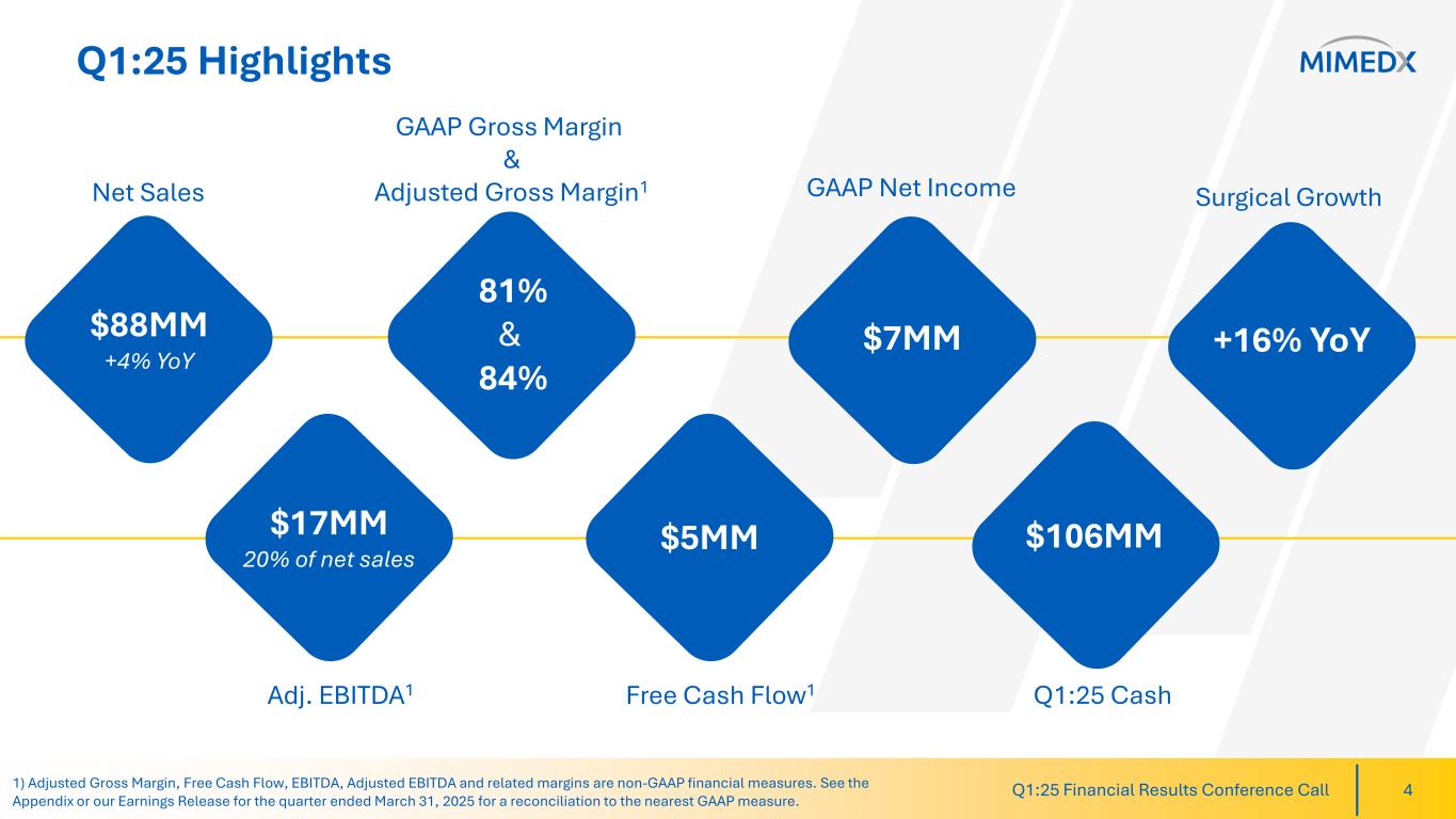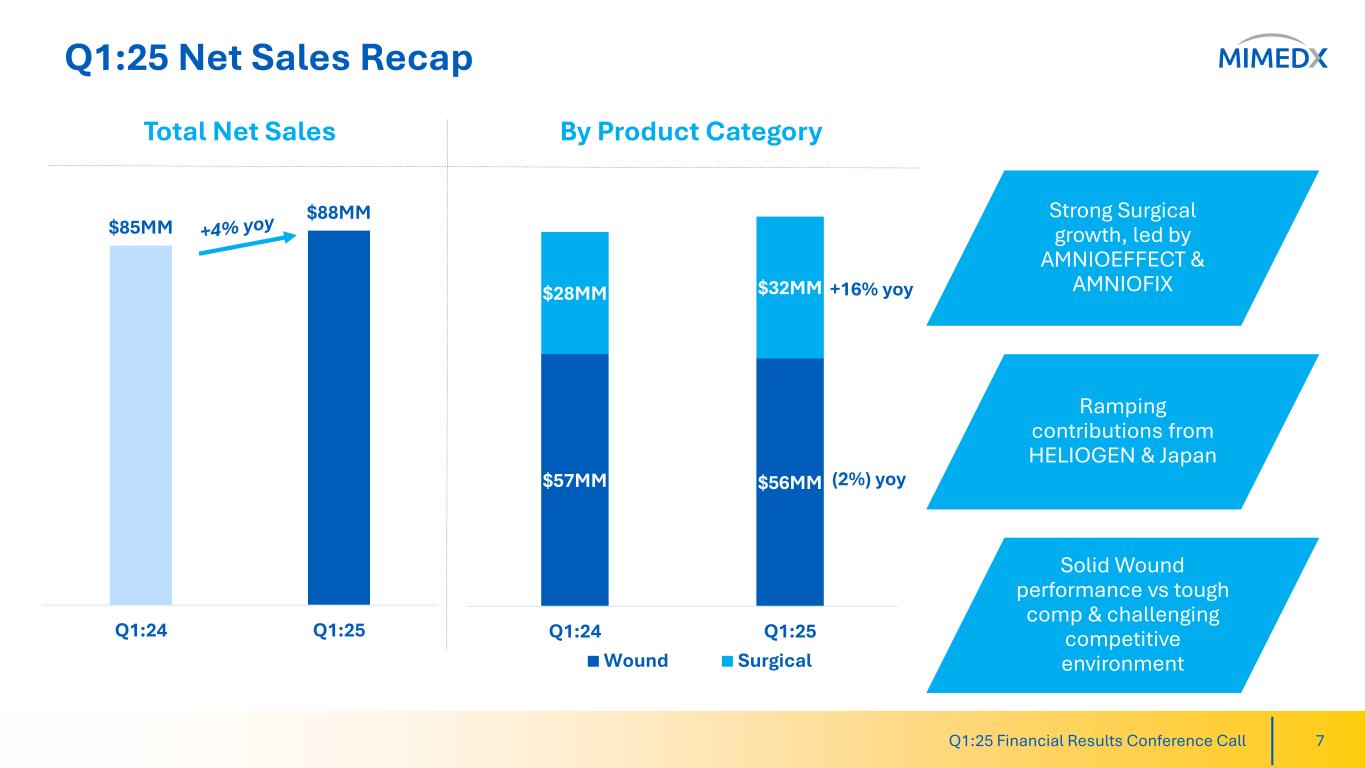MIMEDX reported net sales for the three months ended March 31, 2025, of $88 million, compared to $85 million for the three months ended March 31, 2024, an increase of 4%. The increase was primarily driven by 16% growth of our Surgical products, including AMNIOEFFECT® and contributions from HELIOGEN™. First quarter decline of Wound products was 2% compared to the prior year period.