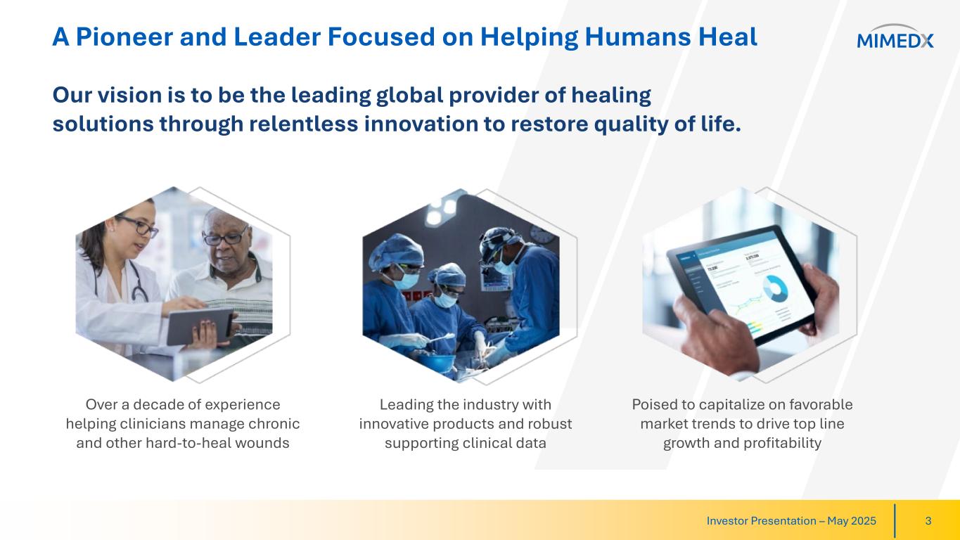 MIMEDX is a pioneer and leader focused on helping humans heal. With more than a decade of helping clinicians manage chronic and other hard-to-heal wounds, MIMEDX is dedicated to providing a leading portfolio of products for applications in the wound care, burn, and surgical sectors of healthcare. The Company’s vision is to be the leading global provider of healing solutions through relentless innovation to restore quality of life. For additional information, please visit www.mimedx.com.