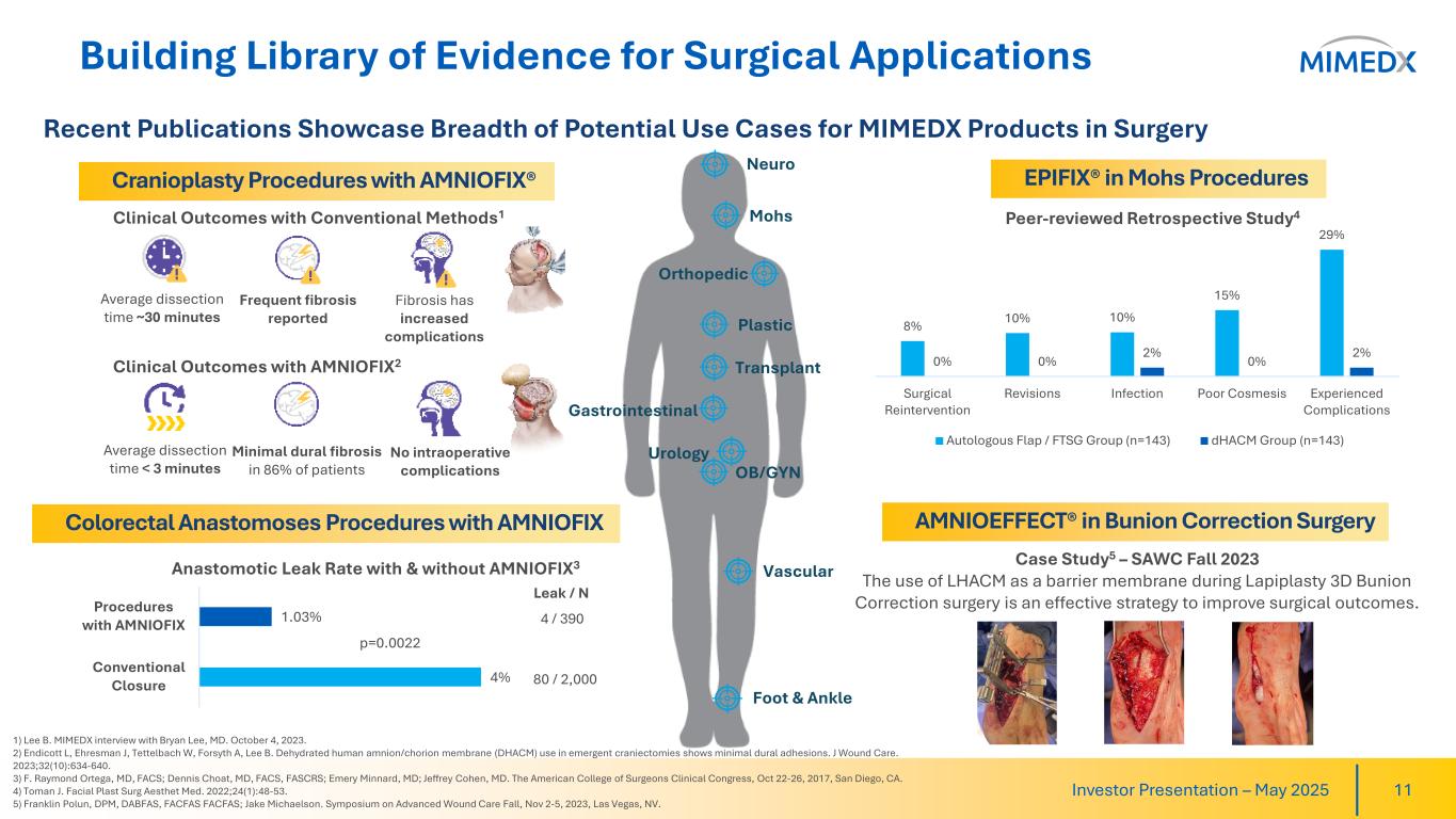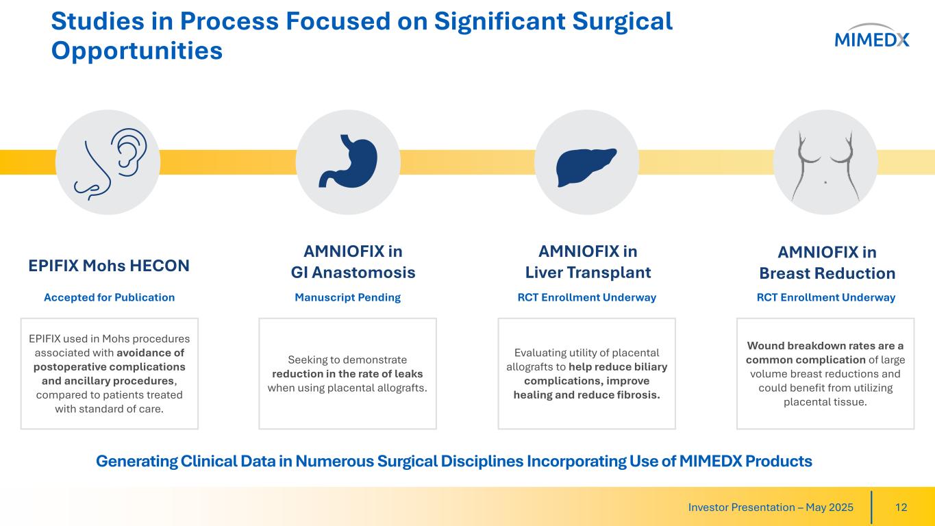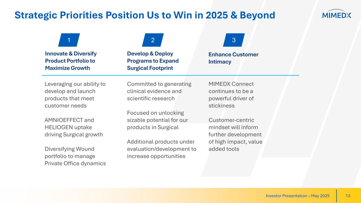 Joseph H. Capper, MIMEDX Chief Executive Officer, commented, "Our solid first quarter 2025 results include total net sales growth of 4% year-over-year and an Adjusted EBITDA margin of 20%. Our Surgical products recorded double-digit growth during the quarter, and we are continuing to see our efforts to build a compelling body of clinical evidence in this space unlock sizable opportunities for our products."