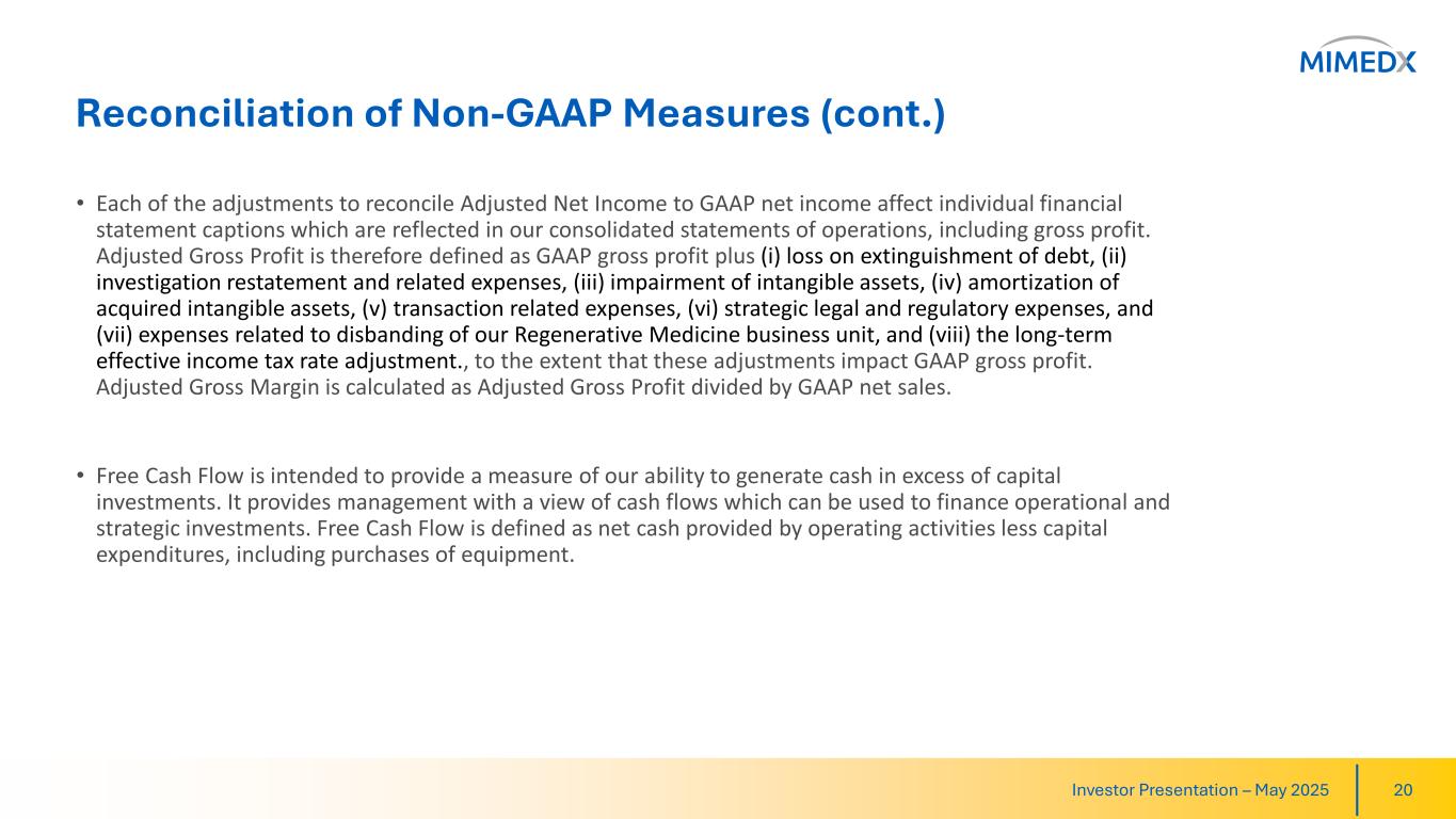 Adjusted Earnings Per Share is intended to provide a normalized view of earnings per share by removing items that may be irregular, one-time, or non-recurring from net income. This enables us to identify underlying trends in our business that could otherwise be masked by such items. Adjusted Earnings Per Share consists of GAAP diluted net income per common share including adjustments for (i) loss on extinguishment of debt, (ii) investigation restatement and related expenses, (iii) amortization of acquired intangible assets, (iv) transaction related expenses, (v) strategic legal and regulatory expenses, (vi) expenses related to disbanding of our Regenerative Medicine business unit, and (vii) the long-term effective income tax rate adjustment.
