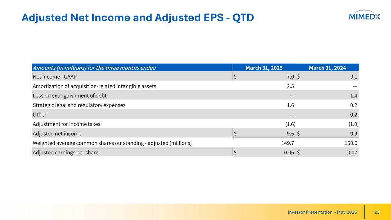 Adjusted Net Income is defined as GAAP net income plus (i) loss on extinguishment of debt, (ii) investigation restatement and related expenses, (iii) impairment of intangible assets, (iv) amortization of acquired intangible assets, (v) strategic legal and regulatory expenses, (vi) transaction-related expenses, and (vii) expenses related to disbanding of our Regenerative Medicine business unit, and (viii) the long-term effective income tax rate adjustment.