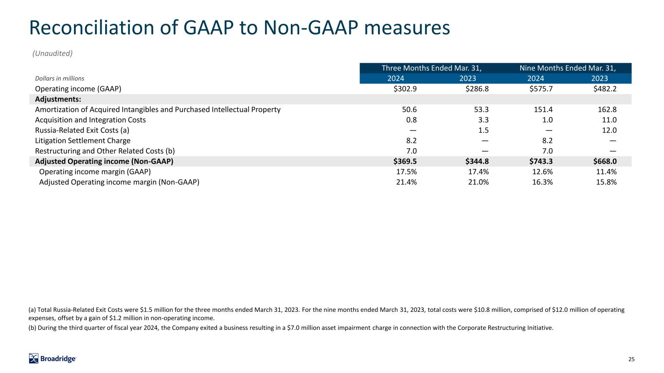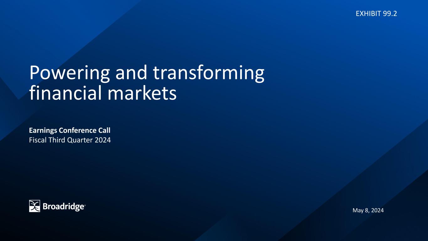 ニューヨーク、2024年5月8日 - ブロードリッジ・ファイナンシャル・ソリューションズ(NYSE:BR)は本日、2024会計年度第3四半期(2024年3月31日終了)の業績を発表しました。前年同期と比較した業績は以下のとおりです: