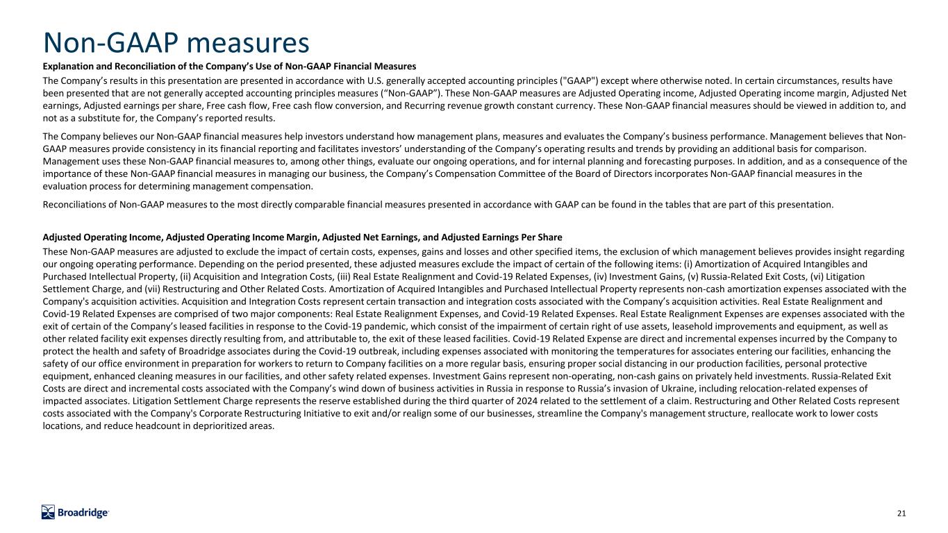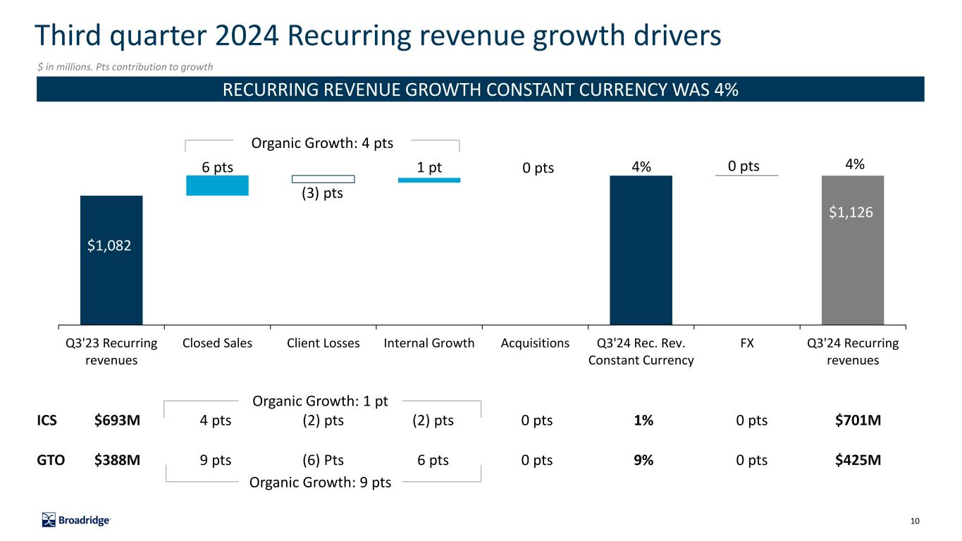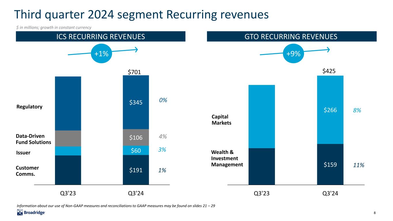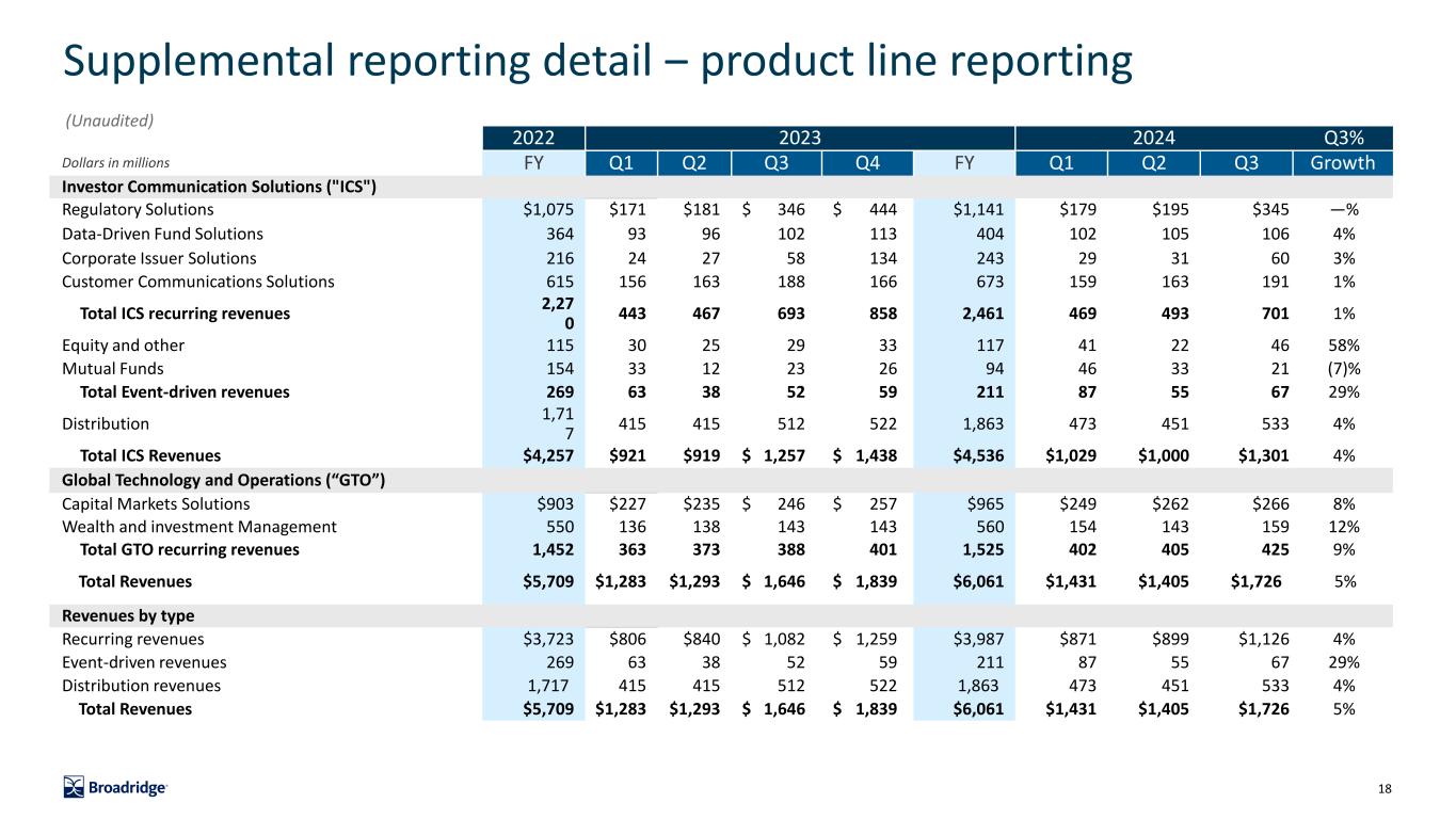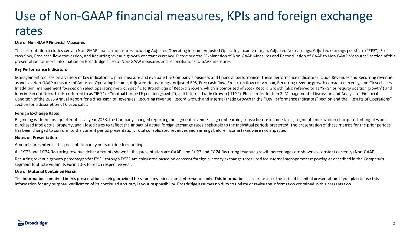 「ブロードリッジは長期的な成長に向けて良好な態勢を維持しており、3年間の成長目標(経常収益5~8%増、経常収益合計7~9%増(恒常為替レートベース)、調整後EPS8~12%増)の達成に向けて順調に進んでいます。