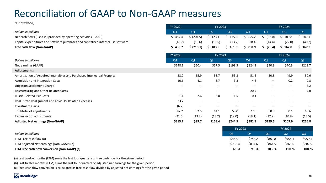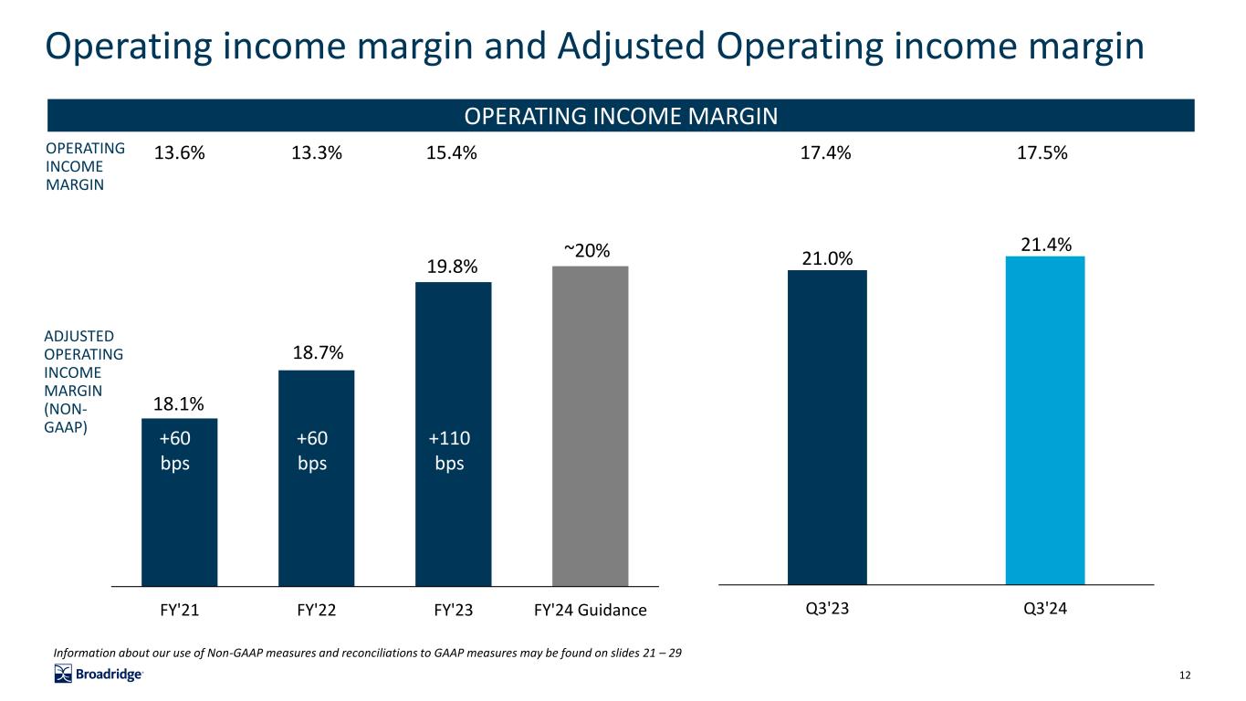 「第4四半期に入り、ブロードリッジは今年も着実で安定した成長を遂げる態勢が整いました。2024年度については、経常収益の恒常為替レートベース成長率はガイダンス・レンジの下限である6~9%を見込んでおり、調整後EPS成長率はレンジの中間である8~12%になるとの見通しを再確認しています。また、通期の目標であるフリー・フロー転換率100%も達成できる見込みで、タック・インM&Aの資金を調達しながら株主への追加資本還元を行うことができます」とゴーキーは付け加えました。