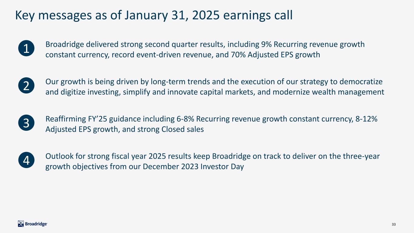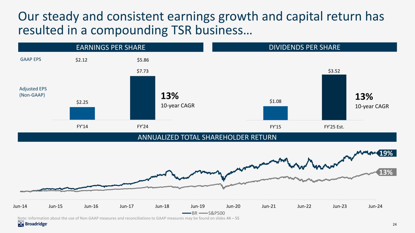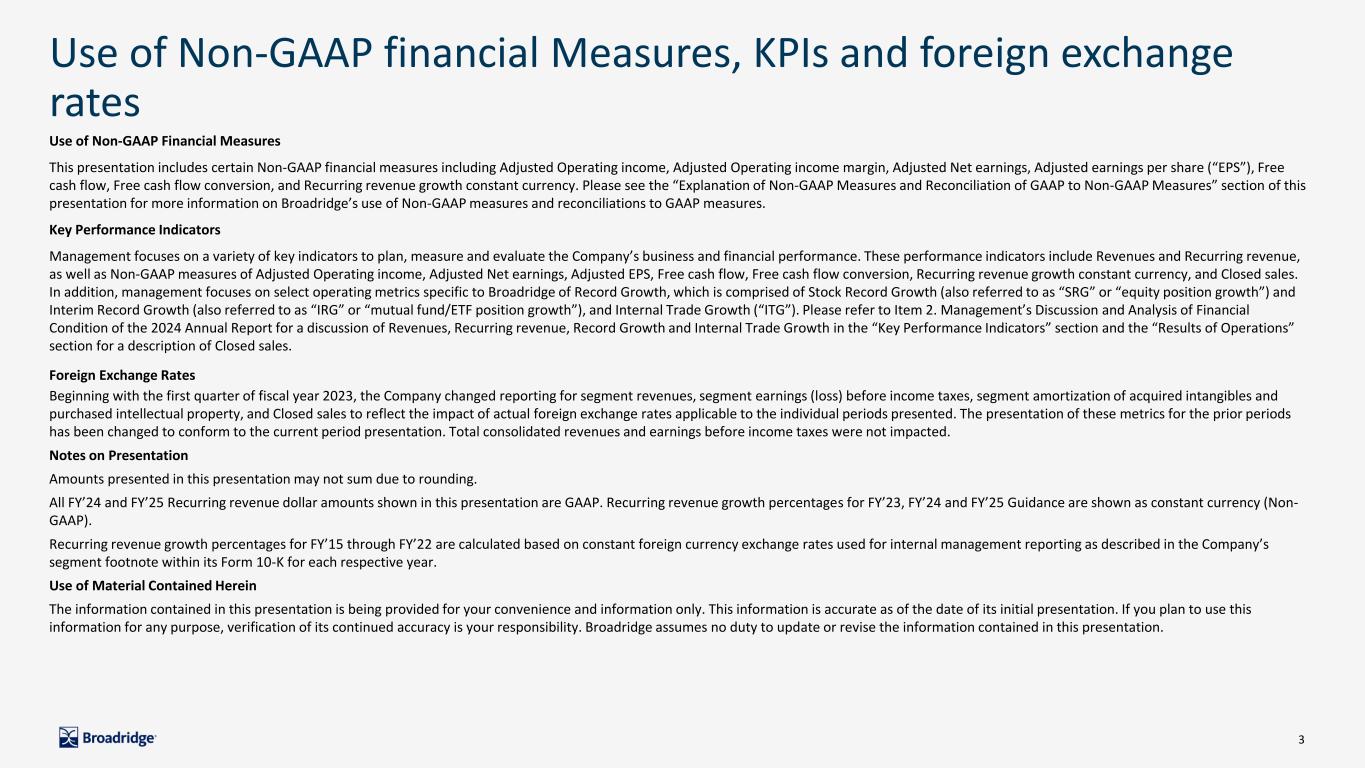 2 Forward-Looking Statements This presentation and other written or oral statements made from time to time by representatives of Broadridge Financial Solutions, Inc. ("Broadridge" or the "Company") contains “forward-looking statements” within the meaning of the Private Securities Litigation Reform Act of 1995. Statements that are not historical in nature, and which may be identified by the use of words such as “expects,” “assumes,” “projects,” “anticipates,” “estimates,” “we believe,” “could be,” “on track,” and other words of similar meaning are forward-looking statements. In particular, information appearing in the “Fiscal Year 2025 Guidance” section and statements about our three-year objectives are forward-looking statements. These statements are based on management’s expectations and assumptions and are subject to risks and uncertainties that may cause actual results to differ materially from those expressed. These risks and uncertainties include those risk factors described and discussed in Part I, “Item 1A. Risk Factors” of the Annual Report on Form 10-K for the year ended June 30, 2024 (the “2024 Annual Report”), as they may be updated in any future reports filed with the Securities and Exchange Commission. All forward-looking statements speak only as of the date of this presentation and are expressly qualified in their entirety by reference to the factors discussed in the 2024 Annual Report. These risks include: • Changes in laws and regulations affecting Broadridge’s clients or the services provided by Broadridge; • Broadridge’s reliance on a relatively small number of clients, the continued financial health of those clients, and the continued use by such clients of Broadridge’s services with favorable pricing terms; • A material security breach or cybersecurity attack affecting the information of Broadridge's clients; • Declines in participation and activity in the securities markets; • The failure of Broadridge's key service providers to provide the anticipated levels of service; • A disaster or other significant slowdown or failure of Broadridge’s systems or error in the performance of Broadridge’s services; • Overall market, economic and geopolitical conditions and their impact on the securities markets; • The success of Broadridge in retaining and selling additional services to its existing clients and in obtaining new clients; • Broadridge’s failure to keep pace with changes in technology and demands of its clients; • Competitive conditions; • Broadridge’s ability to attract and retain key personnel; and • The impact of new acquisitions and divestitures. There may be other factors that may cause our actual results to differ materially from the forward-looking statements. Our actual results, performance or achievements could differ materially from those expressed in, or implied by, the forward-looking statements. We can give no assurances that any of the events anticipated by the forward-looking statements will occur or, if any of them do, what impact they will have on our results of operations and financial condition. Broadridge disclaims any obligation to update or revise forward-looking statements that may be made to reflect events or circumstances that arise after the date made or to reflect the occurrence of unanticipated events, other than as required by law.