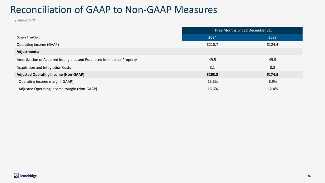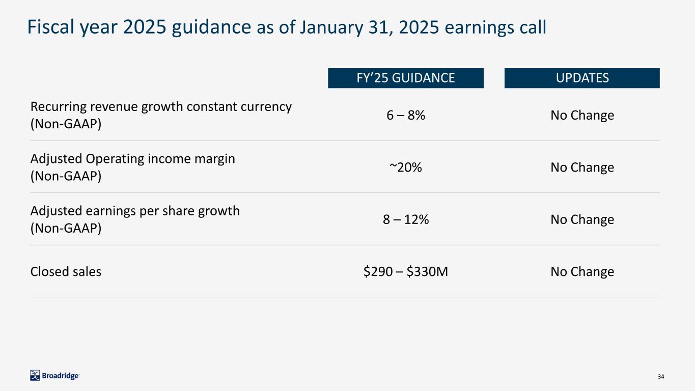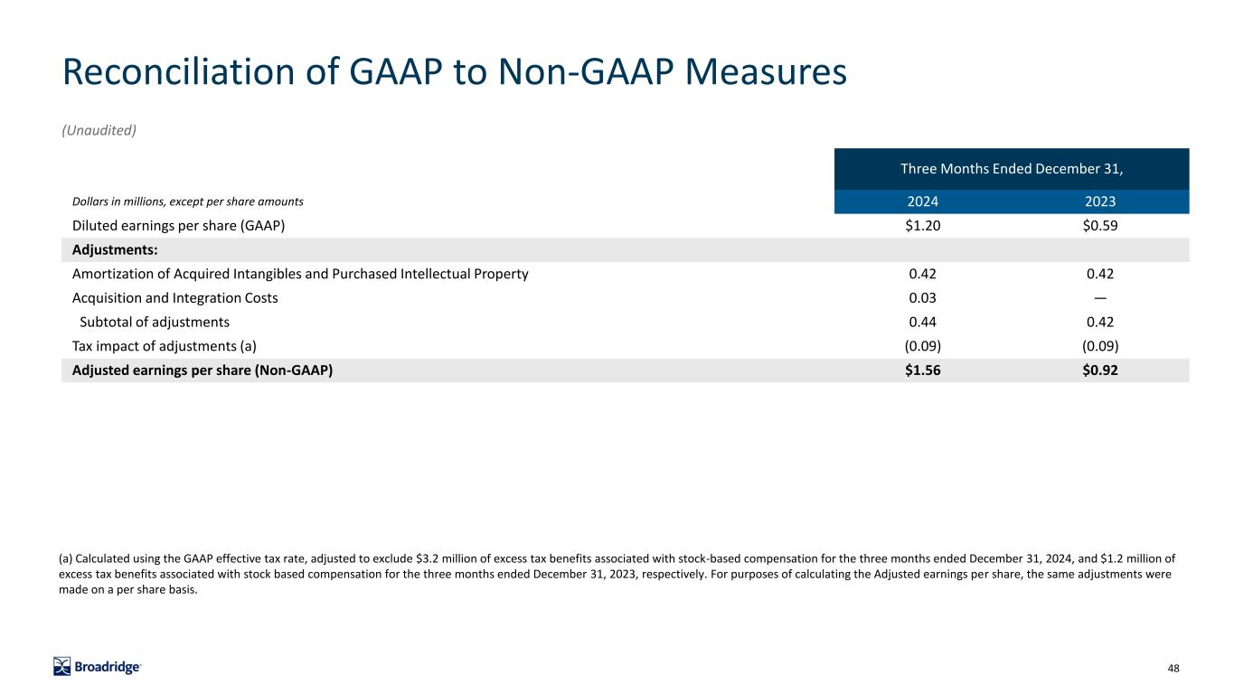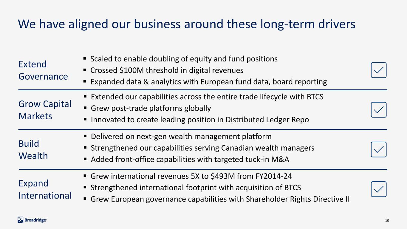 2 Forward-Looking Statements This presentation and other written or oral statements made from time to time by representatives of Broadridge Financial Solutions, Inc. ("Broadridge" or the "Company") contains “forward-looking statements” within the meaning of the Private Securities Litigation Reform Act of 1995. Statements that are not historical in nature, and which may be identified by the use of words such as “expects,” “assumes,” “projects,” “anticipates,” “estimates,” “we believe,” “could be,” “on track,” and other words of similar meaning are forward-looking statements. In particular, information appearing in the “Fiscal Year 2025 Guidance” section and statements about our three-year objectives are forward-looking statements. These statements are based on management’s expectations and assumptions and are subject to risks and uncertainties that may cause actual results to differ materially from those expressed. These risks and uncertainties include those risk factors described and discussed in Part I, “Item 1A. Risk Factors” of the Annual Report on Form 10-K for the year ended June 30, 2024 (the “2024 Annual Report”), as they may be updated in any future reports filed with the Securities and Exchange Commission. All forward-looking statements speak only as of the date of this presentation and are expressly qualified in their entirety by reference to the factors discussed in the 2024 Annual Report. These risks include: • Changes in laws and regulations affecting Broadridge’s clients or the services provided by Broadridge; • Broadridge’s reliance on a relatively small number of clients, the continued financial health of those clients, and the continued use by such clients of Broadridge’s services with favorable pricing terms; • A material security breach or cybersecurity attack affecting the information of Broadridge's clients; • Declines in participation and activity in the securities markets; • The failure of Broadridge's key service providers to provide the anticipated levels of service; • A disaster or other significant slowdown or failure of Broadridge’s systems or error in the performance of Broadridge’s services; • Overall market, economic and geopolitical conditions and their impact on the securities markets; • The success of Broadridge in retaining and selling additional services to its existing clients and in obtaining new clients; • Broadridge’s failure to keep pace with changes in technology and demands of its clients; • Competitive conditions; • Broadridge’s ability to attract and retain key personnel; and • The impact of new acquisitions and divestitures. There may be other factors that may cause our actual results to differ materially from the forward-looking statements. Our actual results, performance or achievements could differ materially from those expressed in, or implied by, the forward-looking statements. We can give no assurances that any of the events anticipated by the forward-looking statements will occur or, if any of them do, what impact they will have on our results of operations and financial condition. Broadridge disclaims any obligation to update or revise forward-looking statements that may be made to reflect events or circumstances that arise after the date made or to reflect the occurrence of unanticipated events, other than as required by law.