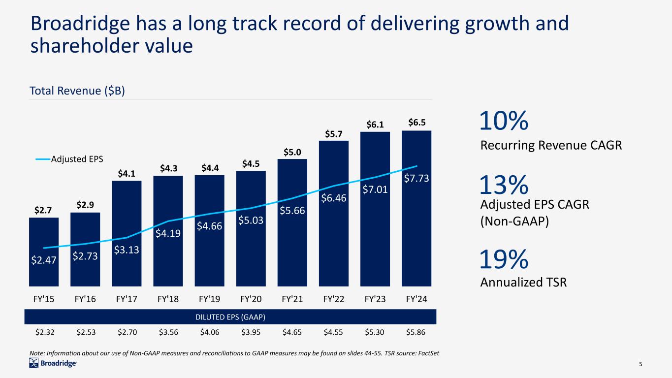 4 Broadridge is powering and transforming financial services Unique network and business model with a clear growth strategy across our three franchises Platform-based model with recurring revenue structure creates unique value for clients and investors Steady and consistent earnings growth and capital return has driven strong and compounding shareholder returns $4.2B FY’24 Recurring revenue 7-9% FY’24-26 Recurring revenue growth objective $60B Vended Addressable Market Global fintech leader with a scale business supporting critical operations, technology, governance, and communications $10T Daily fixed income and equity trade volume 8-12% FY’24-26 Adj. EPS growth objective 19% 10-year TSR annualized ending 6/30/24 $3.52 FY’25 annual dividend amount 7B Regulatory and customer communications processed annuallyNote: Recurring revenue growth is in constant currency. FY’25 dividend subject to board approval.