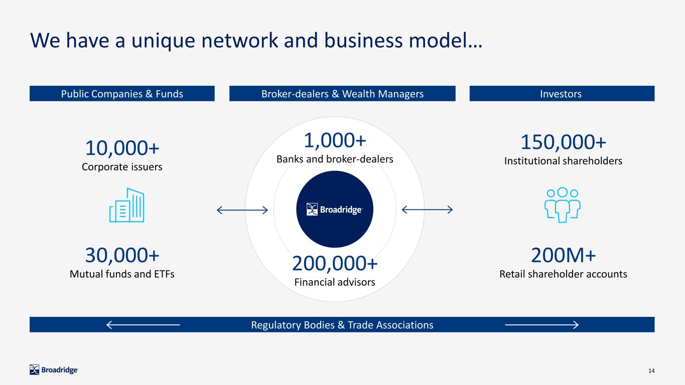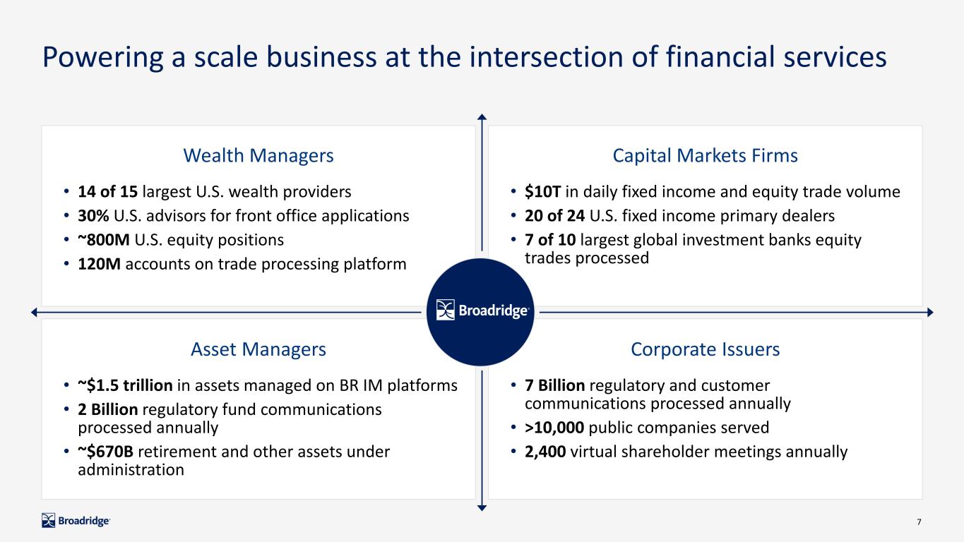 6 We have a unique network and business model Regulatory Bodies & Trade Associations Broker-dealers & Wealth Managers Investors Public Companies & Funds 10,000+ Corporate issuers 1,000+ Banks and broker-dealers 30,000+ Mutual funds and ETFs 200,000+ Financial advisors 150,000+ Institutional shareholders 200M+ Retail shareholder accounts