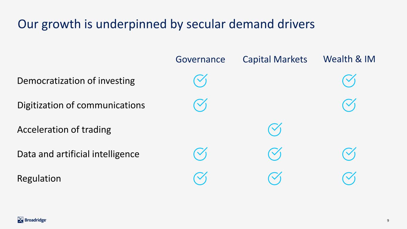 8 We serve a $225B addressable market of which $60B+ is vended Source: McKinsey & Co. Governance Capital Markets Wealth & IM $25B $24B Broadridge Vended Addressable Market 27%73% Total Addressable Market $12B $225B $60BBR Vended