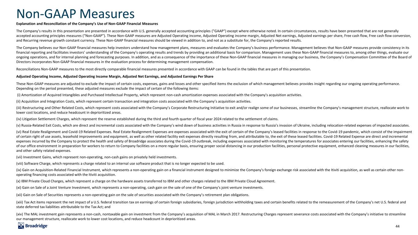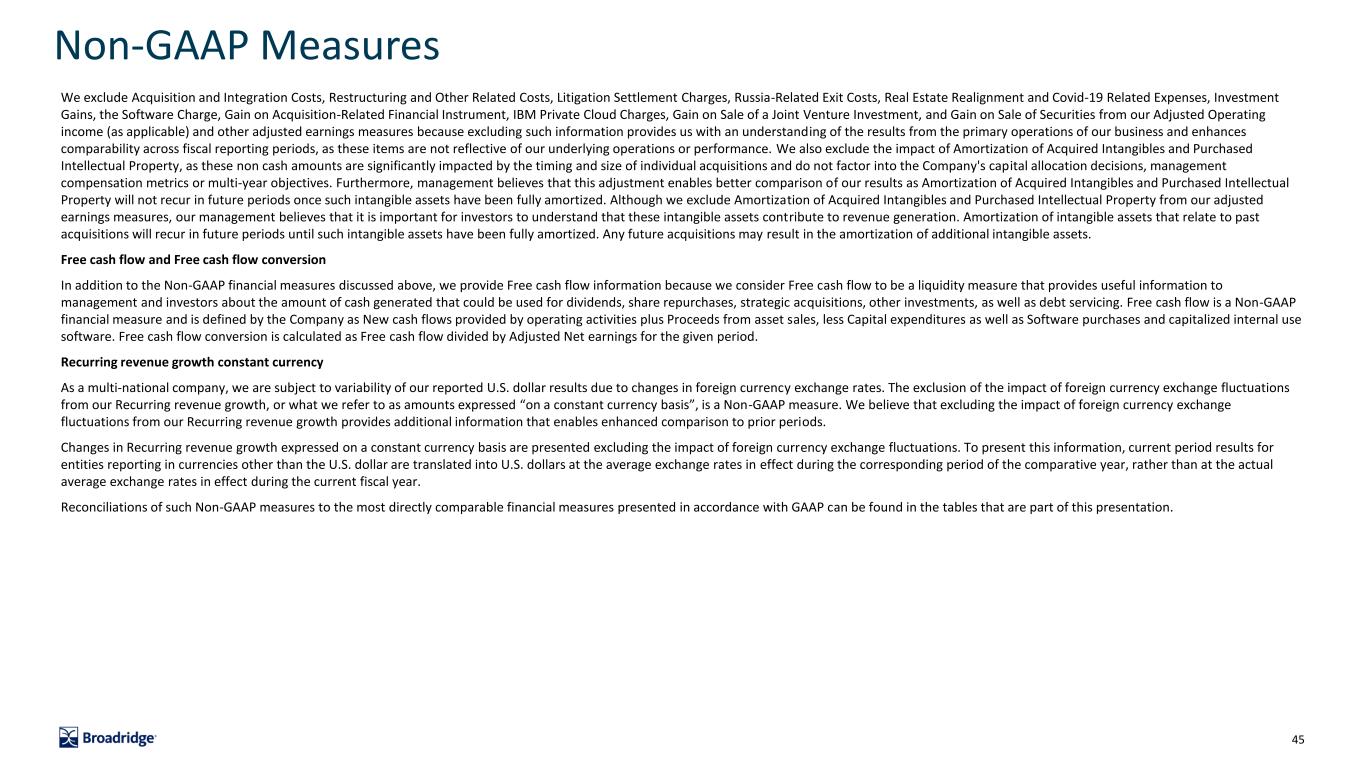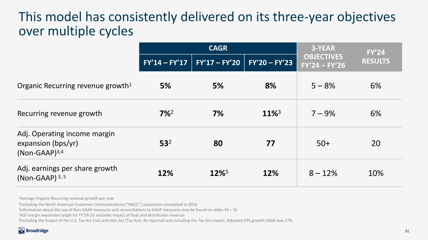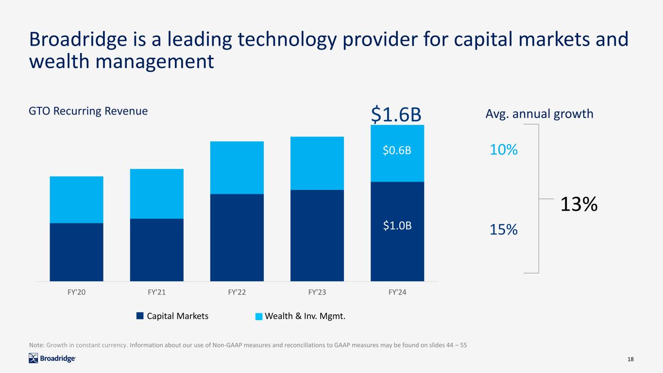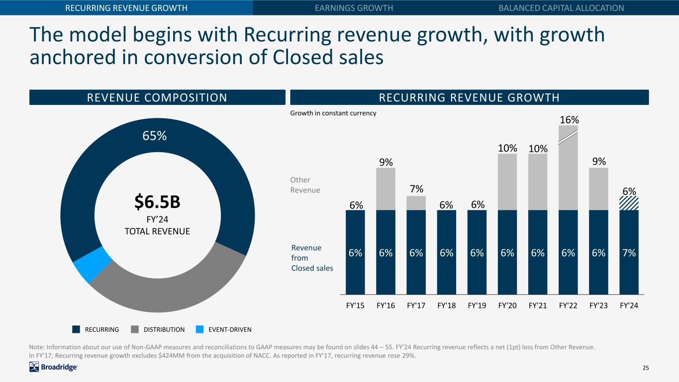 3 Use of Non-GAAP financial Measures, KPIs and foreign exchange rates Use of Non-GAAP Financial Measures This presentation includes certain Non-GAAP financial measures including Adjusted Operating income, Adjusted Operating income margin, Adjusted Net earnings, Adjusted earnings per share (“EPS”), Free cash flow, Free cash flow conversion, and Recurring revenue growth constant currency. Please see the “Explanation of Non-GAAP Measures and Reconciliation of GAAP to Non-GAAP Measures” section of this presentation for more information on Broadridge’s use of Non-GAAP measures and reconciliations to GAAP measures. Key Performance Indicators Management focuses on a variety of key indicators to plan, measure and evaluate the Company’s business and financial performance. These performance indicators include Revenues and Recurring revenue, as well as Non-GAAP measures of Adjusted Operating income, Adjusted Net earnings, Adjusted EPS, Free cash flow, Free cash flow conversion, Recurring revenue growth constant currency, and Closed sales. In addition, management focuses on select operating metrics specific to Broadridge of Record Growth, which is comprised of Stock Record Growth (also referred to as “SRG” or “equity position growth”) and Interim Record Growth (also referred to as “IRG” or “mutual fund/ETF position growth”), and Internal Trade Growth (“ITG”). Please refer to Item 2. Management’s Discussion and Analysis of Financial Condition of the 2024 Annual Report for a discussion of Revenues, Recurring revenue, Record Growth and Internal Trade Growth in the “Key Performance Indicators” section and the “Results of Operations” section for a description of Closed sales. Foreign Exchange Rates Beginning with the first quarter of fiscal year 2023, the Company changed reporting for segment revenues, segment earnings (loss) before income taxes, segment amortization of acquired intangibles and purchased intellectual property, and Closed sales to reflect the impact of actual foreign exchange rates applicable to the individual periods presented. The presentation of these metrics for the prior periods has been changed to conform to the current period presentation. Total consolidated revenues and earnings before income taxes were not impacted. Notes on Presentation Amounts presented in this presentation may not sum due to rounding. All FY’24 and FY’25 Recurring revenue dollar amounts shown in this presentation are GAAP. Recurring revenue growth percentages for FY’23, FY’24 and FY’25 Guidance are shown as constant currency (Non- GAAP). Recurring revenue growth percentages for FY’15 through FY’22 are calculated based on constant foreign currency exchange rates used for internal management reporting as described in the Company’s segment footnote within its Form 10-K for each respective year. Use of Material Contained Herein The information contained in this presentation is being provided for your convenience and information only. This information is accurate as of the date of its initial presentation. If you plan to use this information for any purpose, verification of its continued accuracy is your responsibility. Broadridge assumes no duty to update or revise the information contained in this presentation.