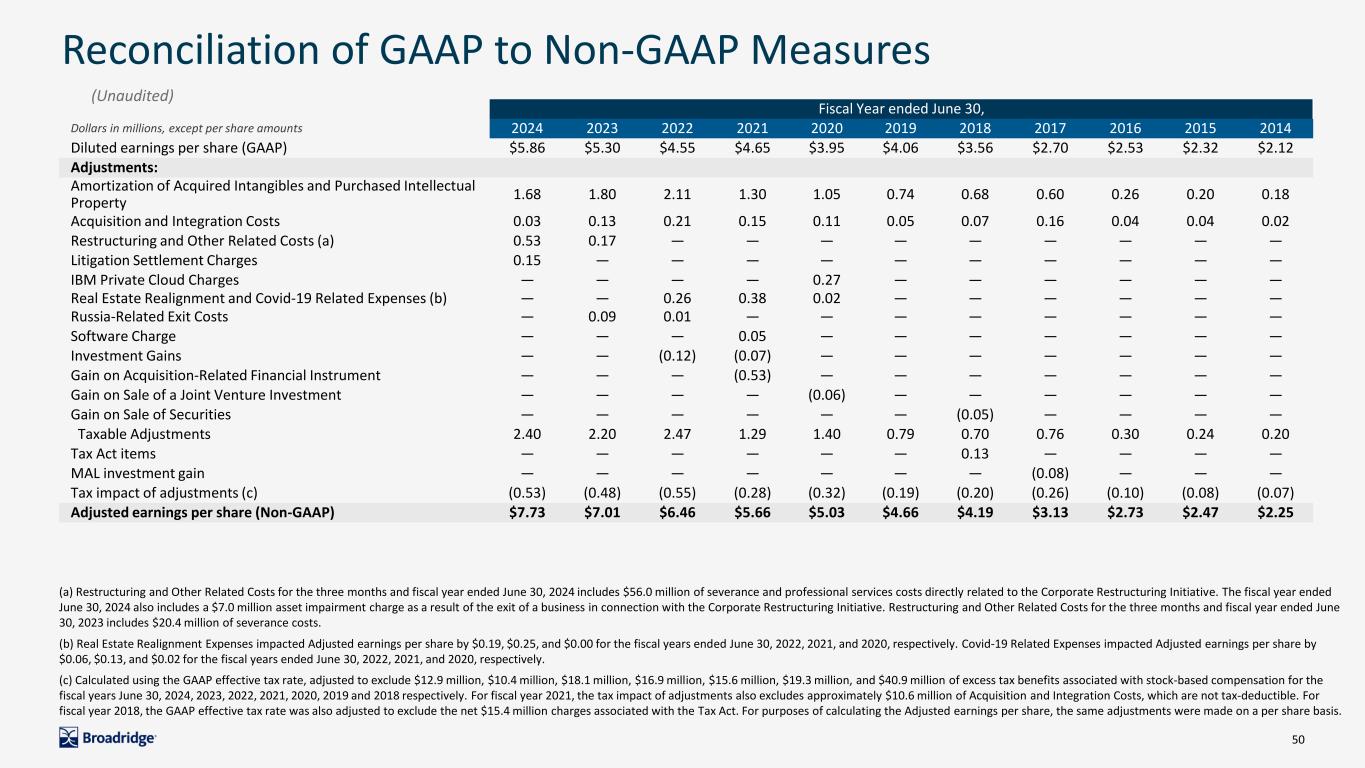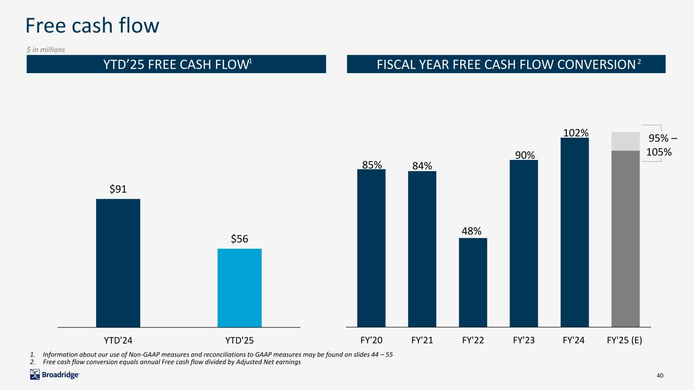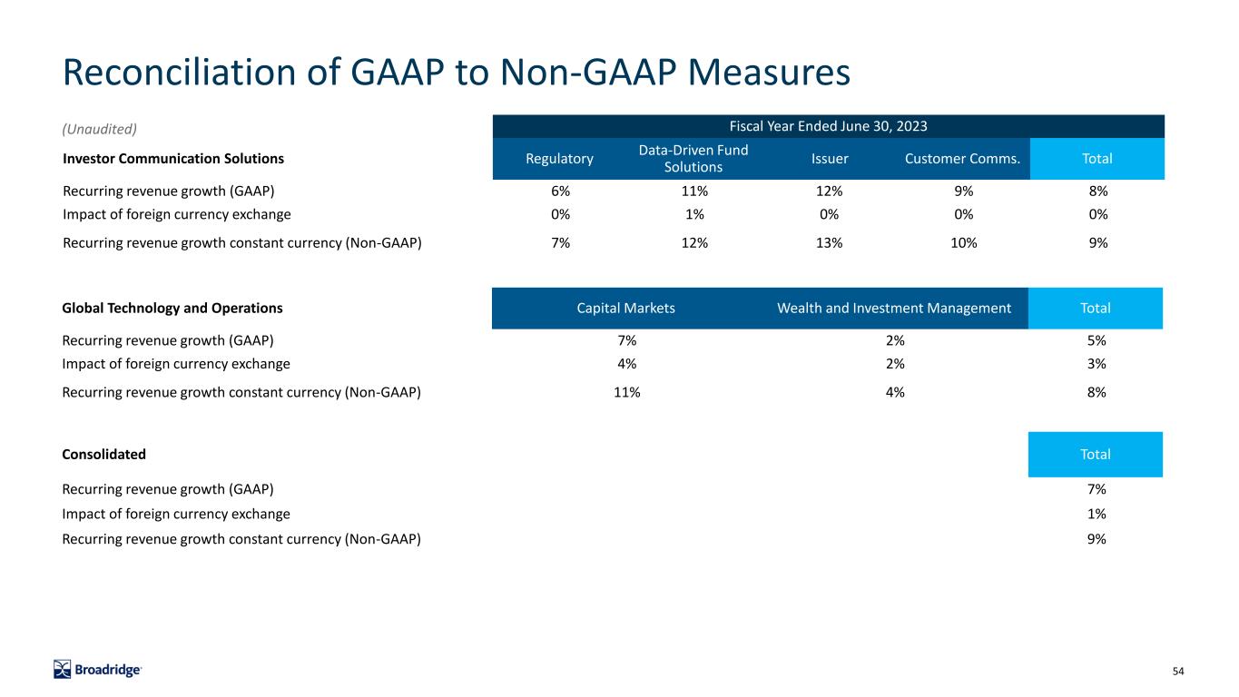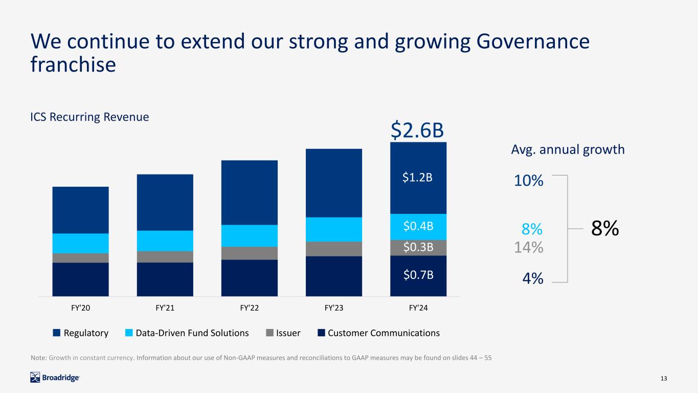 3 Use of Non-GAAP financial Measures, KPIs and foreign exchange rates Use of Non-GAAP Financial Measures This presentation includes certain Non-GAAP financial measures including Adjusted Operating income, Adjusted Operating income margin, Adjusted Net earnings, Adjusted earnings per share (“EPS”), Free cash flow, Free cash flow conversion, and Recurring revenue growth constant currency. Please see the “Explanation of Non-GAAP Measures and Reconciliation of GAAP to Non-GAAP Measures” section of this presentation for more information on Broadridge’s use of Non-GAAP measures and reconciliations to GAAP measures. Key Performance Indicators Management focuses on a variety of key indicators to plan, measure and evaluate the Company’s business and financial performance. These performance indicators include Revenues and Recurring revenue, as well as Non-GAAP measures of Adjusted Operating income, Adjusted Net earnings, Adjusted EPS, Free cash flow, Free cash flow conversion, Recurring revenue growth constant currency, and Closed sales. In addition, management focuses on select operating metrics specific to Broadridge of Record Growth, which is comprised of Stock Record Growth (also referred to as “SRG” or “equity position growth”) and Interim Record Growth (also referred to as “IRG” or “mutual fund/ETF position growth”), and Internal Trade Growth (“ITG”). Please refer to Item 2. Management’s Discussion and Analysis of Financial Condition of the 2024 Annual Report for a discussion of Revenues, Recurring revenue, Record Growth and Internal Trade Growth in the “Key Performance Indicators” section and the “Results of Operations” section for a description of Closed sales. Foreign Exchange Rates Beginning with the first quarter of fiscal year 2023, the Company changed reporting for segment revenues, segment earnings (loss) before income taxes, segment amortization of acquired intangibles and purchased intellectual property, and Closed sales to reflect the impact of actual foreign exchange rates applicable to the individual periods presented. The presentation of these metrics for the prior periods has been changed to conform to the current period presentation. Total consolidated revenues and earnings before income taxes were not impacted. Notes on Presentation Amounts presented in this presentation may not sum due to rounding. All FY’24 and FY’25 Recurring revenue dollar amounts shown in this presentation are GAAP. Recurring revenue growth percentages for FY’23, FY’24 and FY’25 Guidance are shown as constant currency (Non- GAAP). Recurring revenue growth percentages for FY’15 through FY’22 are calculated based on constant foreign currency exchange rates used for internal management reporting as described in the Company’s segment footnote within its Form 10-K for each respective year. Use of Material Contained Herein The information contained in this presentation is being provided for your convenience and information only. This information is accurate as of the date of its initial presentation. If you plan to use this information for any purpose, verification of its continued accuracy is your responsibility. Broadridge assumes no duty to update or revise the information contained in this presentation.