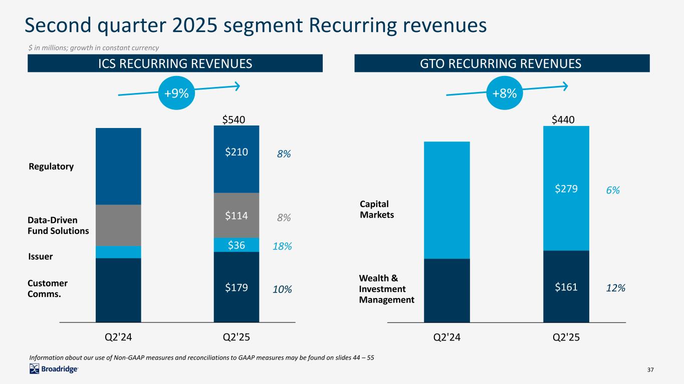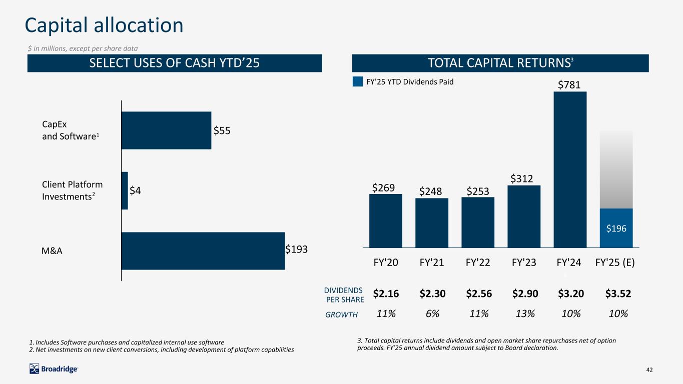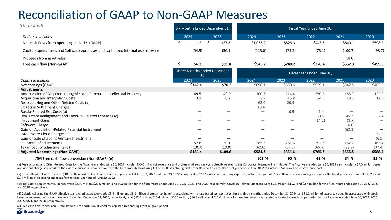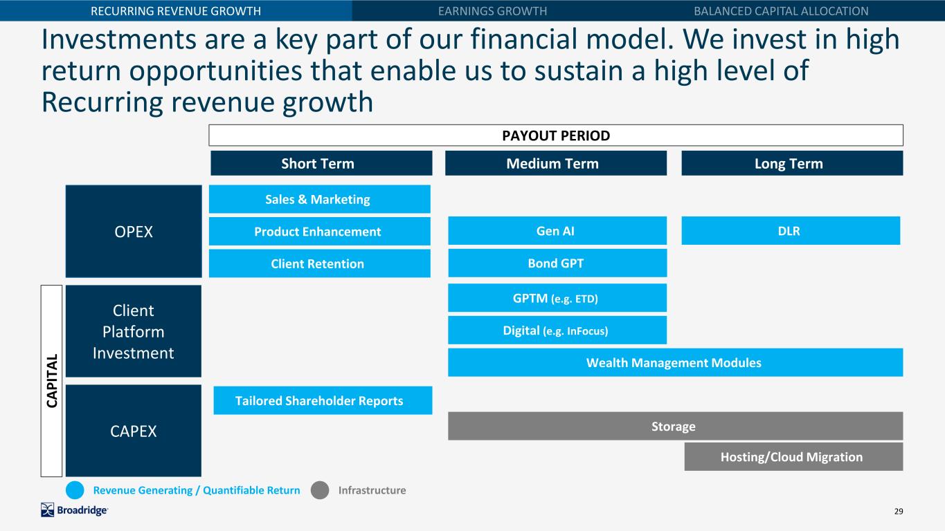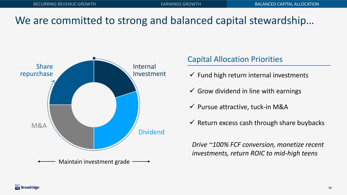 3 Use of Non-GAAP financial Measures, KPIs and foreign exchange rates Use of Non-GAAP Financial Measures This presentation includes certain Non-GAAP financial measures including Adjusted Operating income, Adjusted Operating income margin, Adjusted Net earnings, Adjusted earnings per share (“EPS”), Free cash flow, Free cash flow conversion, and Recurring revenue growth constant currency. Please see the “Explanation of Non-GAAP Measures and Reconciliation of GAAP to Non-GAAP Measures” section of this presentation for more information on Broadridge’s use of Non-GAAP measures and reconciliations to GAAP measures. Key Performance Indicators Management focuses on a variety of key indicators to plan, measure and evaluate the Company’s business and financial performance. These performance indicators include Revenues and Recurring revenue, as well as Non-GAAP measures of Adjusted Operating income, Adjusted Net earnings, Adjusted EPS, Free cash flow, Free cash flow conversion, Recurring revenue growth constant currency, and Closed sales. In addition, management focuses on select operating metrics specific to Broadridge of Record Growth, which is comprised of Stock Record Growth (also referred to as “SRG” or “equity position growth”) and Interim Record Growth (also referred to as “IRG” or “mutual fund/ETF position growth”), and Internal Trade Growth (“ITG”). Please refer to Item 2. Management’s Discussion and Analysis of Financial Condition of the 2024 Annual Report for a discussion of Revenues, Recurring revenue, Record Growth and Internal Trade Growth in the “Key Performance Indicators” section and the “Results of Operations” section for a description of Closed sales. Foreign Exchange Rates Beginning with the first quarter of fiscal year 2023, the Company changed reporting for segment revenues, segment earnings (loss) before income taxes, segment amortization of acquired intangibles and purchased intellectual property, and Closed sales to reflect the impact of actual foreign exchange rates applicable to the individual periods presented. The presentation of these metrics for the prior periods has been changed to conform to the current period presentation. Total consolidated revenues and earnings before income taxes were not impacted. Notes on Presentation Amounts presented in this presentation may not sum due to rounding. All FY’24 and FY’25 Recurring revenue dollar amounts shown in this presentation are GAAP. Recurring revenue growth percentages for FY’23, FY’24 and FY’25 Guidance are shown as constant currency (Non- GAAP). Recurring revenue growth percentages for FY’15 through FY’22 are calculated based on constant foreign currency exchange rates used for internal management reporting as described in the Company’s segment footnote within its Form 10-K for each respective year. Use of Material Contained Herein The information contained in this presentation is being provided for your convenience and information only. This information is accurate as of the date of its initial presentation. If you plan to use this information for any purpose, verification of its continued accuracy is your responsibility. Broadridge assumes no duty to update or revise the information contained in this presentation.