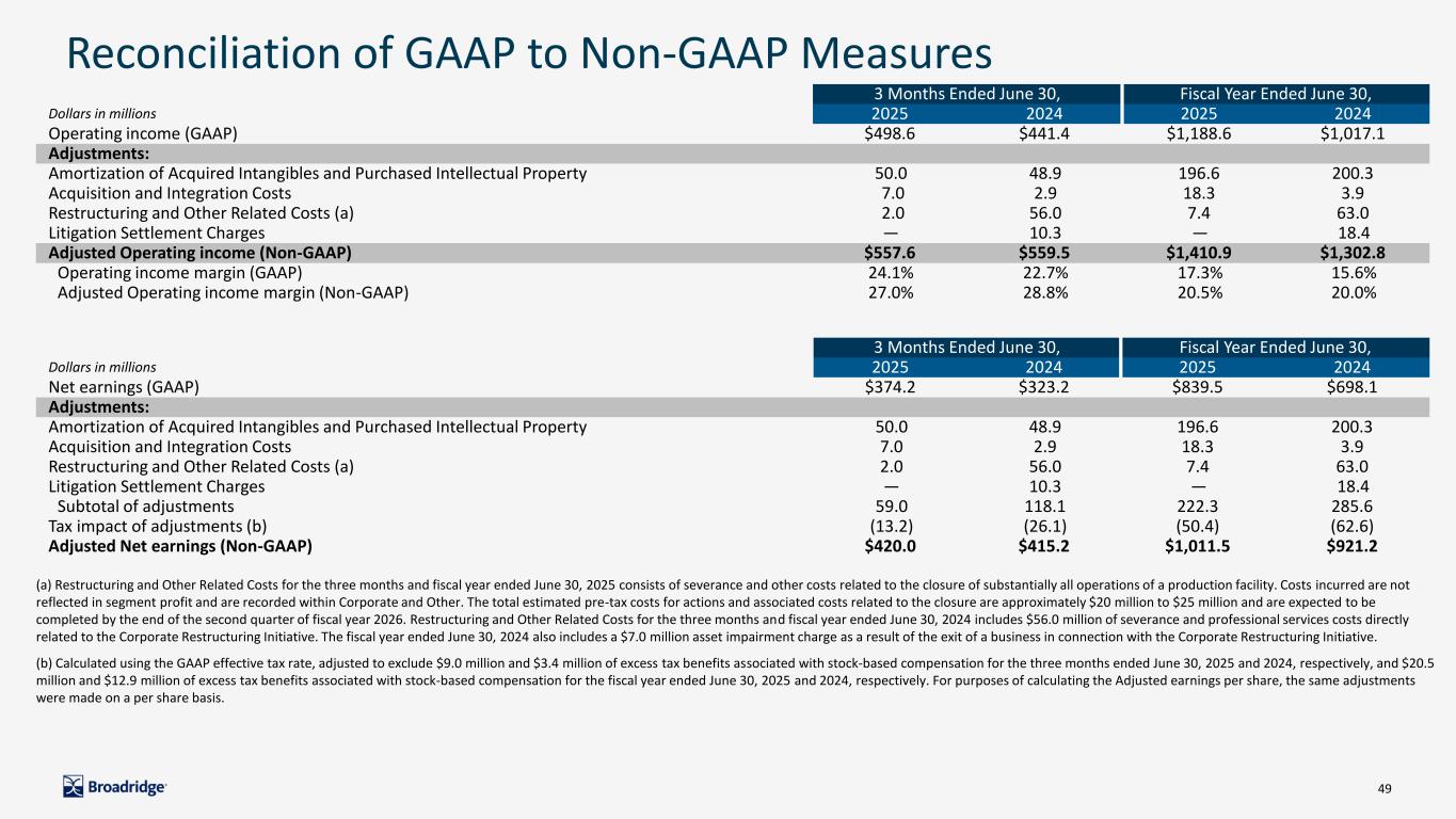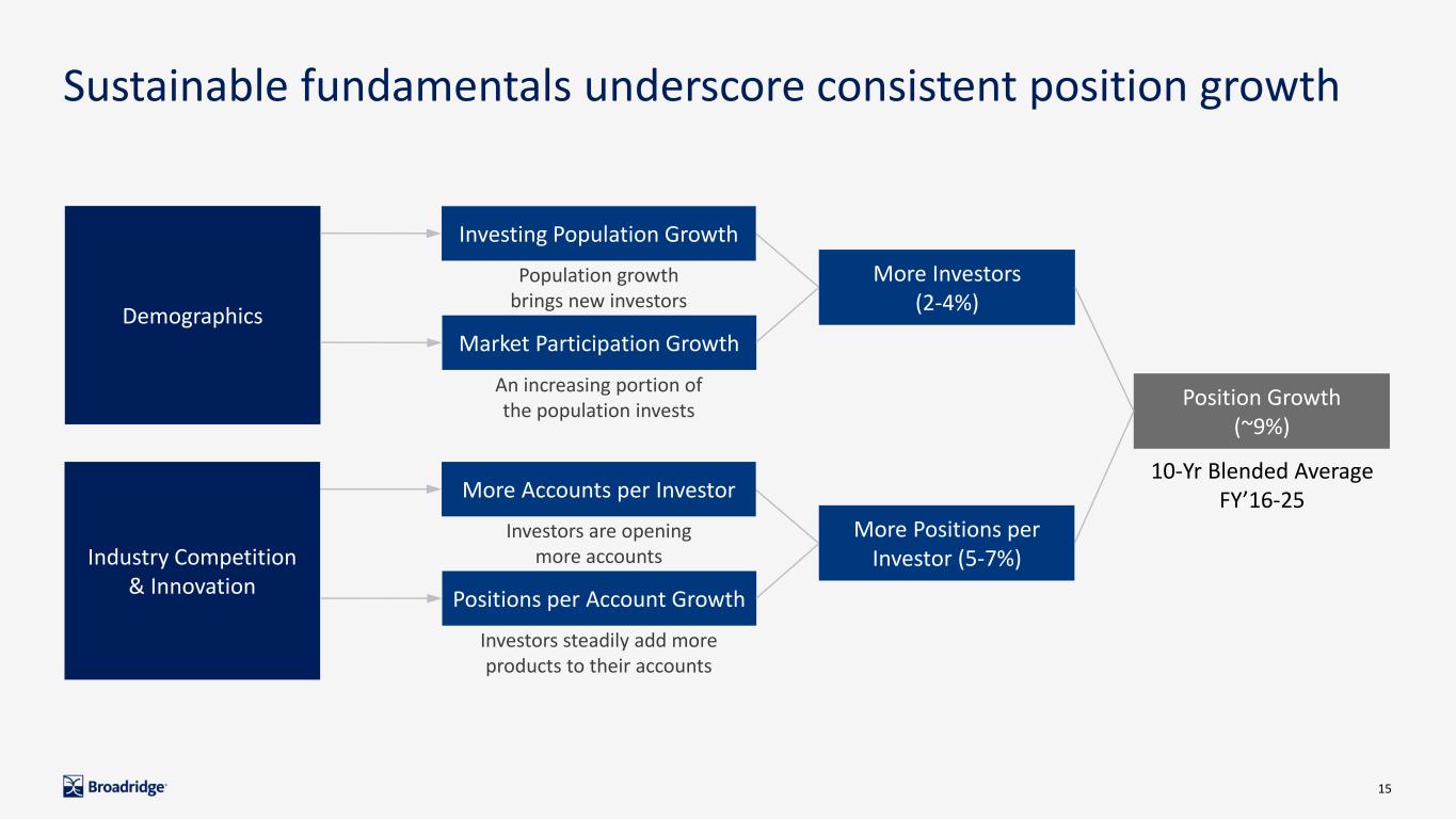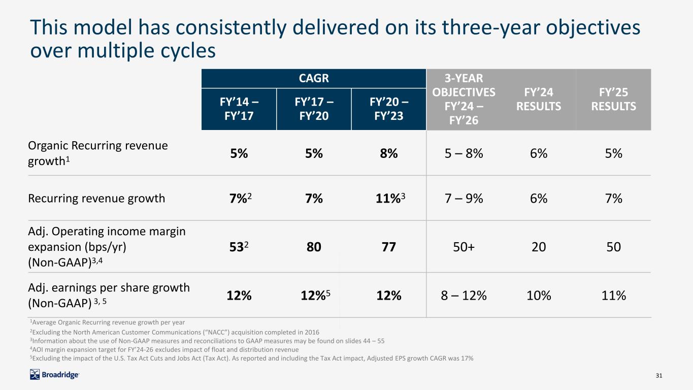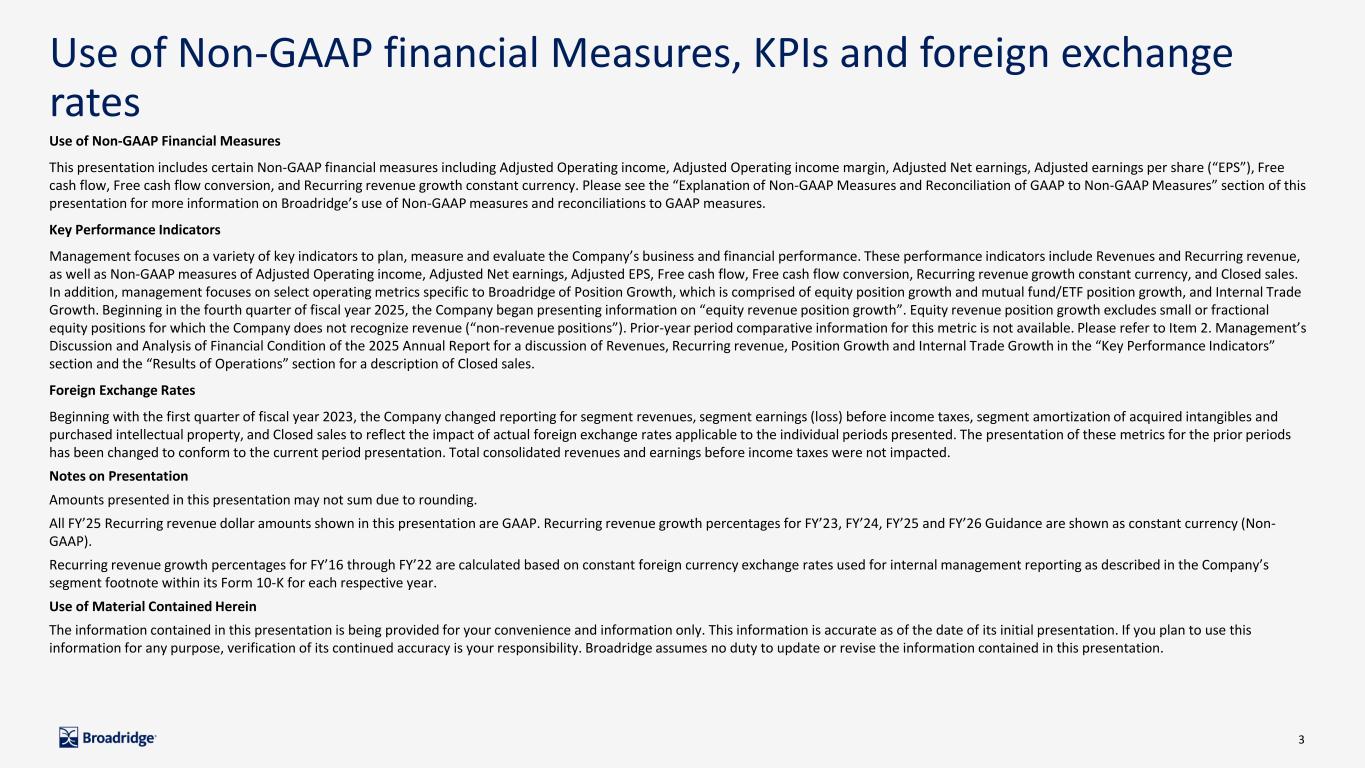 2 Forward-Looking Statements This presentation and other written or oral statements made from time to time by representatives of Broadridge Financial Solutions, Inc. ("Broadridge" or the "Company") contains “forward-looking statements” within the meaning of the Private Securities Litigation Reform Act of 1995. Statements that are not historical in nature, and which may be identified by the use of words such as “expects,” “assumes,” “projects,” “anticipates,” “estimates,” “we believe,” “could be,” “on track,” and other words of similar meaning are forward-looking statements. In particular, information appearing in the “Fiscal Year 2026 Guidance” section and statements about our three-year objectives are forward-looking statements. These statements are based on management’s expectations and assumptions and are subject to risks and uncertainties that may cause actual results to differ materially from those expressed. These risks and uncertainties include those risk factors described and discussed in Part I, “Item 1A. Risk Factors” of the Annual Report on Form 10-K for the year ended June 30, 2025 (the “2025 Annual Report”), as they may be updated in any future reports filed with the Securities and Exchange Commission. All forward-looking statements speak only as of the date of this presentation and are expressly qualified in their entirety by reference to the factors discussed in the 2025 Annual Report. These risks include: • Changes in laws and regulations affecting Broadridge’s clients or the services provided by Broadridge; • Broadridge’s reliance on a relatively small number of clients, the continued financial health of those clients, and the continued use by such clients of Broadridge’s services with favorable pricing terms; • A material security breach or cybersecurity attack affecting the information of Broadridge's clients; • Declines in participation and activity in the securities markets; • The failure of Broadridge's key service providers to provide the anticipated levels of service; • A disaster or other significant slowdown or failure of Broadridge’s systems or error in the performance of Broadridge’s services; • Overall market, economic and geopolitical conditions and their impact on the securities markets; • The success of Broadridge in retaining and selling additional services to its existing clients and in obtaining new clients; • Broadridge’s failure to keep pace with changes in technology and demands of its clients; • Competitive conditions; • Broadridge’s ability to attract and retain key personnel; and • The impact of new acquisitions and divestitures. There may be other factors that may cause our actual results to differ materially from the forward-looking statements. Our actual results, performance or achievements could differ materially from those expressed in, or implied by, the forward-looking statements. We can give no assurances that any of the events anticipated by the forward-looking statements will occur or, if any of them do, what impact they will have on our results of operations and financial condition. Broadridge disclaims any obligation to update or revise forward-looking statements that may be made to reflect events or circumstances that arise after the date made or to reflect the occurrence of unanticipated events, other than as required by law.
